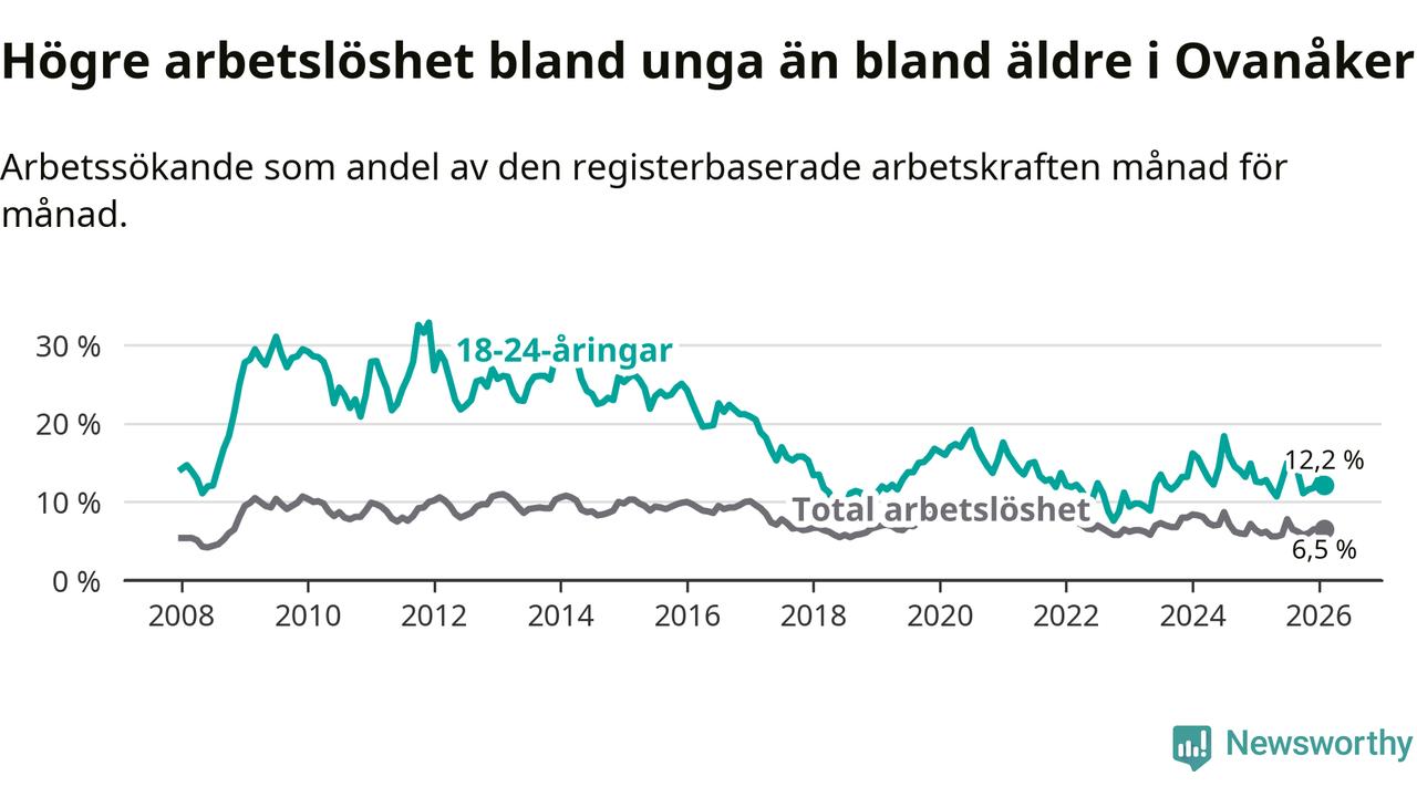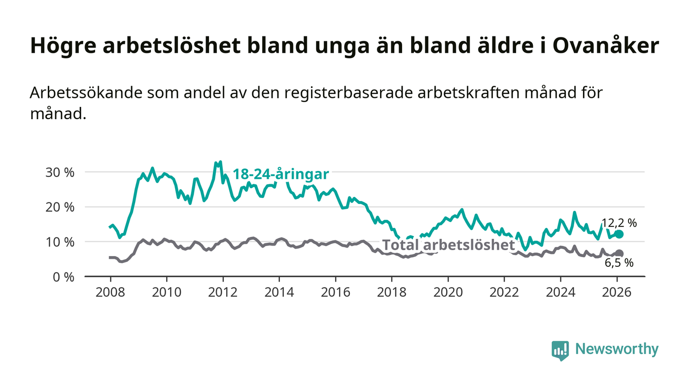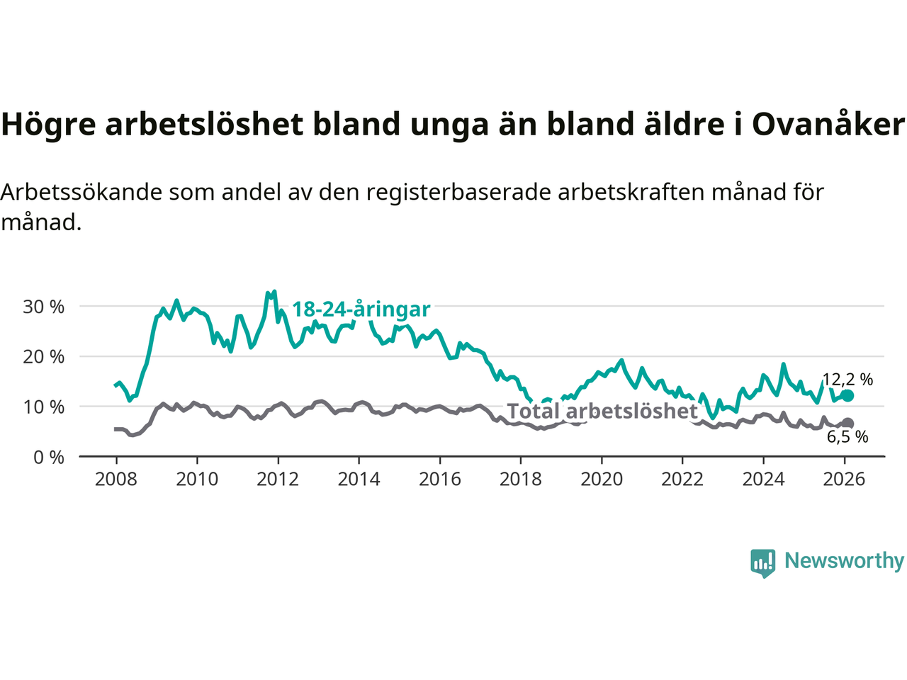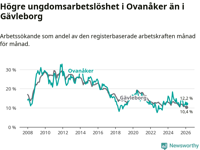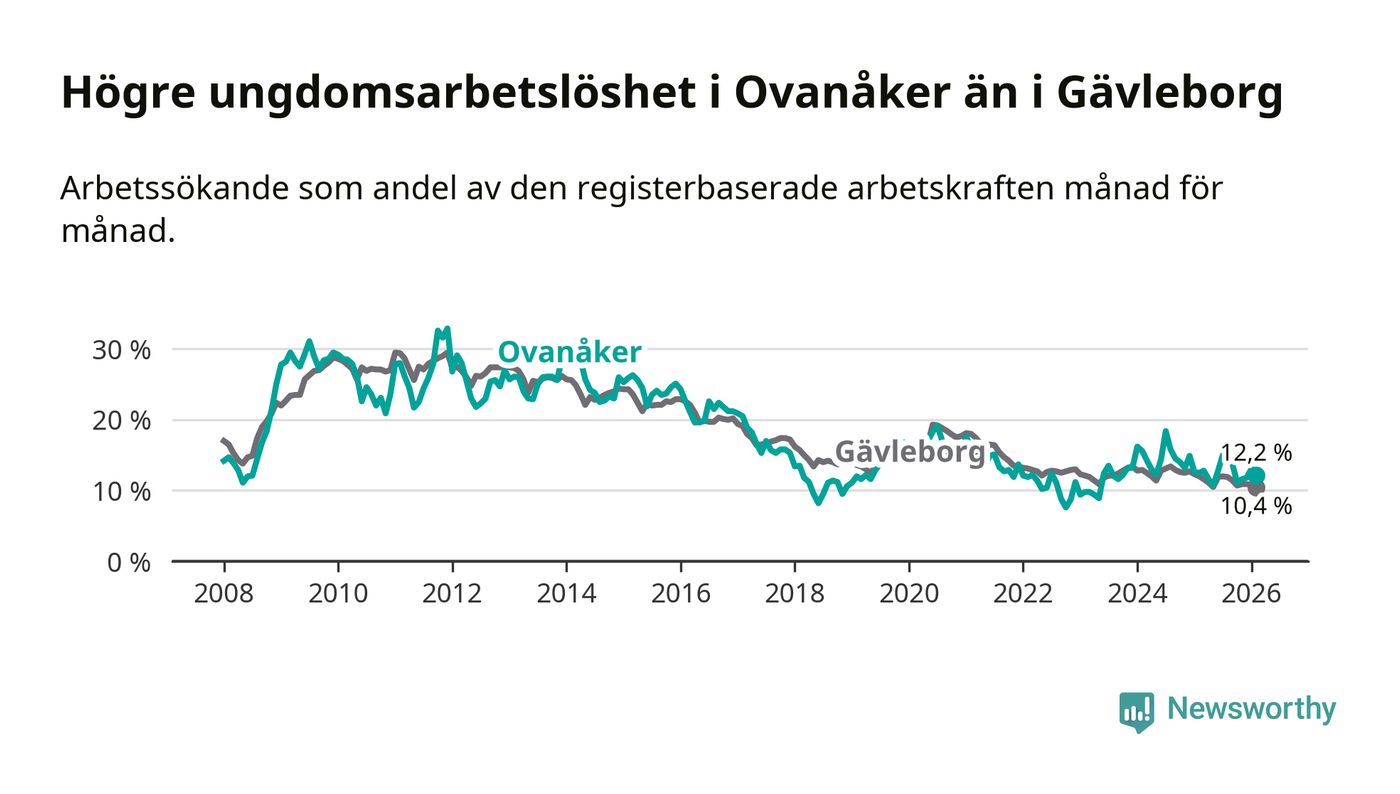 Medan Ovanåker har lägre total arbetslöshet än Gävleborg, ligger ungdomsarbetslösheten 1,8 procentenheter högre i Ovanåker.
