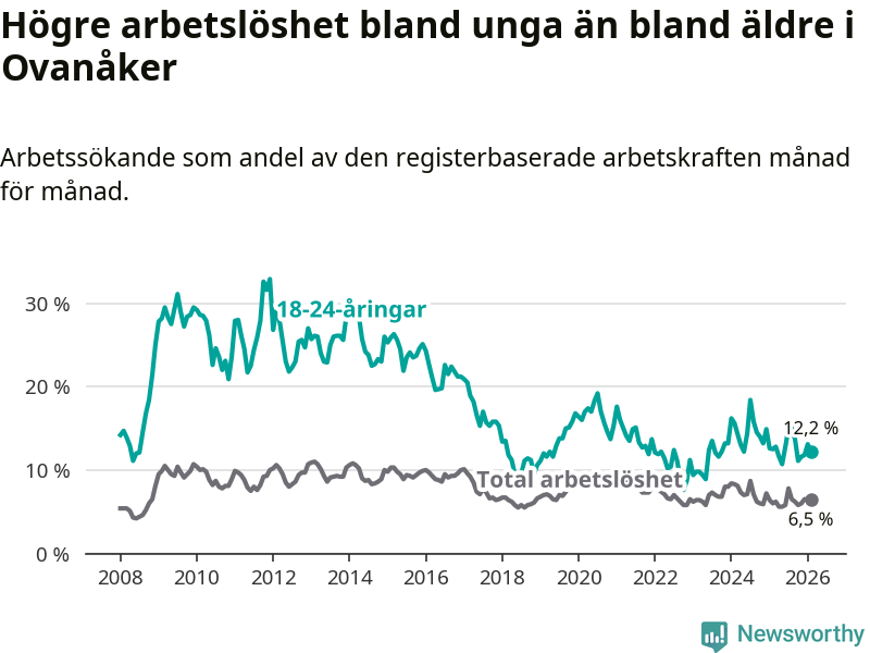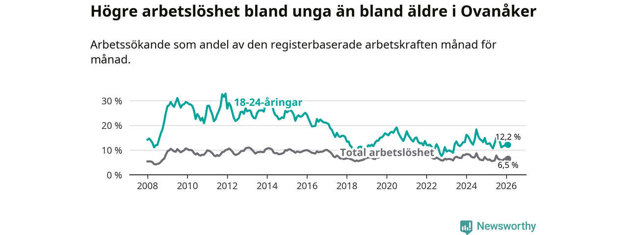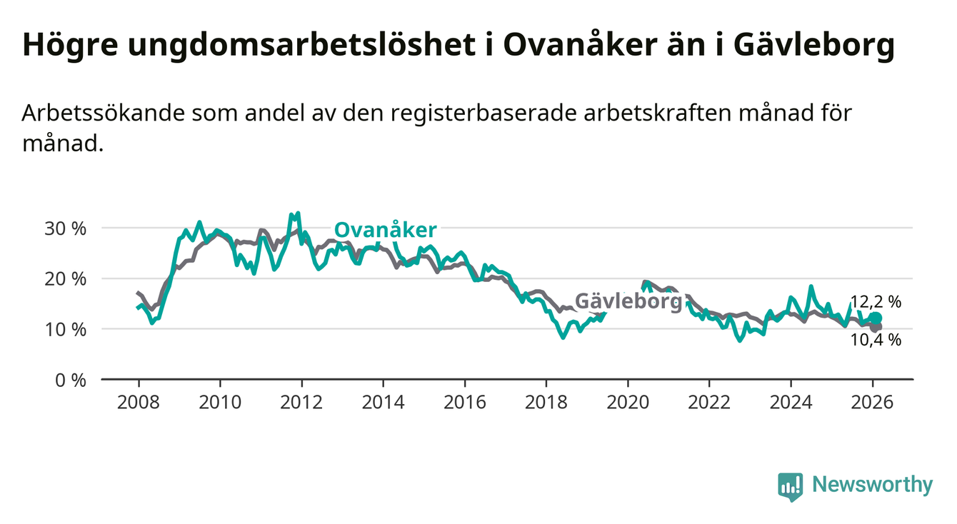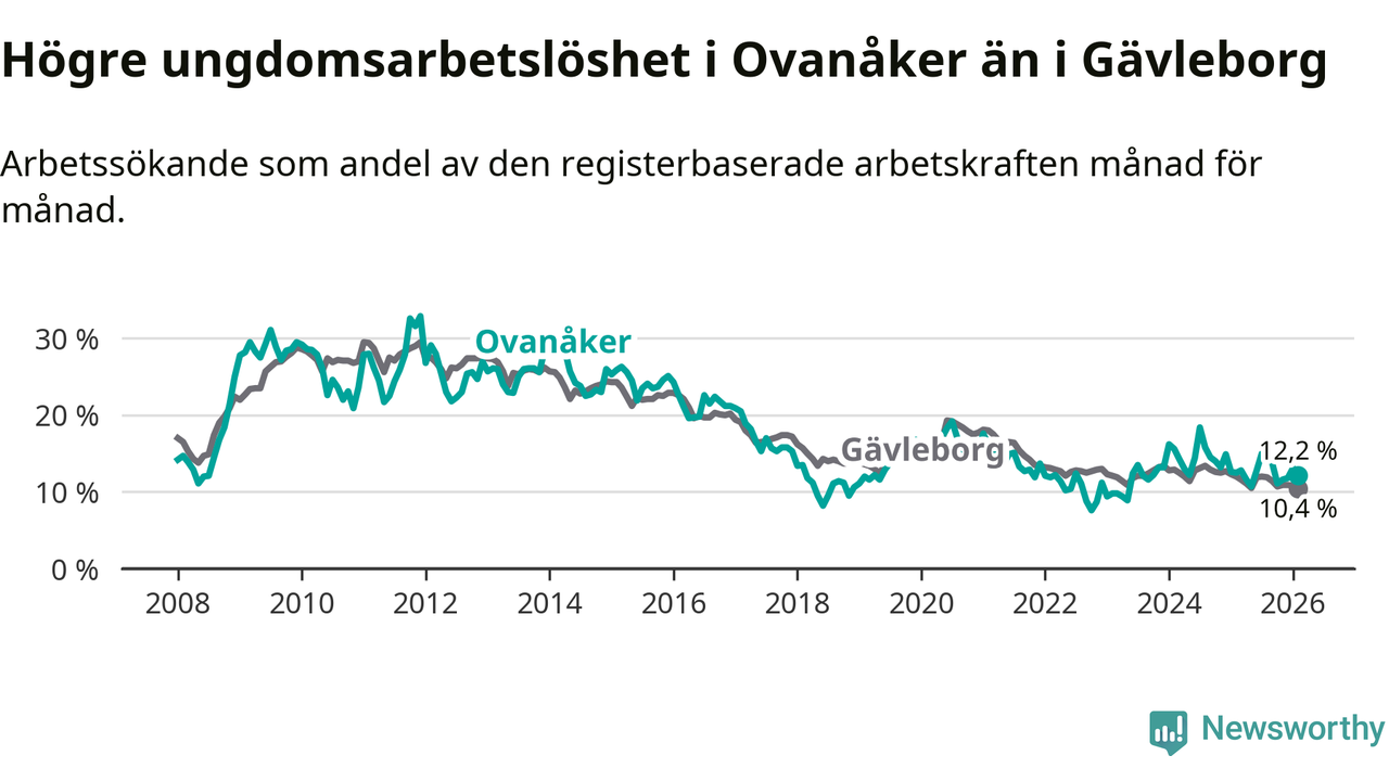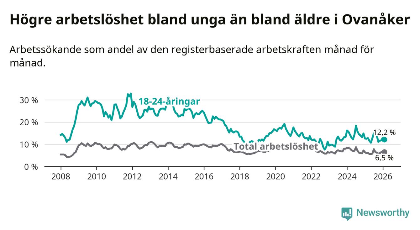 Medan Ovanåker har lägre total arbetslöshet än Gävleborg, ligger ungdomsarbetslösheten 1,8 procentenheter högre i Ovanåker.