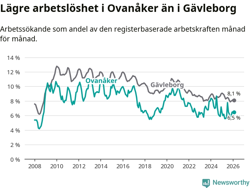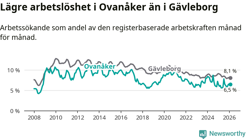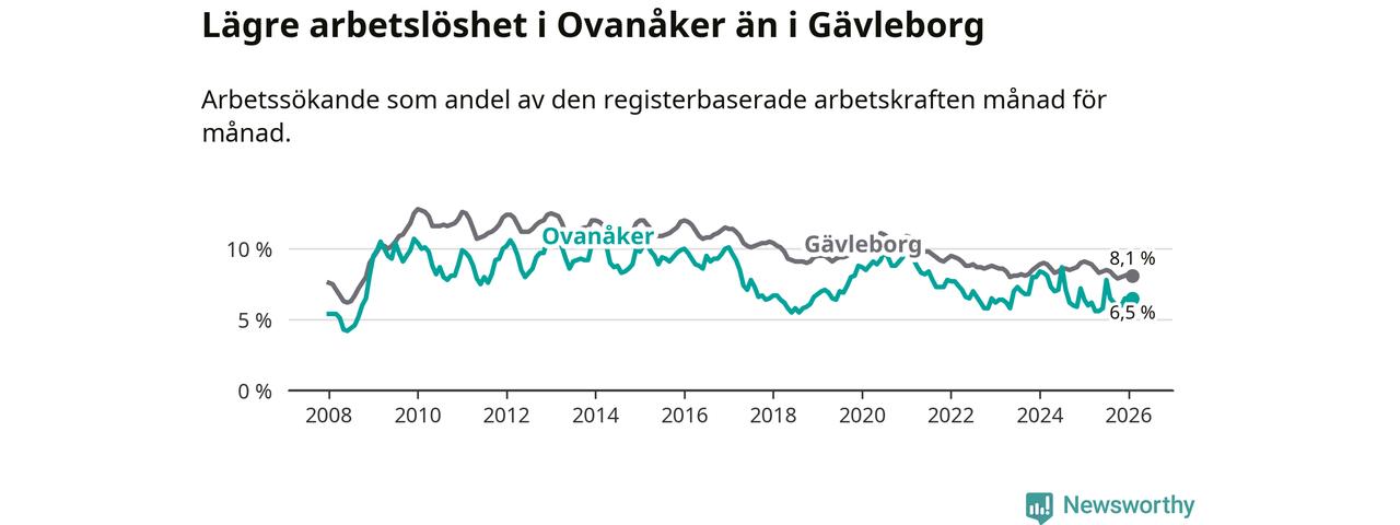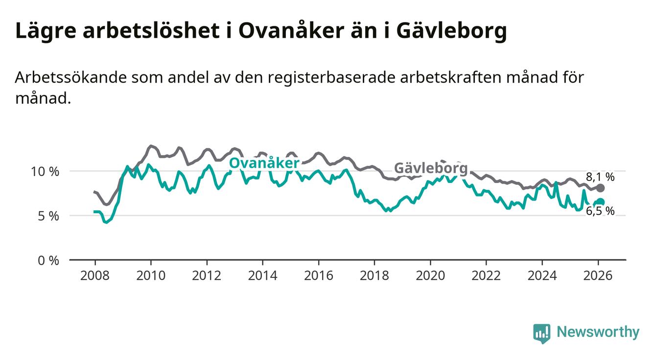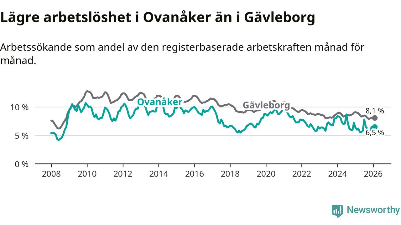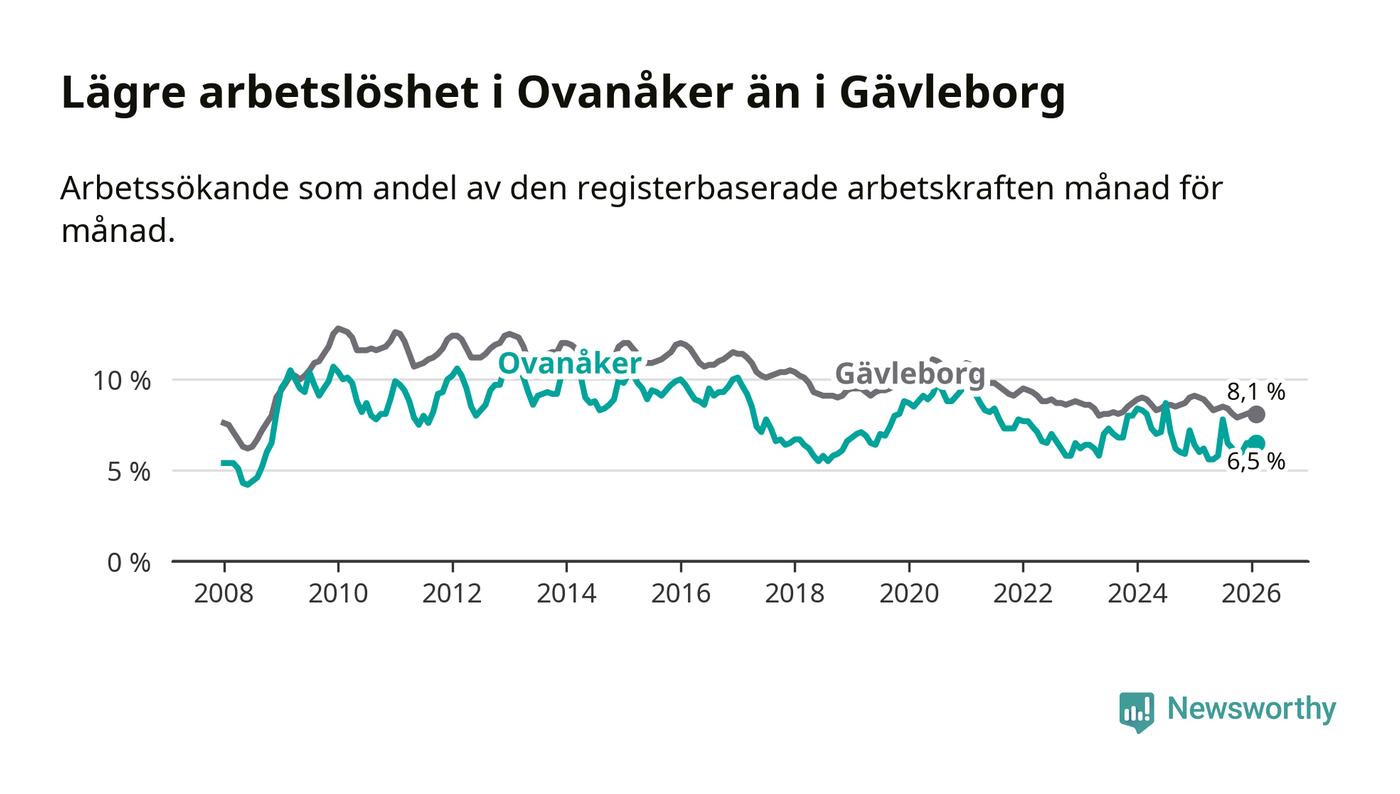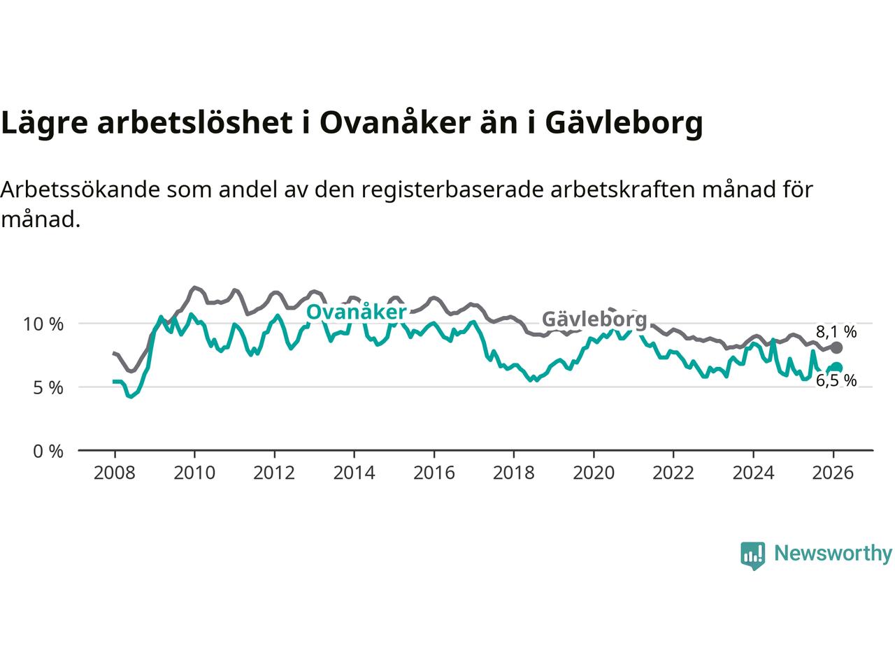 Under februari månad rapporterade Ovanåkers kommun en total arbetslöshet på 6,5 procent. Det är en ökning jämfört med samma tidpunkt i fjol (+0,5 procentenheter). I Gävleborgs län däremot sjunker arbetslösheten .