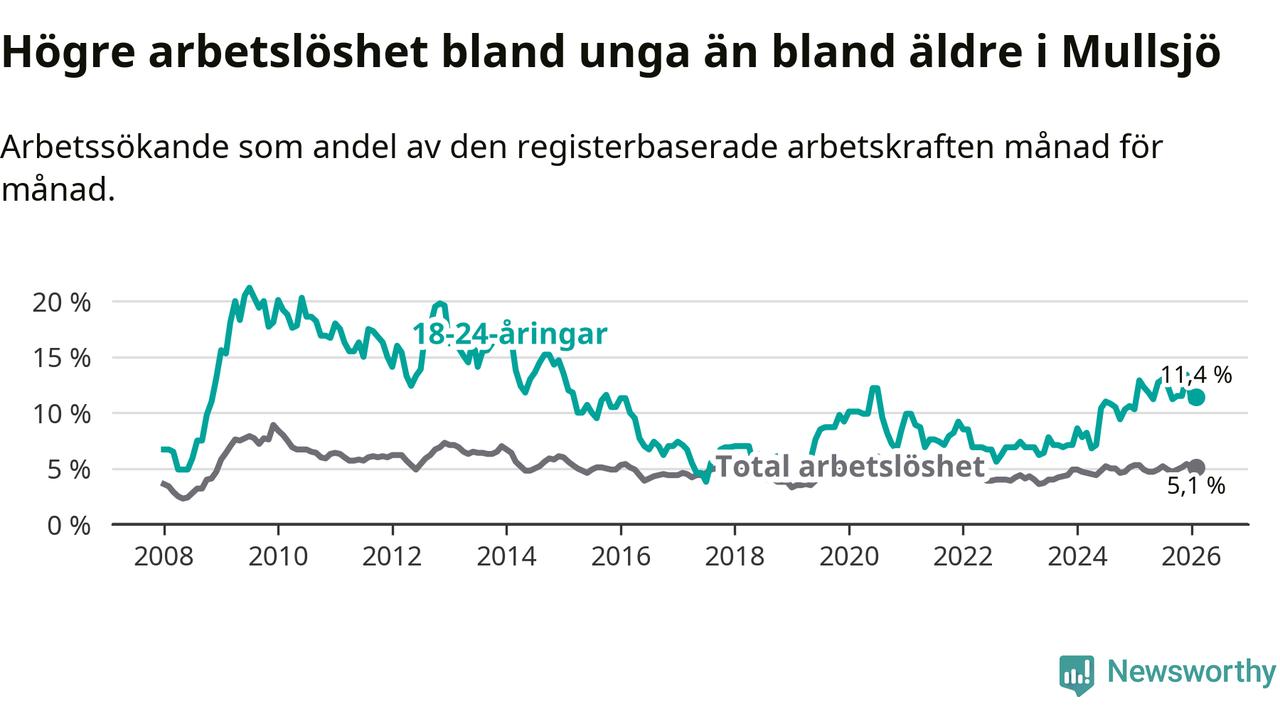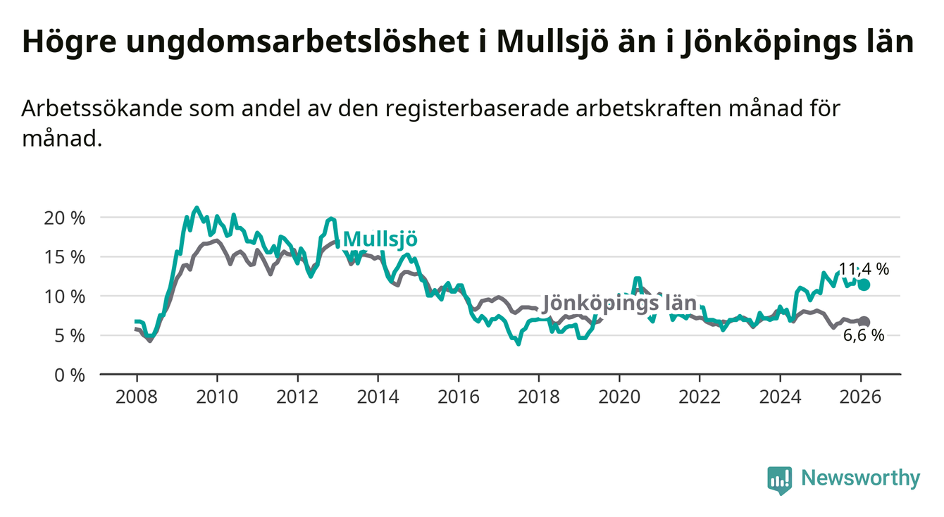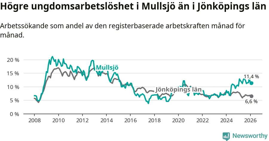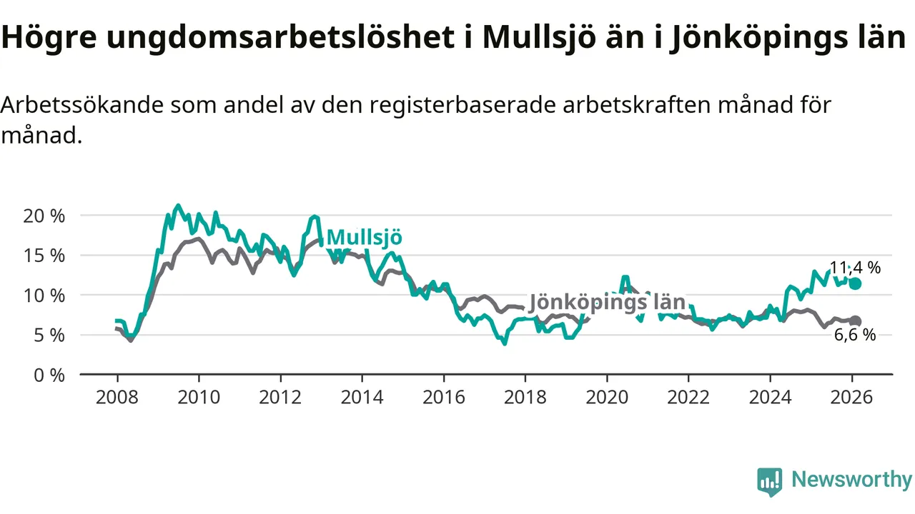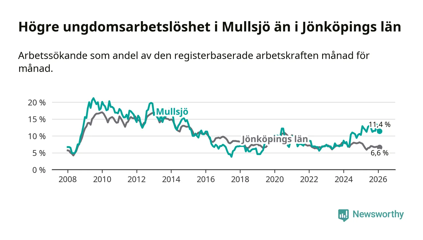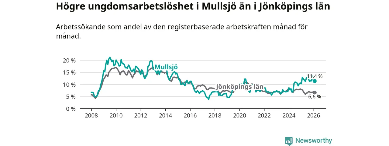 Medan Mullsjö har lägre total arbetslöshet än Jönköpings län, ligger ungdomsarbetslösheten 4,8 procentenheter högre i Mullsjö.