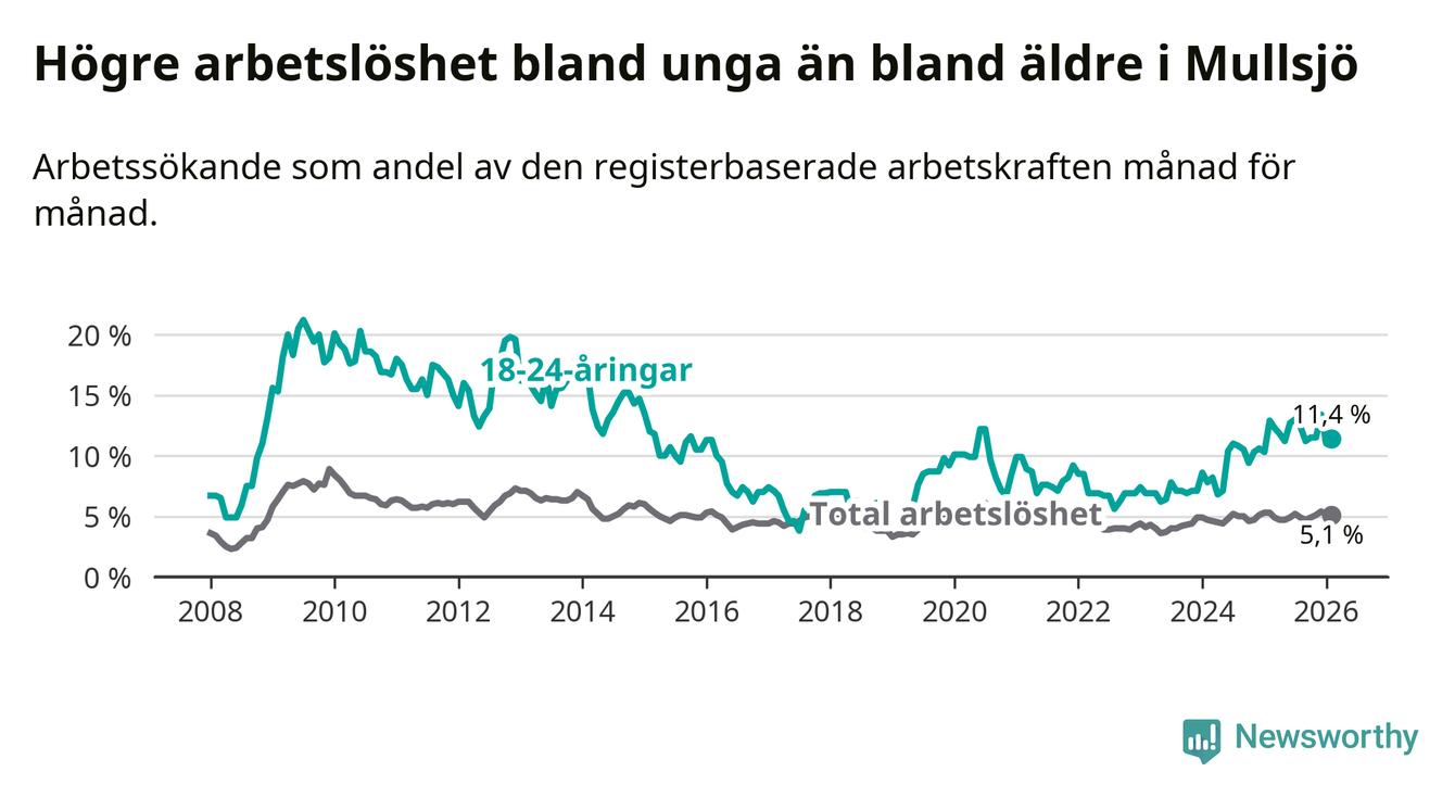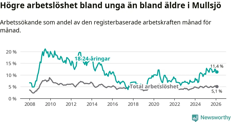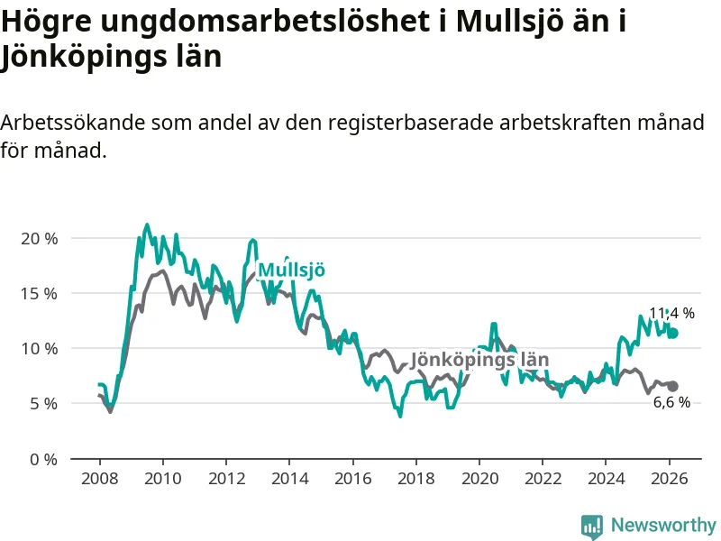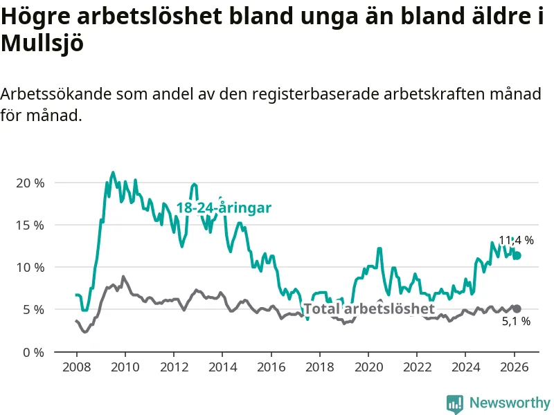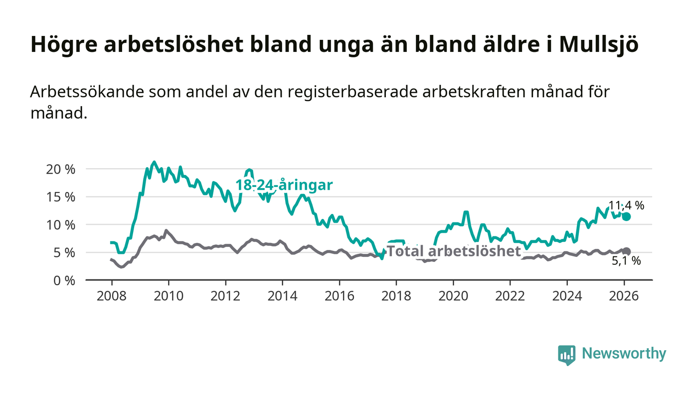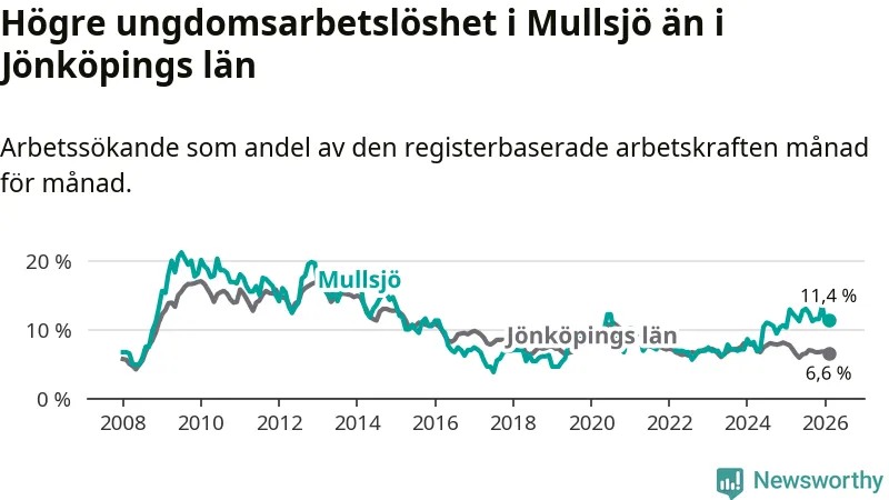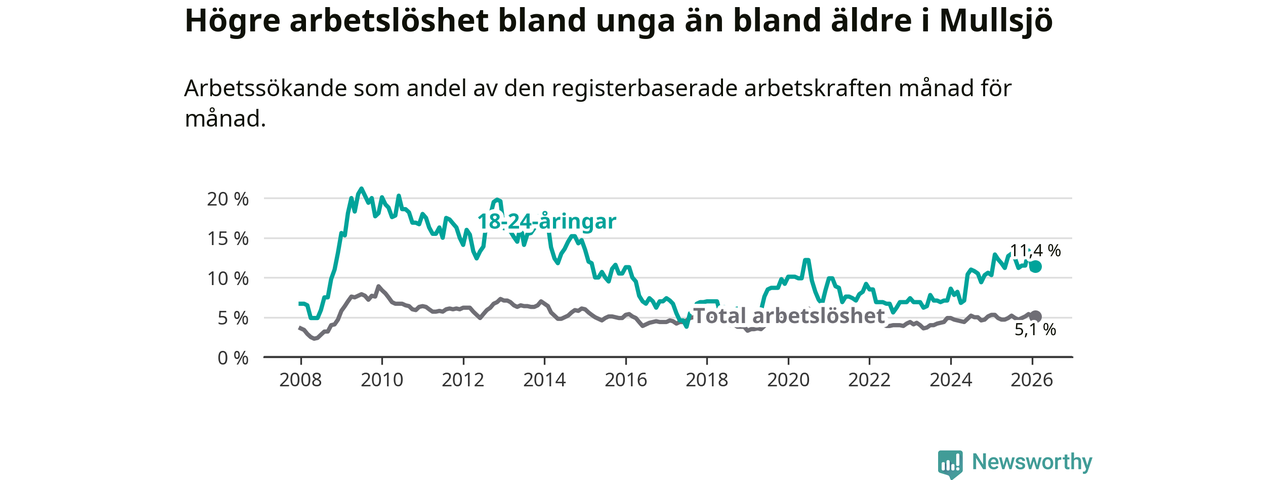 Medan Mullsjö har lägre total arbetslöshet än Jönköpings län, ligger ungdomsarbetslösheten 4,8 procentenheter högre i Mullsjö.