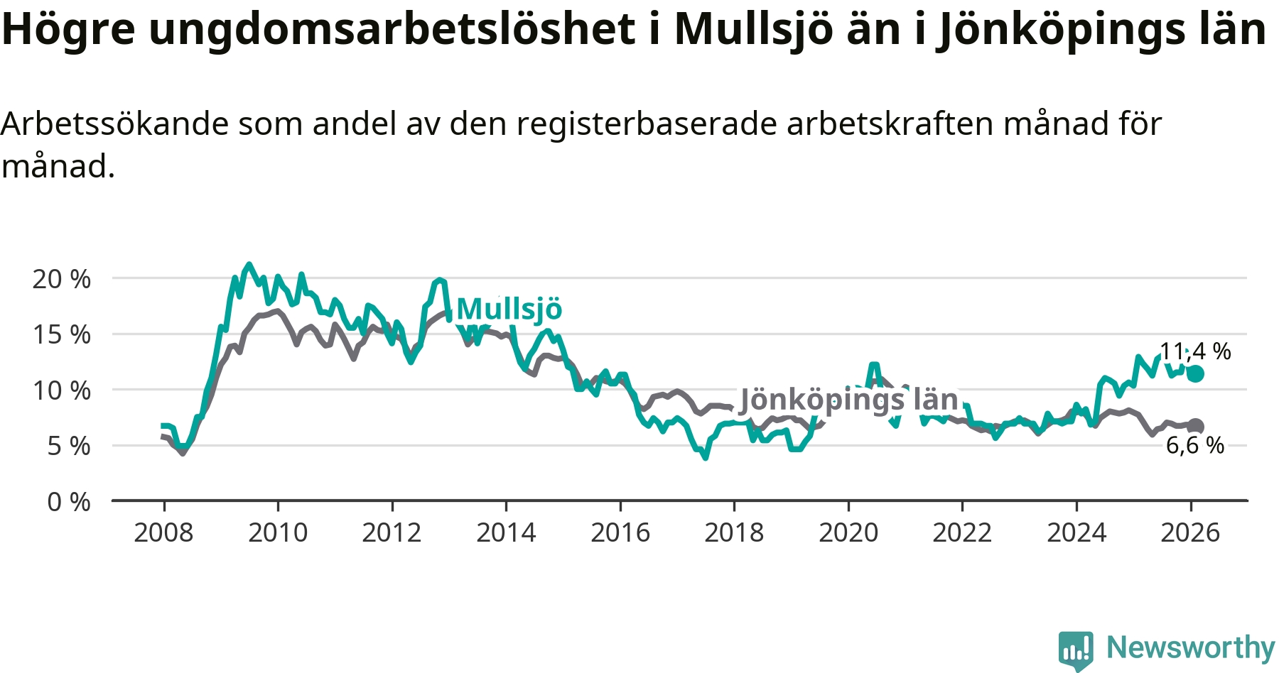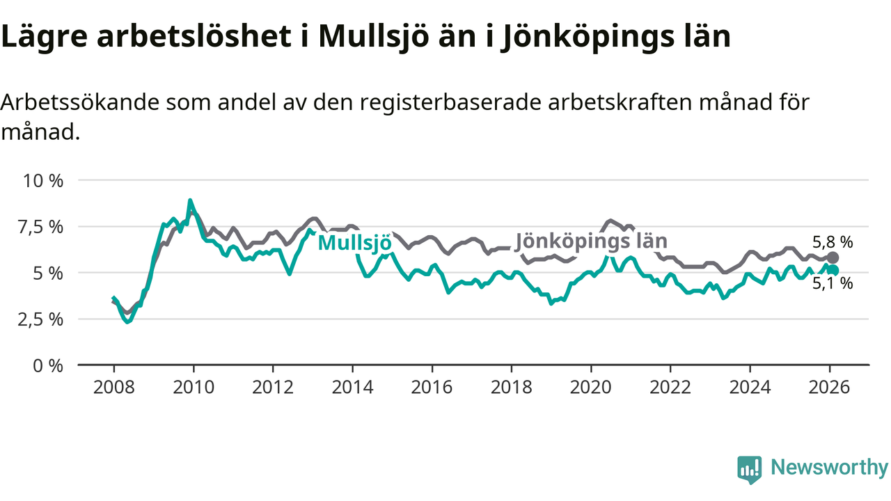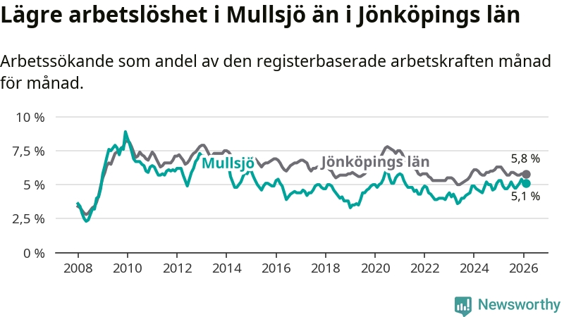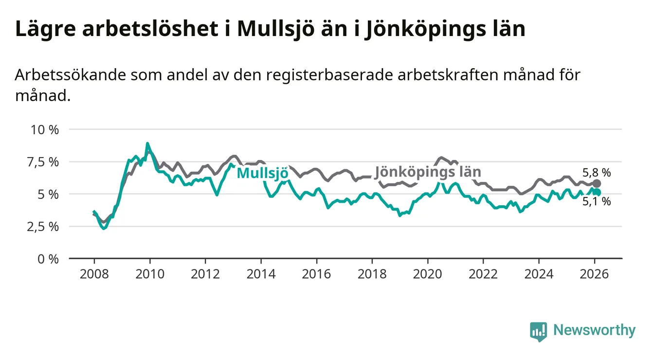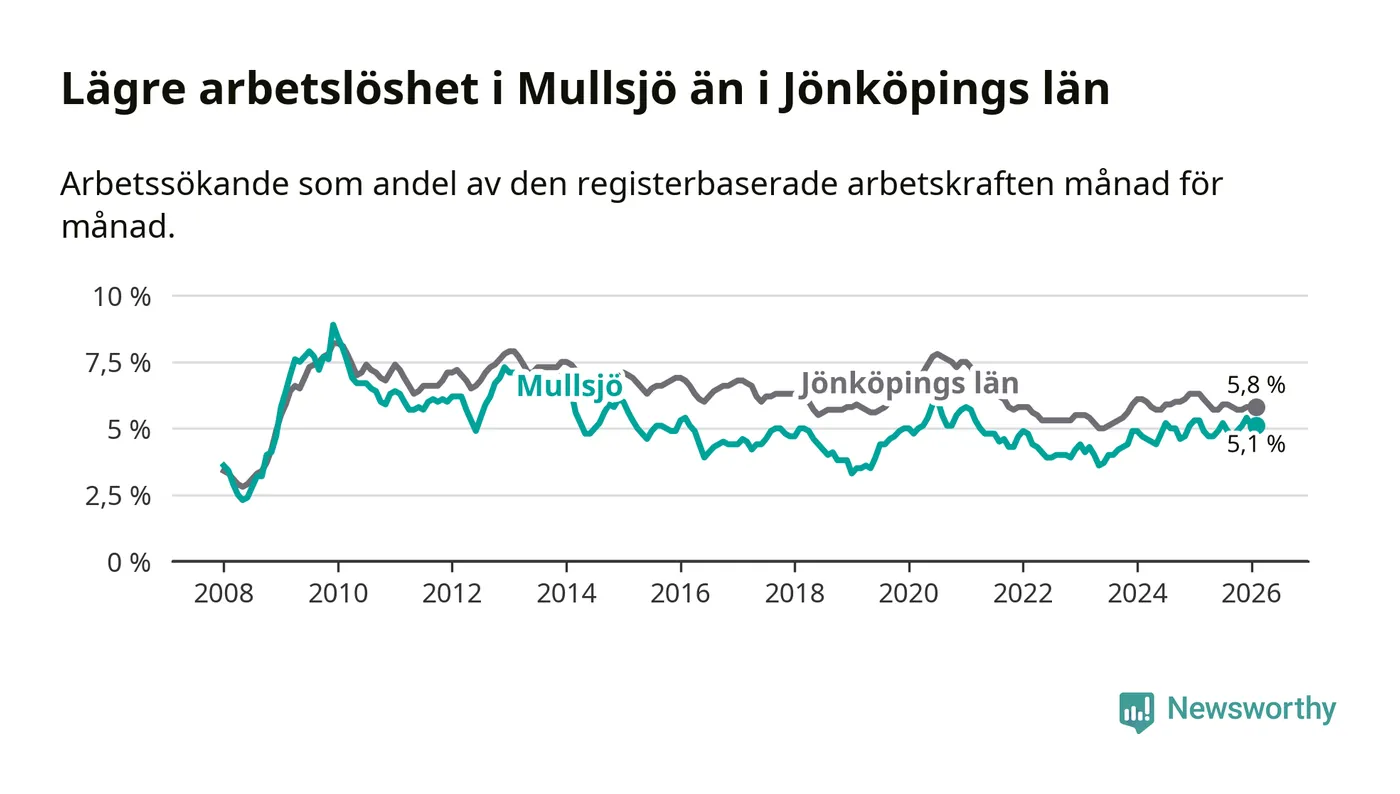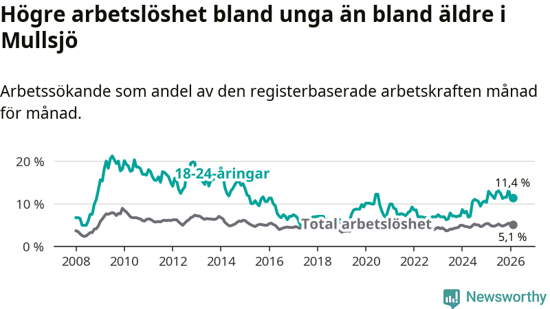 Medan Mullsjö har lägre total arbetslöshet än Jönköpings län, ligger ungdomsarbetslösheten 4,8 procentenheter högre i Mullsjö.
