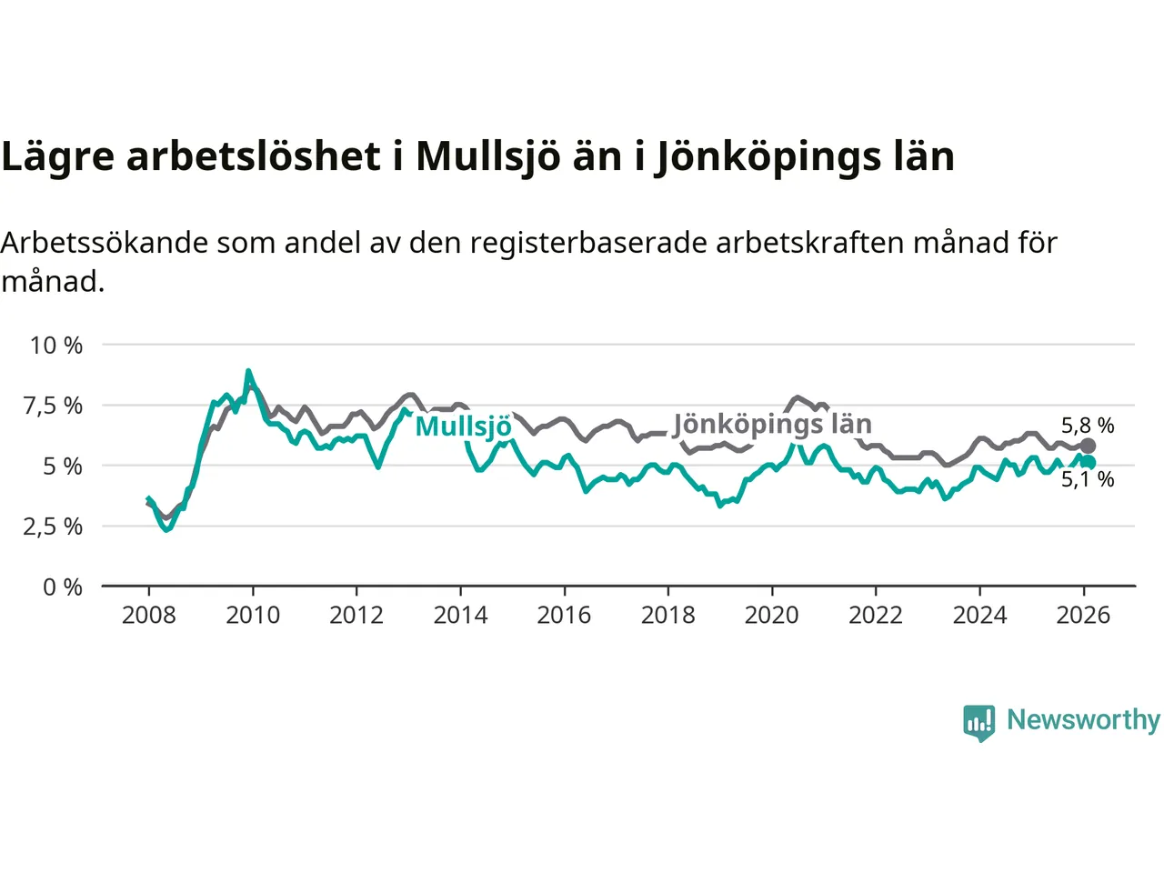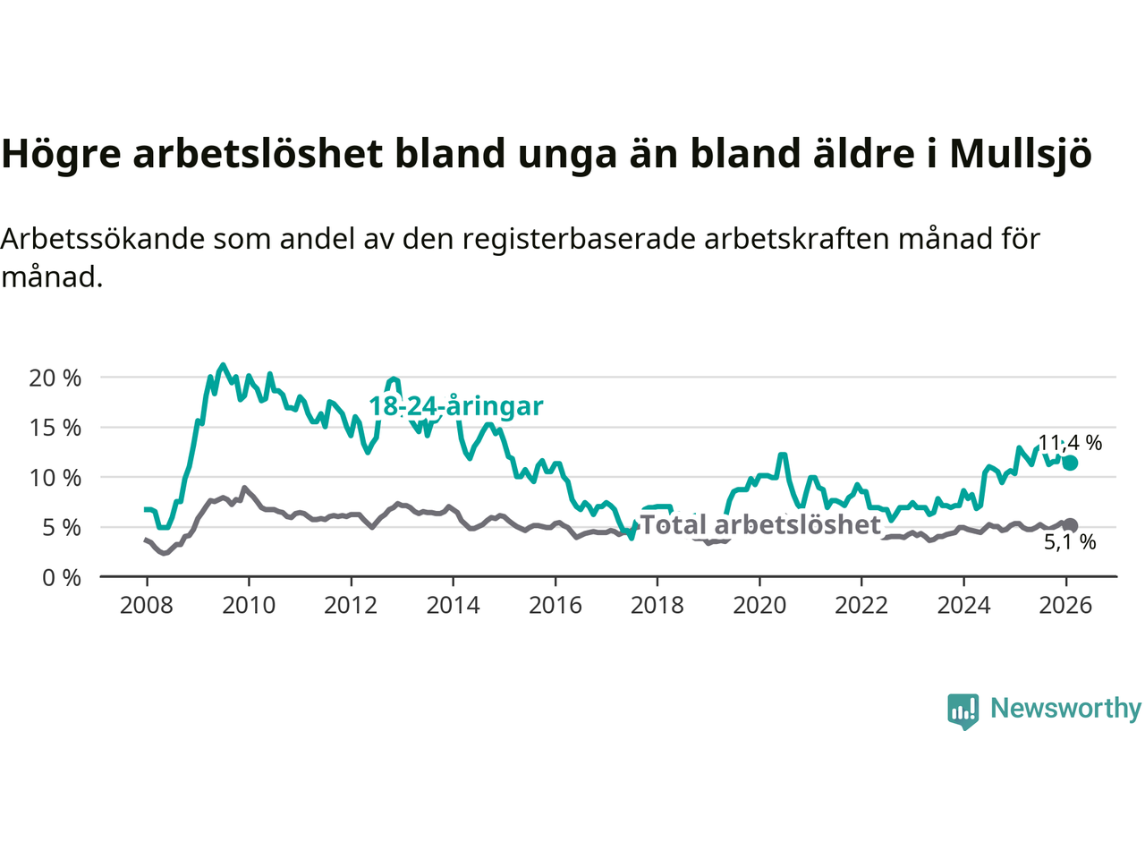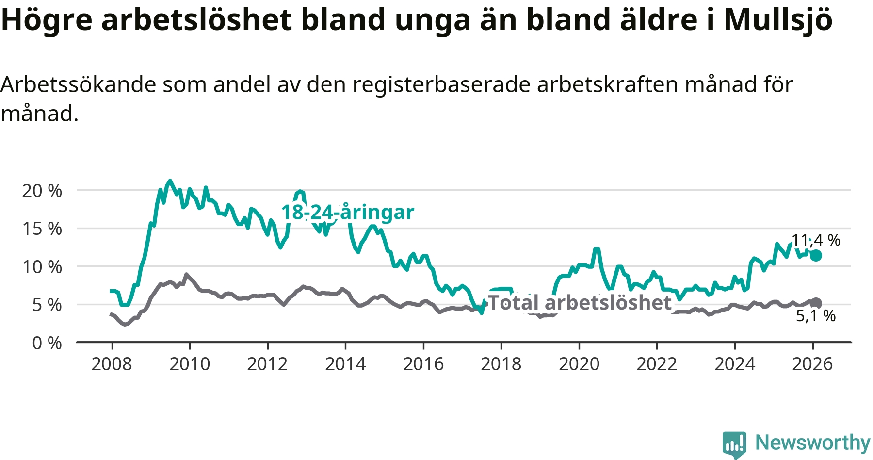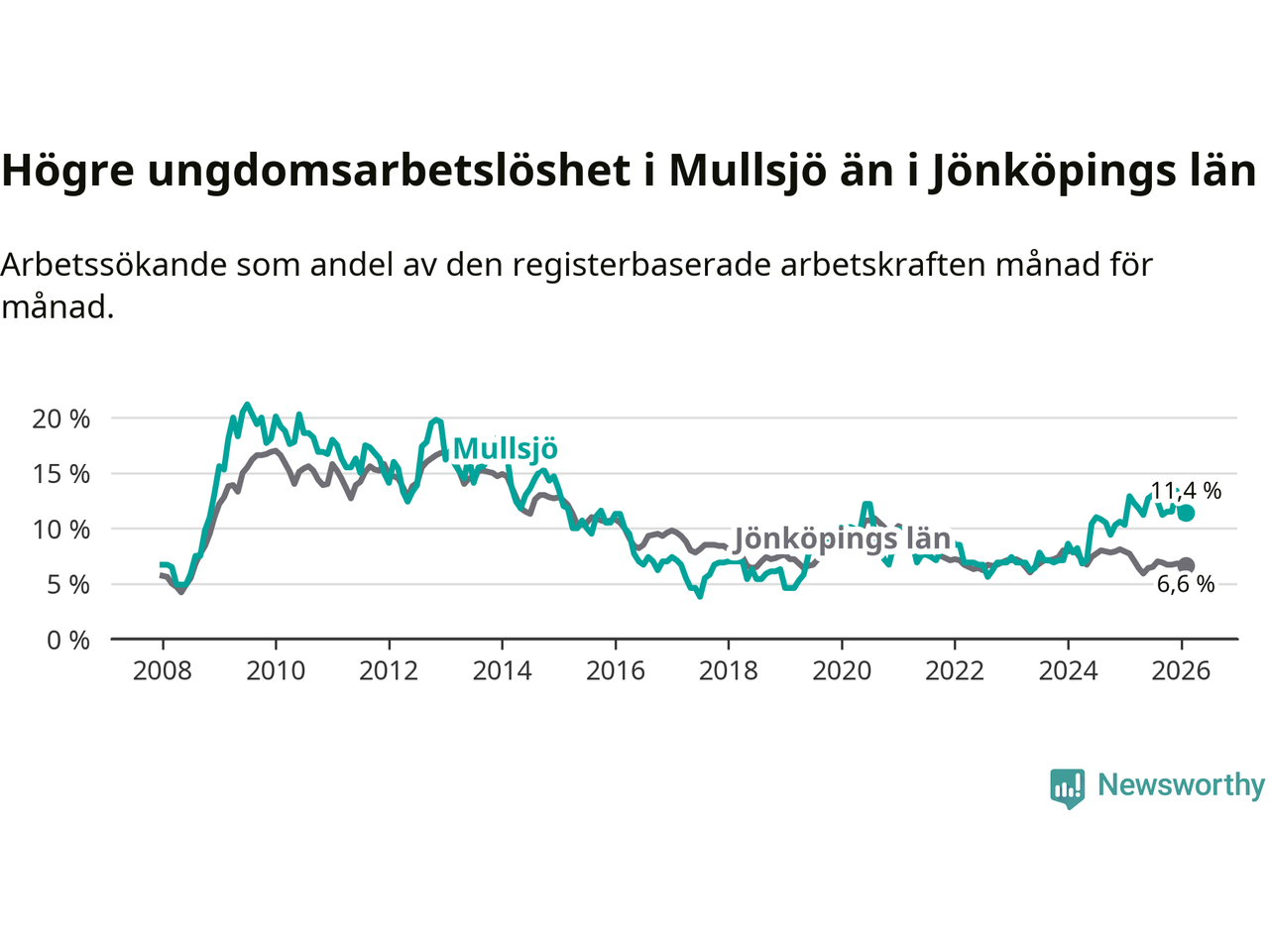 Medan Mullsjö har lägre total arbetslöshet än Jönköpings län, ligger ungdomsarbetslösheten 4,8 procentenheter högre i Mullsjö.