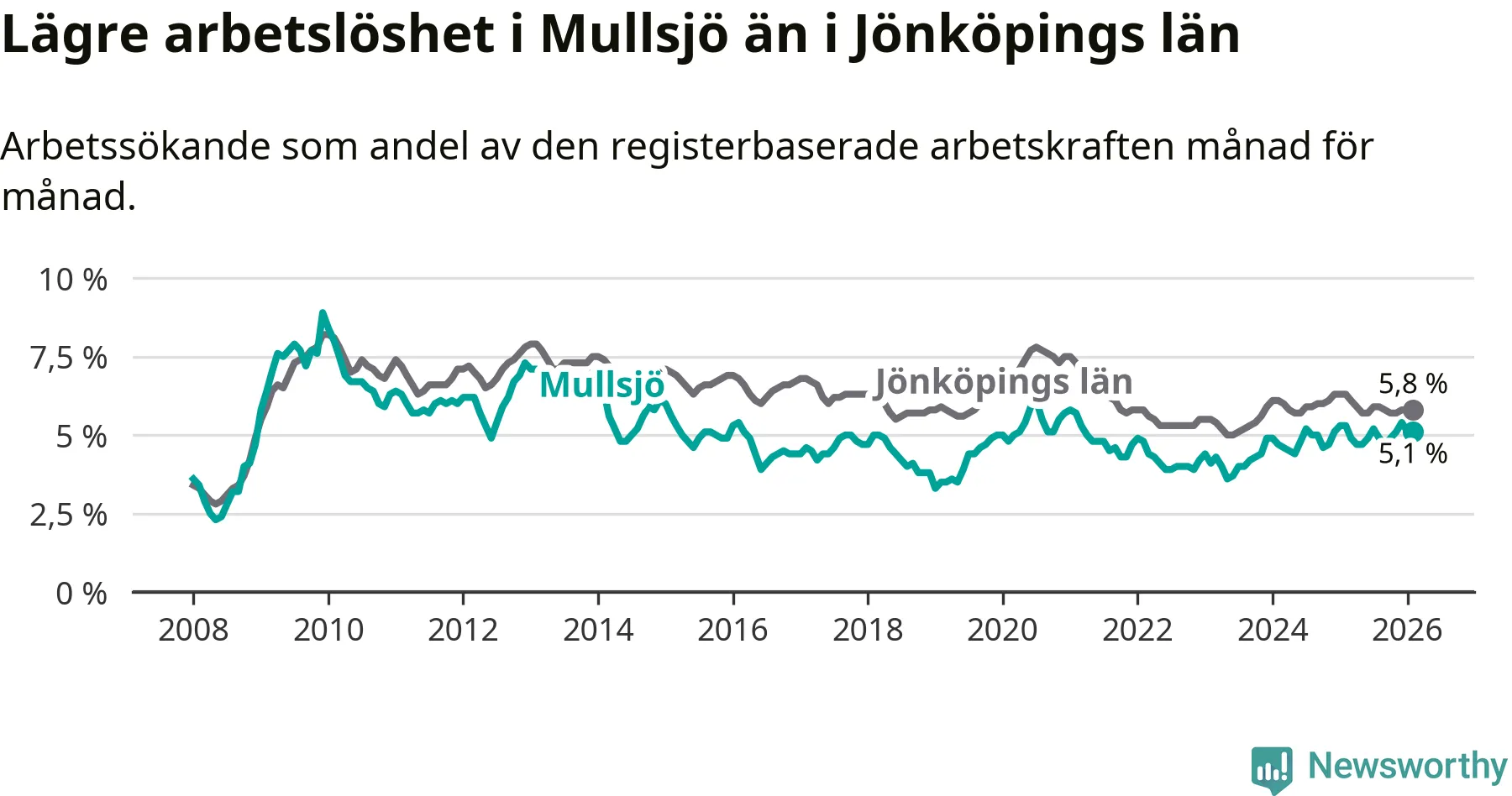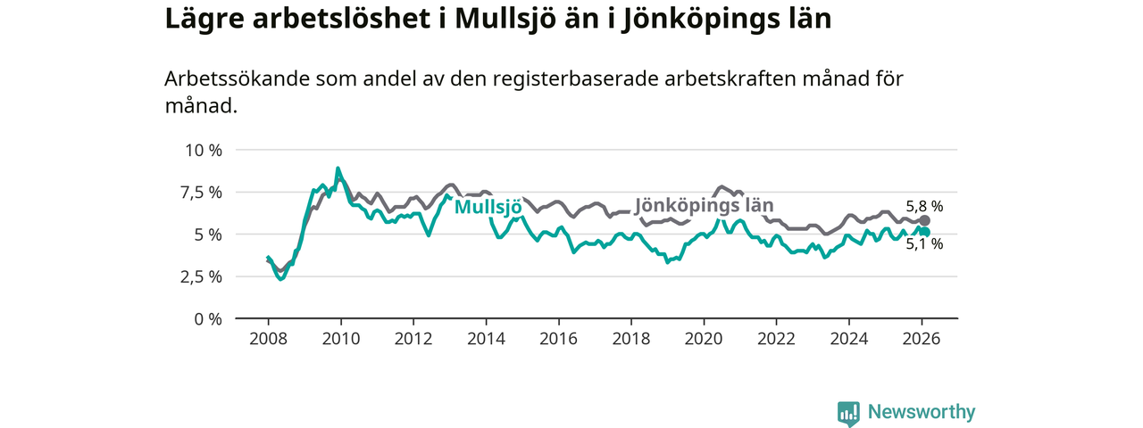 Under februari månad rapporterade Mullsjö kommun en total arbetslöshet på 5,1 procent. Det är en minskning jämfört med samma tidpunkt i fjol (−0,2 procentenheter). Även i Jönköpings län sjunker arbetslösheten .