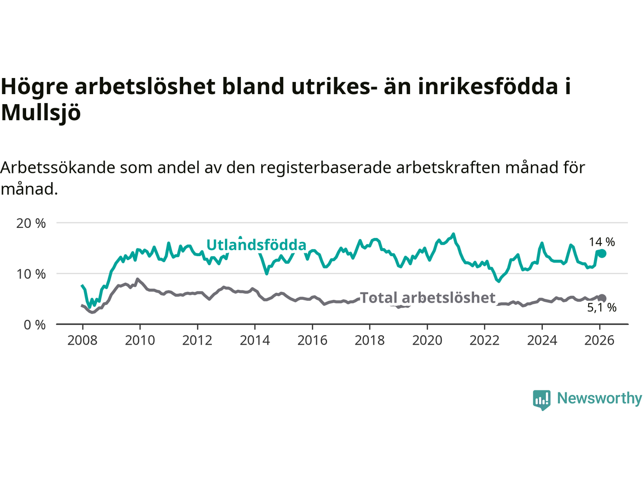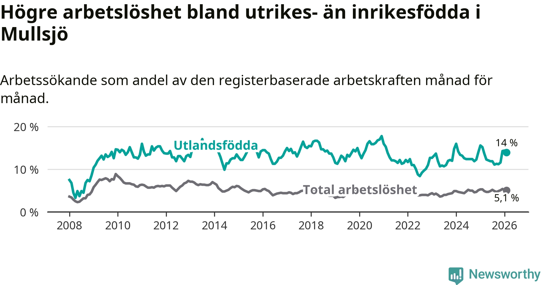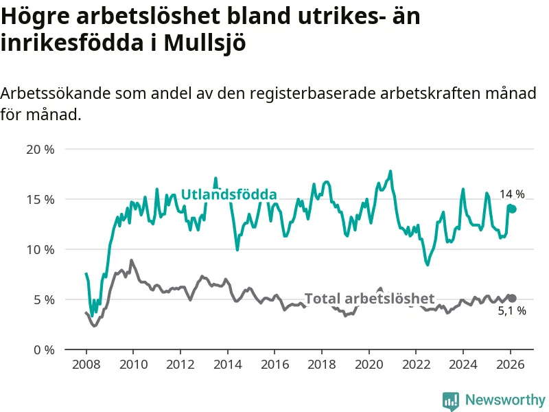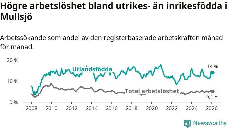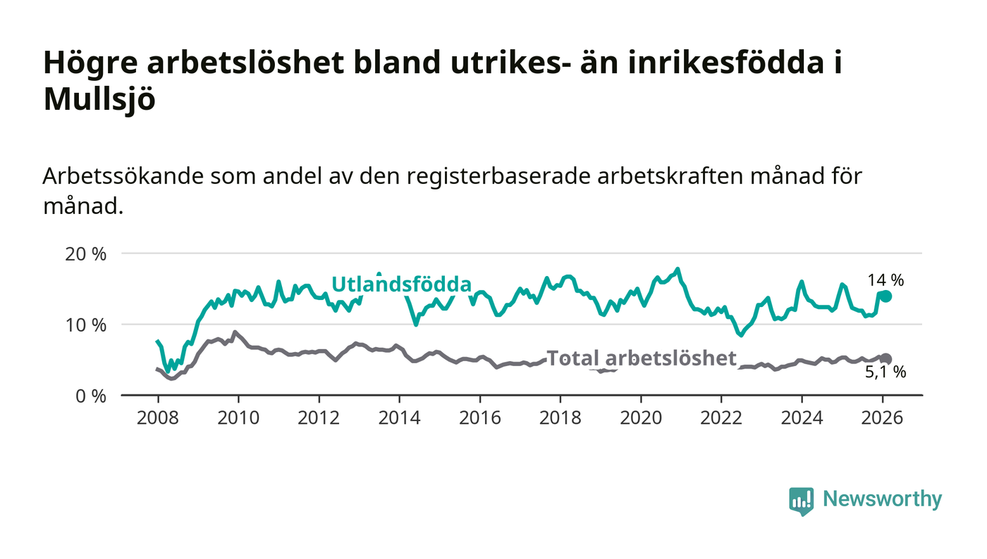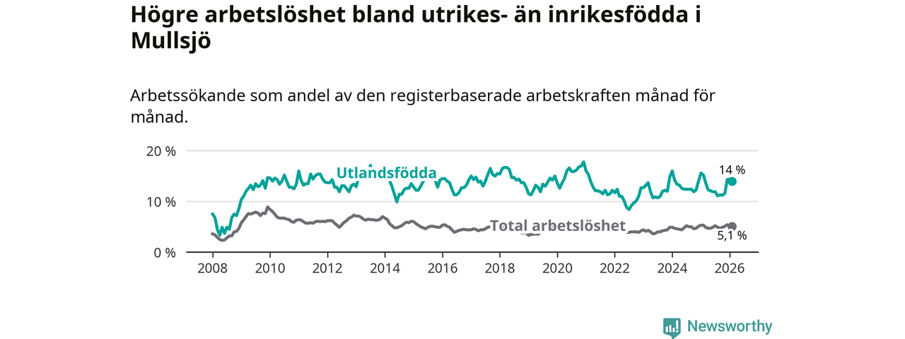 Skillnaden i arbetslöshet mellan utrikesfödda och hela befolkningen är 8,9 procentenheter i Mullsjö. Det är en mindre skillnad än för ett år sedan (−1,0 procentenheter).