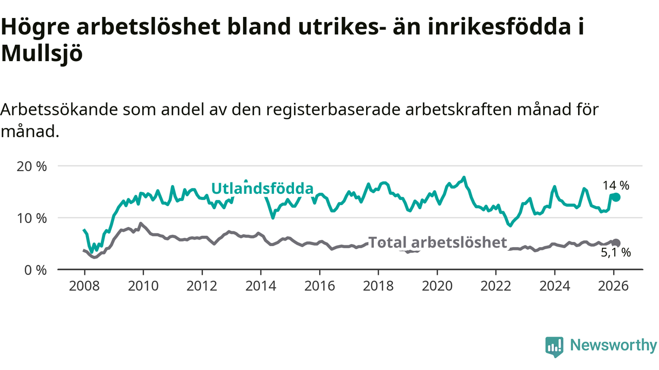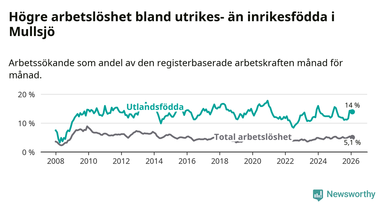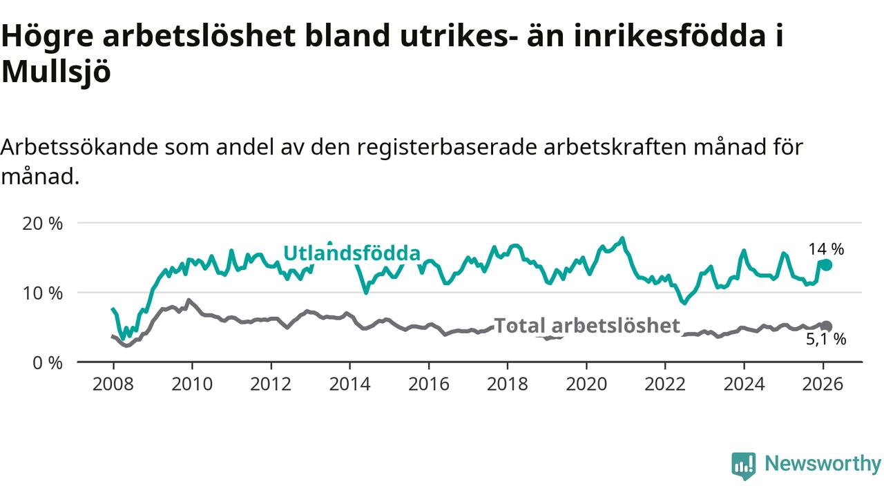 Arbetslösheten bland utlandsfödda var 14,0 procent i Mullsjö under februari månad, motsvarande 73 av 521 personer. Det är 1,2 procentenheter färre än vid samma tidpunkt i fjol (−5 om man räknar personer).