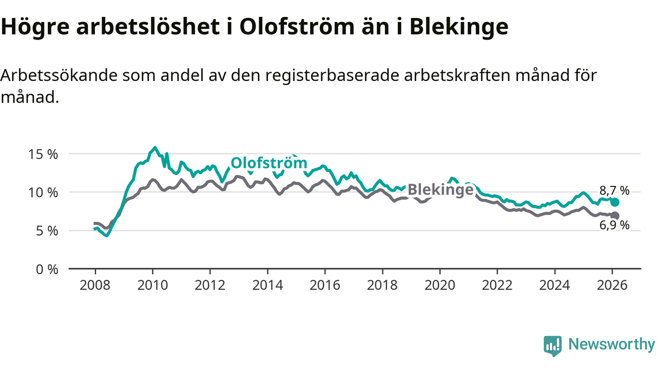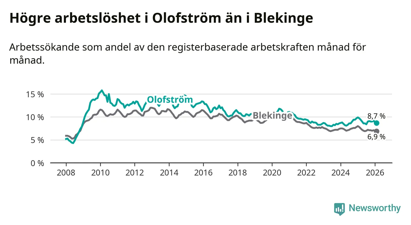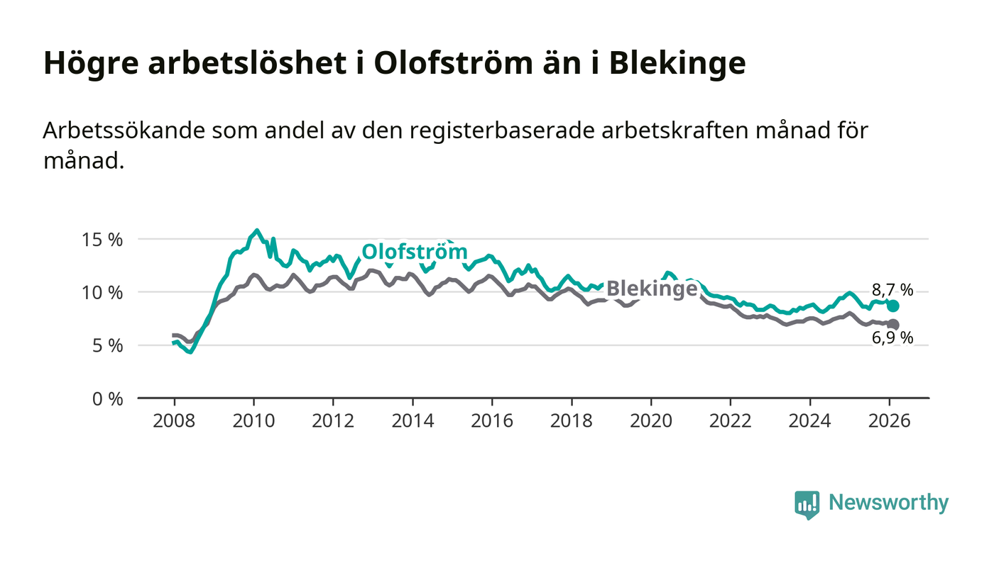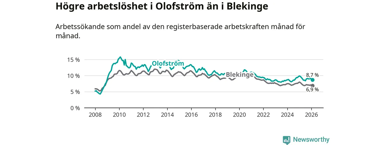 Under februari månad rapporterade Olofströms kommun en total arbetslöshet på 8,7 procent. Det är en minskning jämfört med samma tidpunkt i fjol (−1,0 procentenheter). Även i Blekinge län sjunker arbetslösheten .