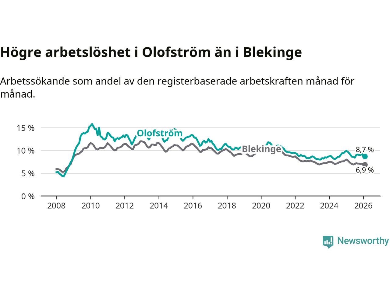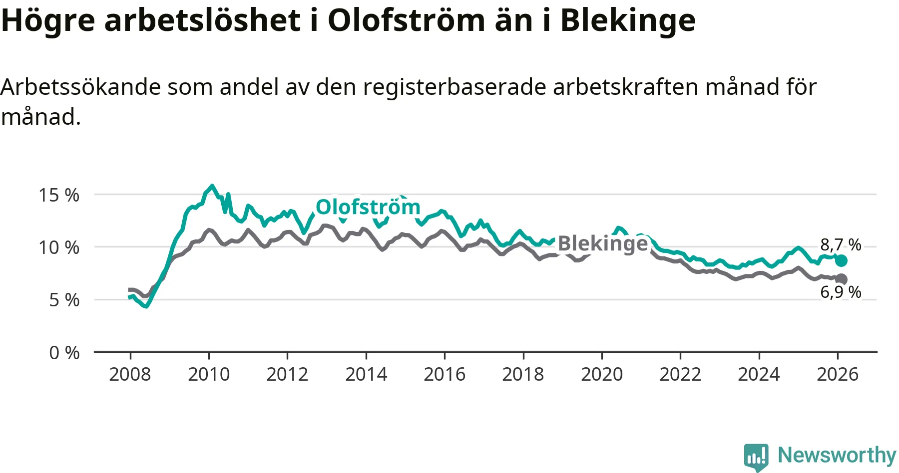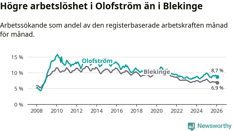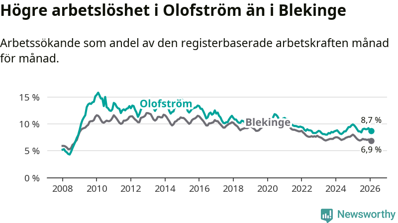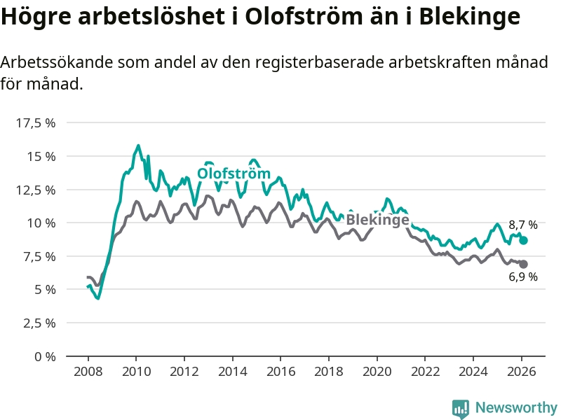 Under februari månad rapporterade Olofströms kommun en total arbetslöshet på 8,7 procent. Det är en minskning jämfört med samma tidpunkt i fjol (−1,0 procentenheter). Även i Blekinge län sjunker arbetslösheten .