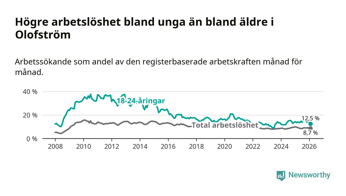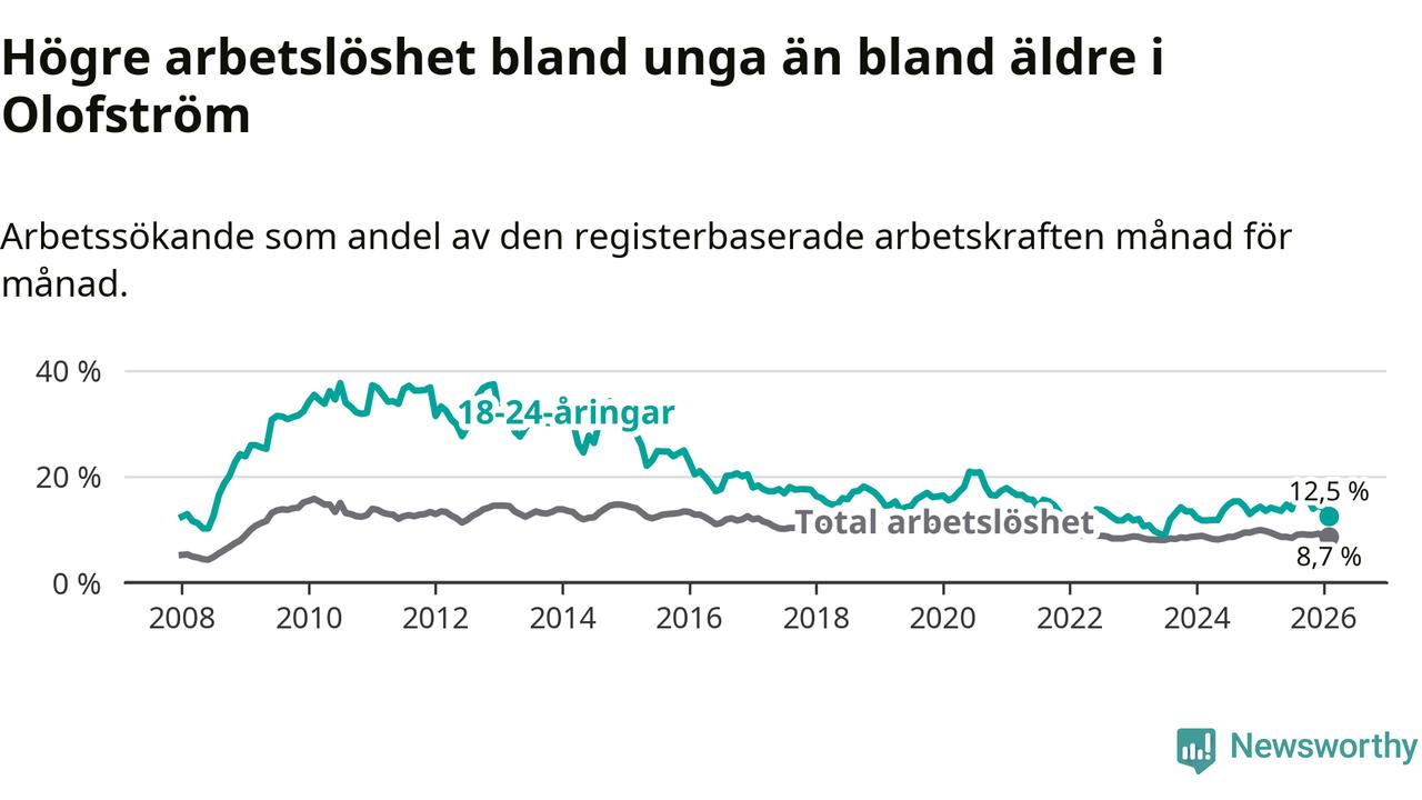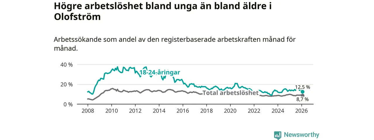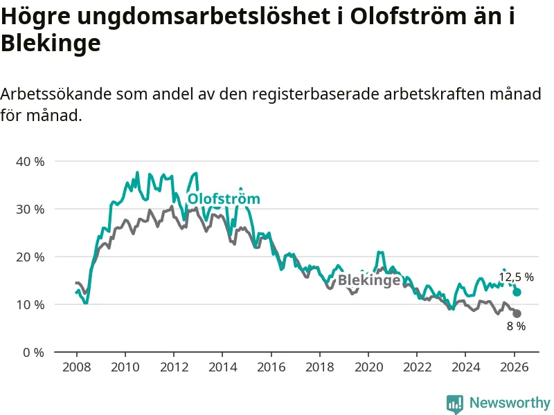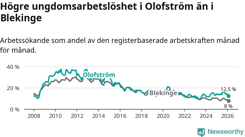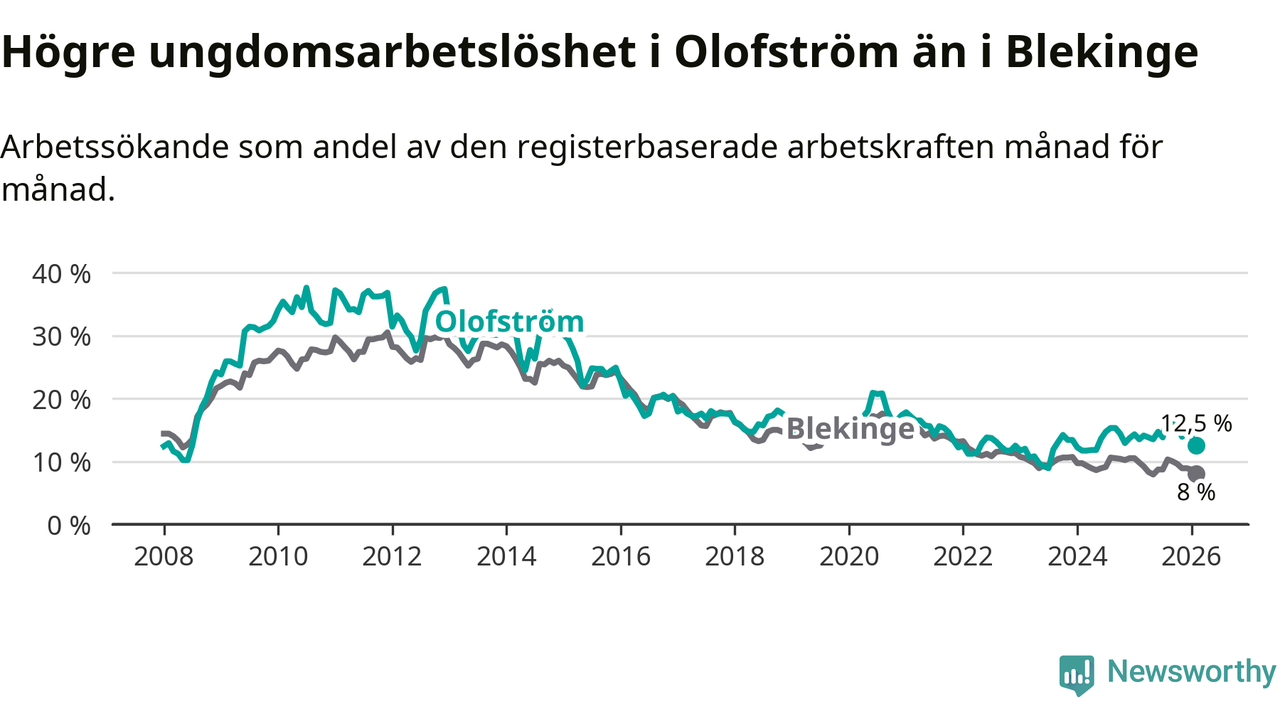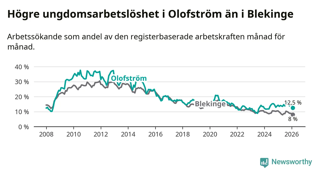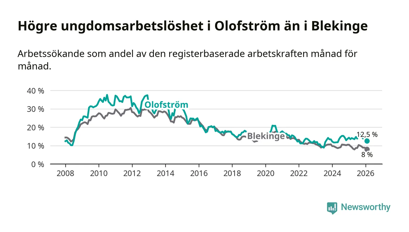 Precis som den totala arbetslösheten ligger ungdomsarbetslösheten i Olofström högre än i Blekinge som helhet. Skillnaden mellan kommunen och länet är 4,5 procentenheter.