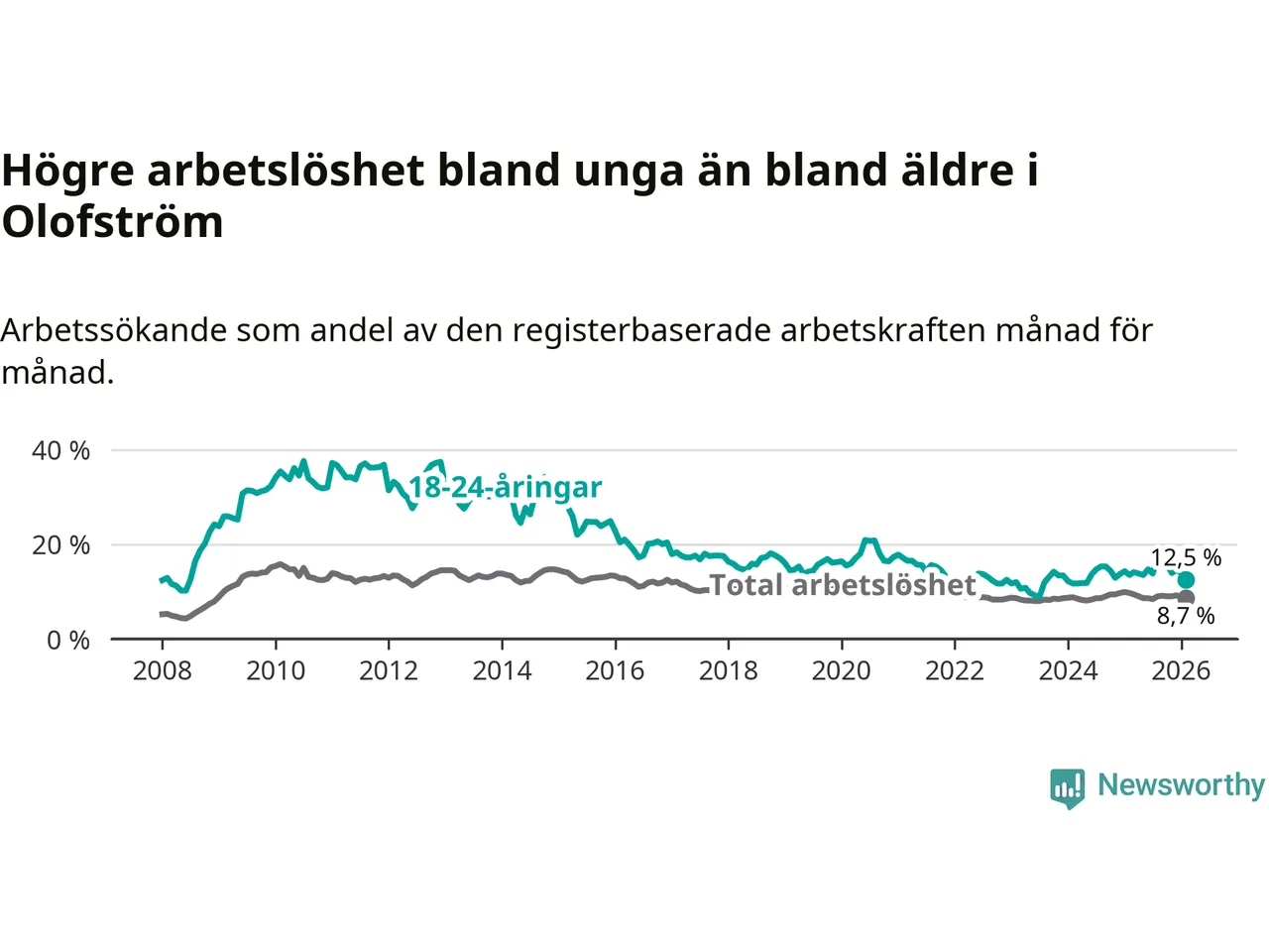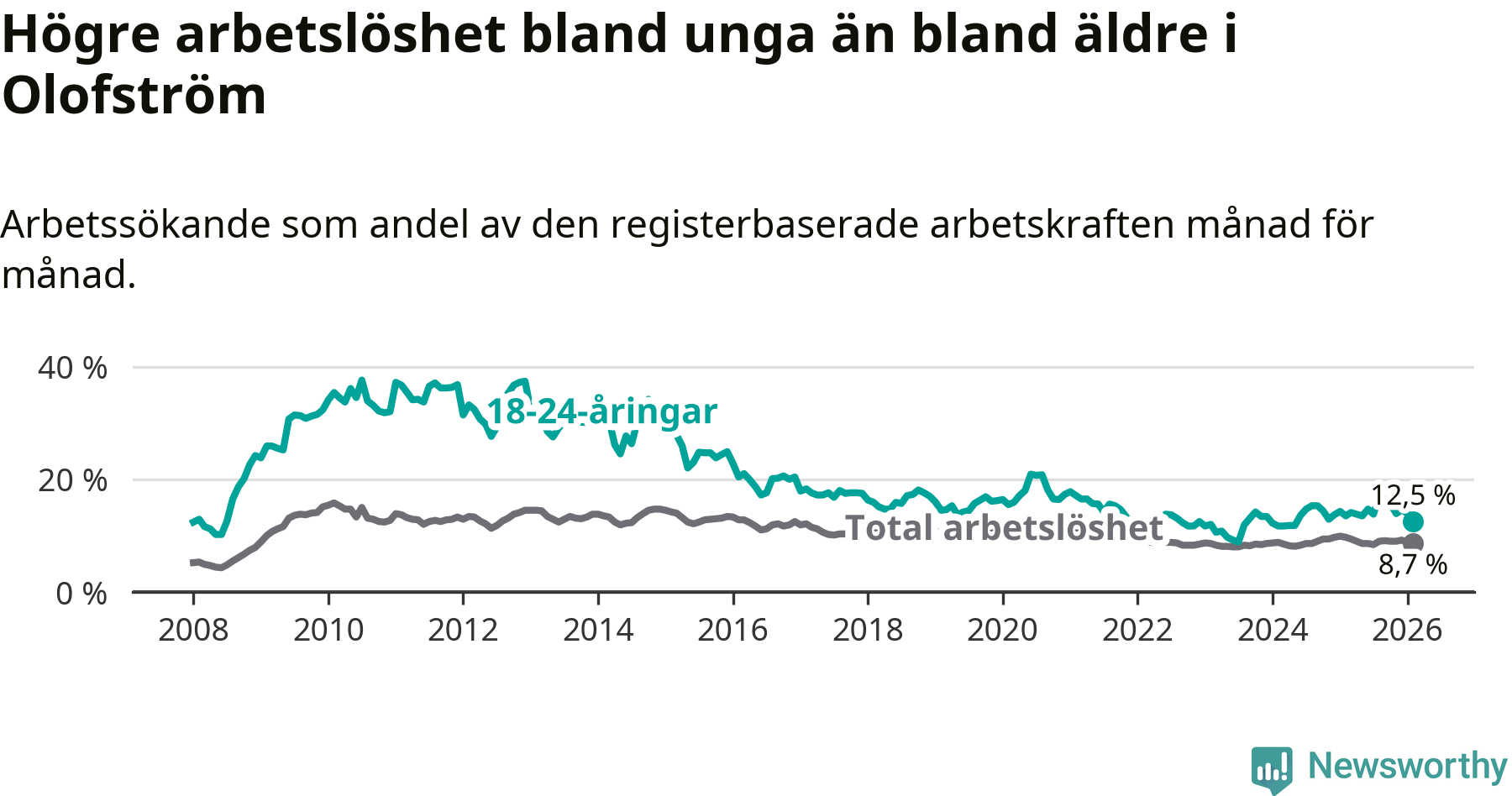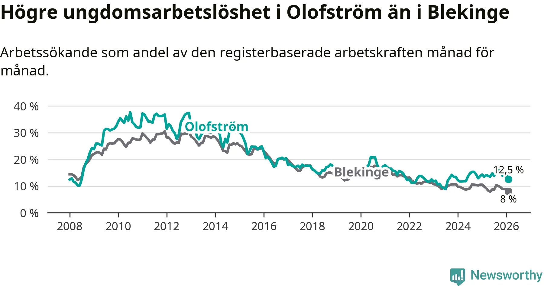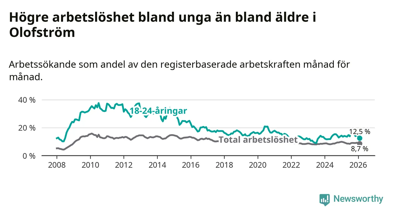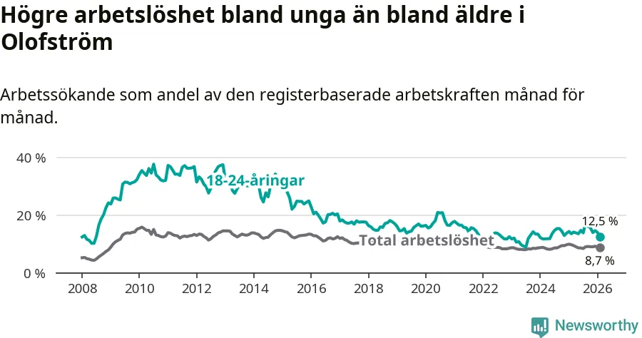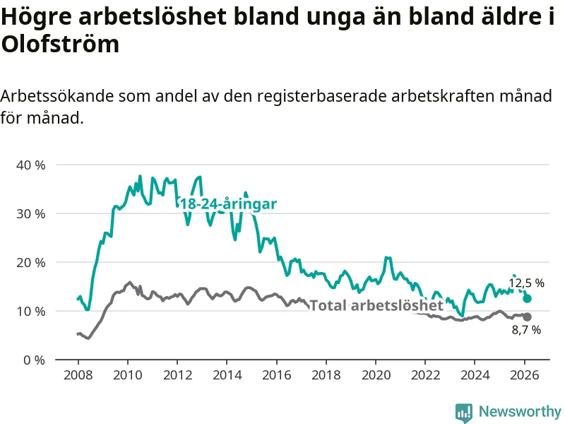 Precis som den totala arbetslösheten ligger ungdomsarbetslösheten i Olofström högre än i Blekinge som helhet. Skillnaden mellan kommunen och länet är 4,5 procentenheter.