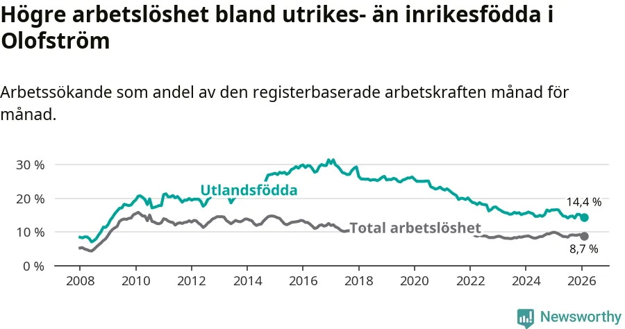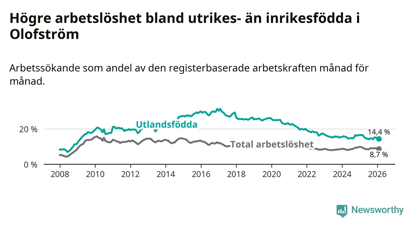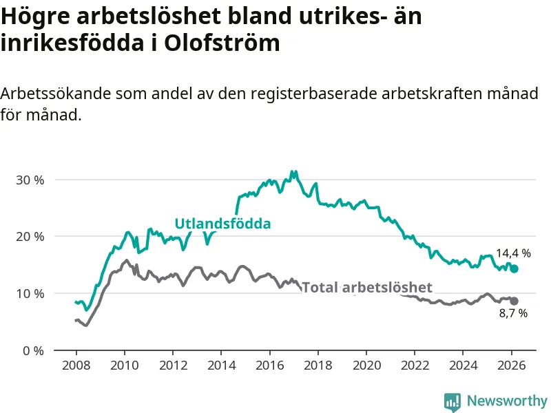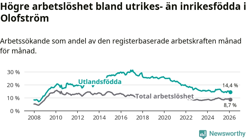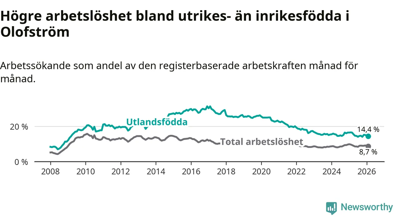 Skillnaden i arbetslöshet mellan utrikesfödda och hela befolkningen är 5,7 procentenheter i Olofström. Det är en mindre skillnad än för ett år sedan (−1,2 procentenheter).