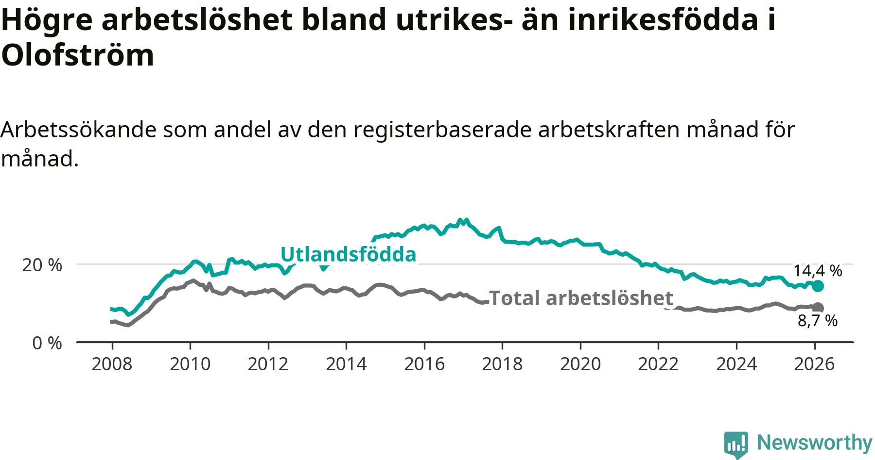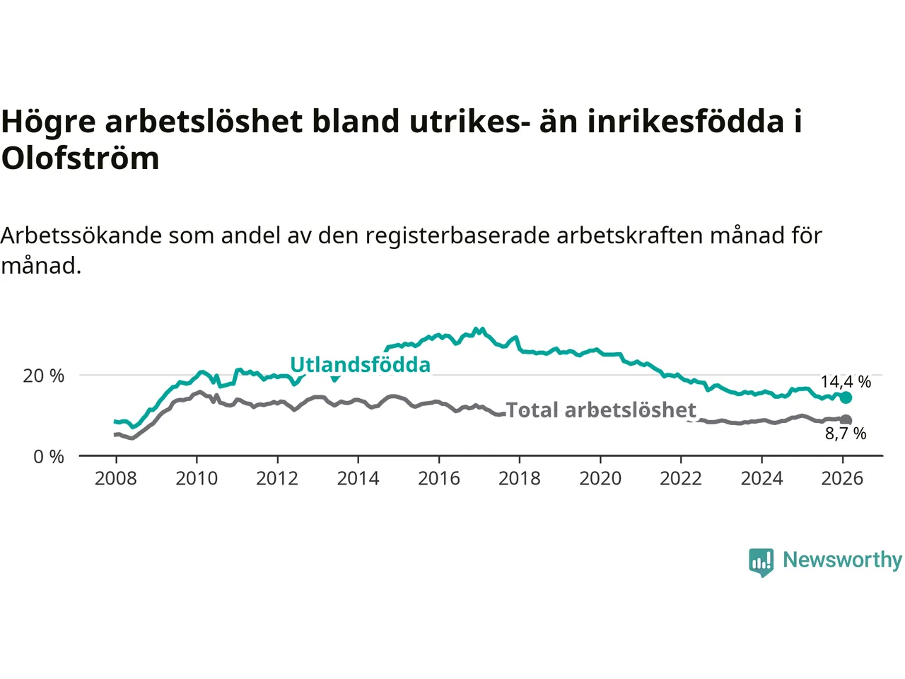 Graf: Skillnad i arbetslöshet mellan utrikesfödda och hela befolkningen i Olofströms kommun