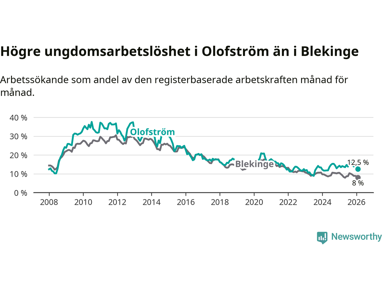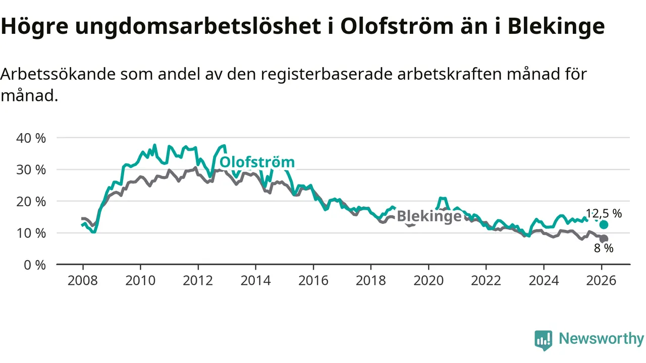 Graf: Arbetslöshet bland unga i Olofströms kommun och Blekinge län