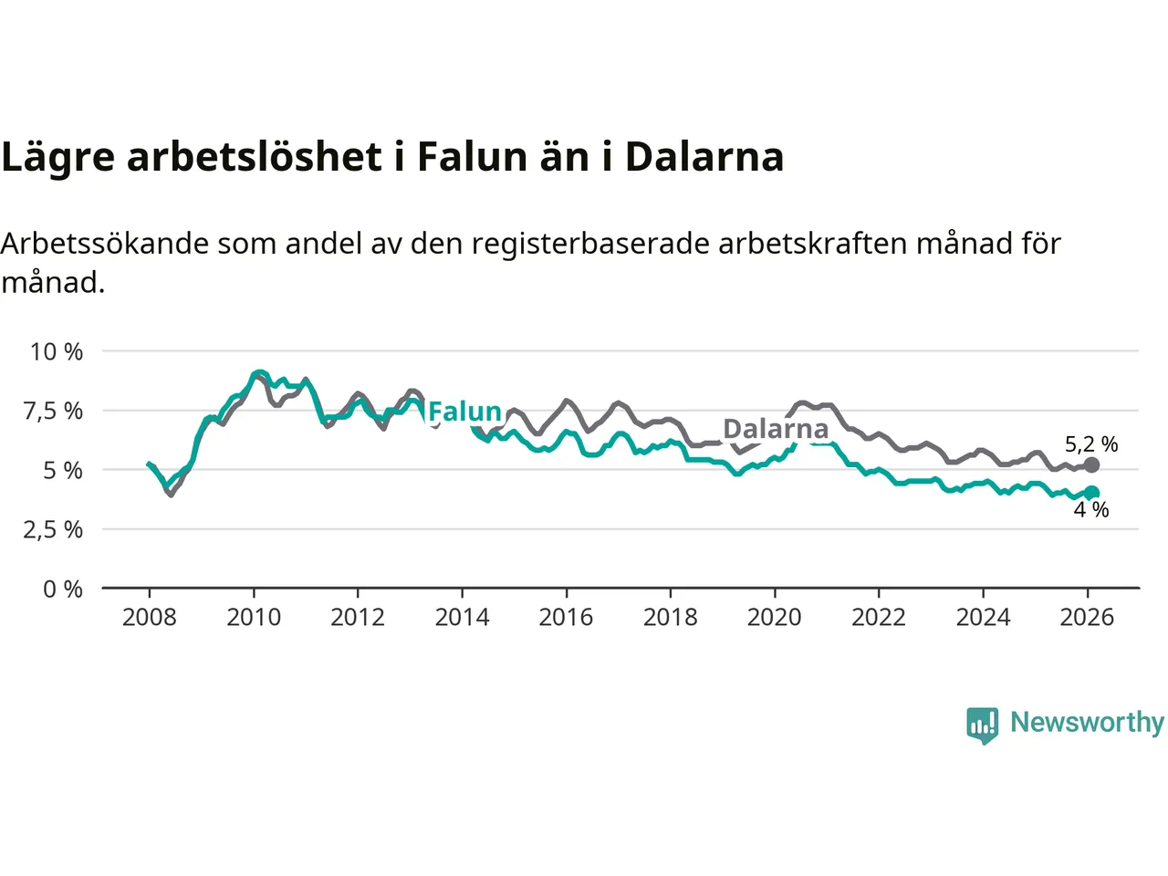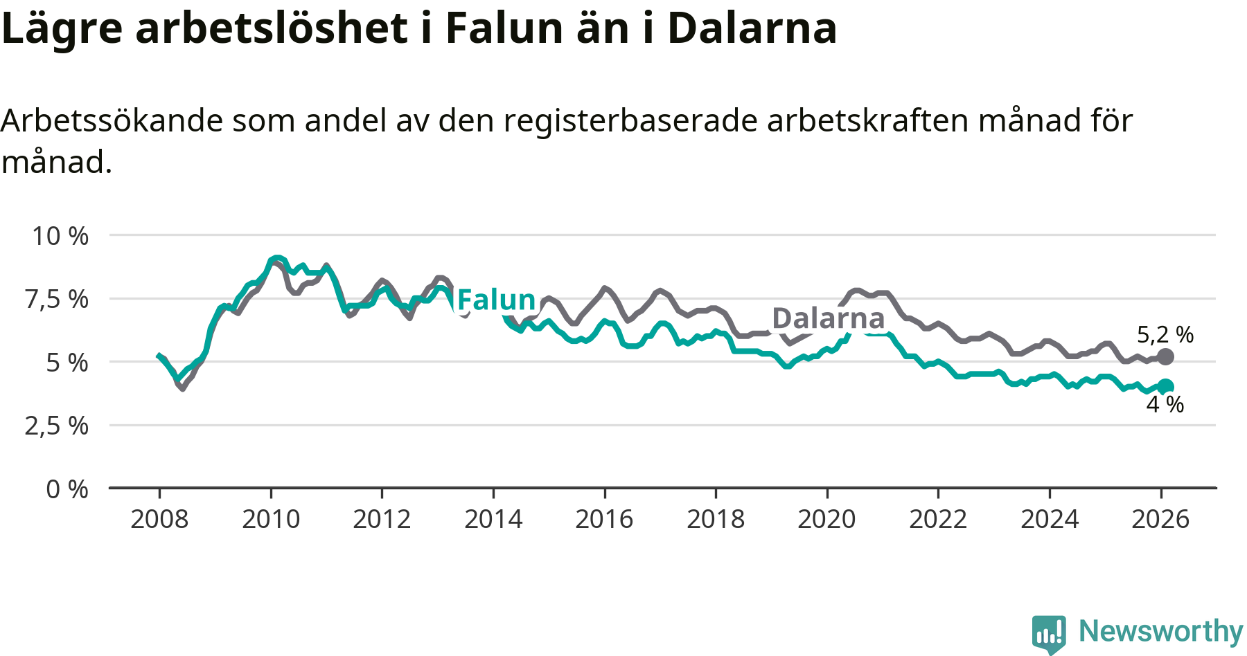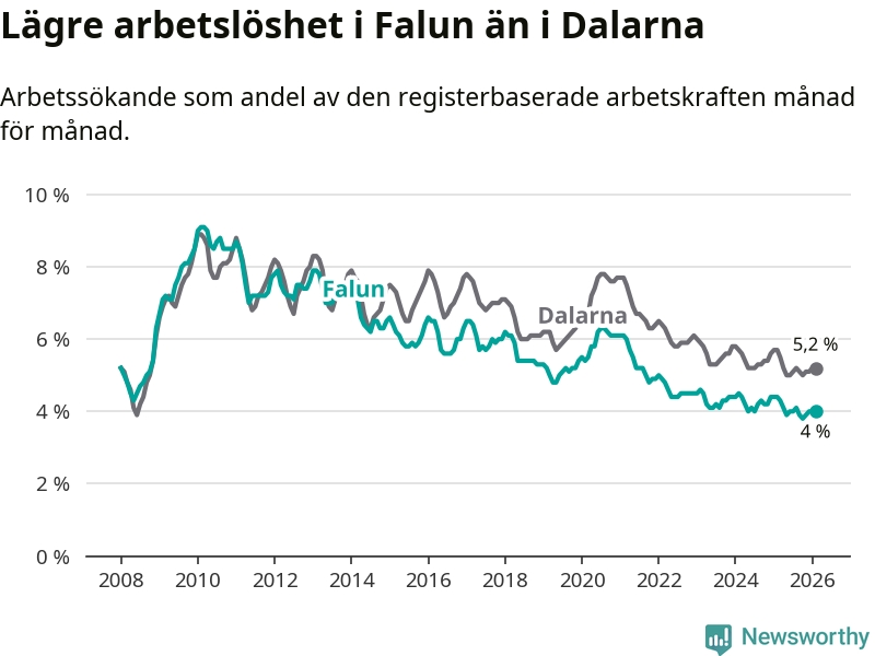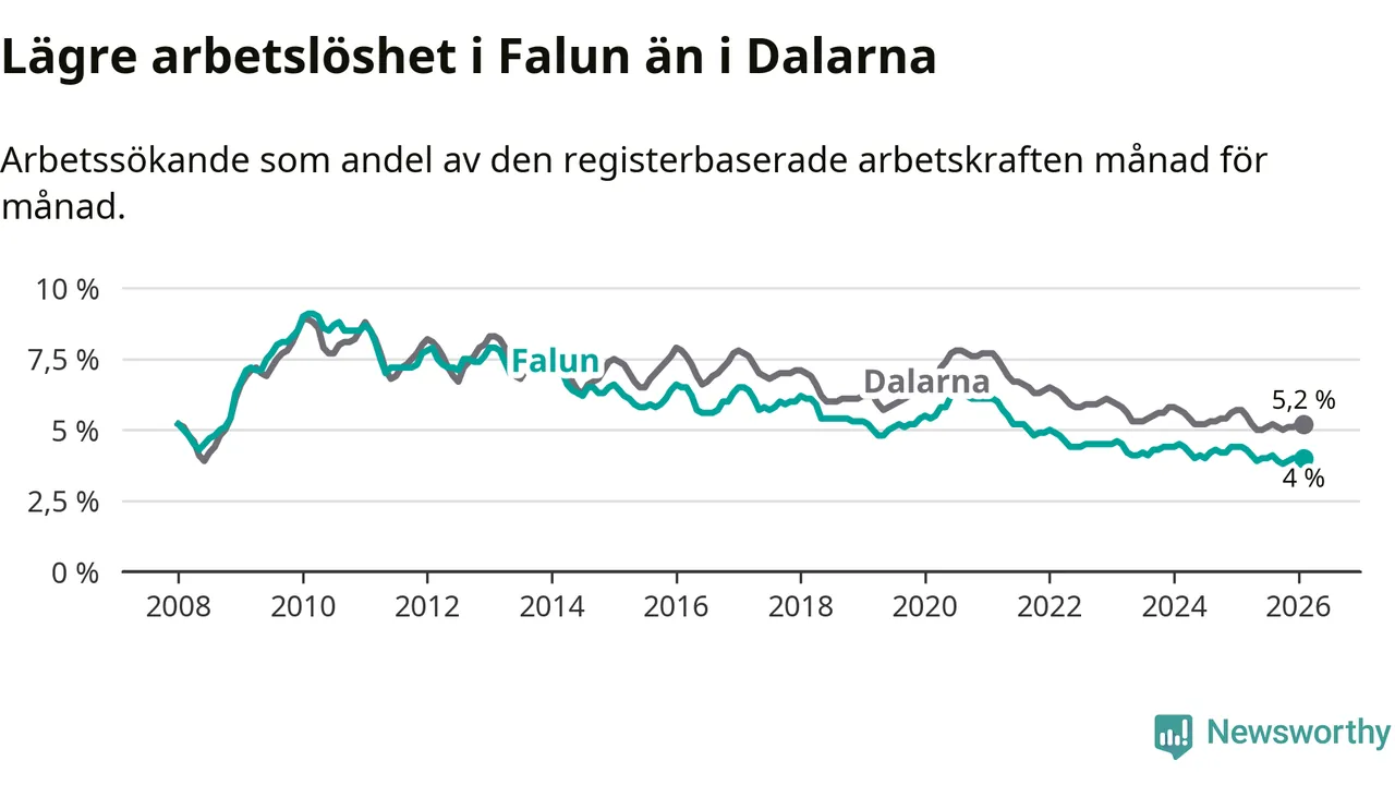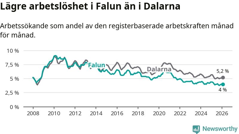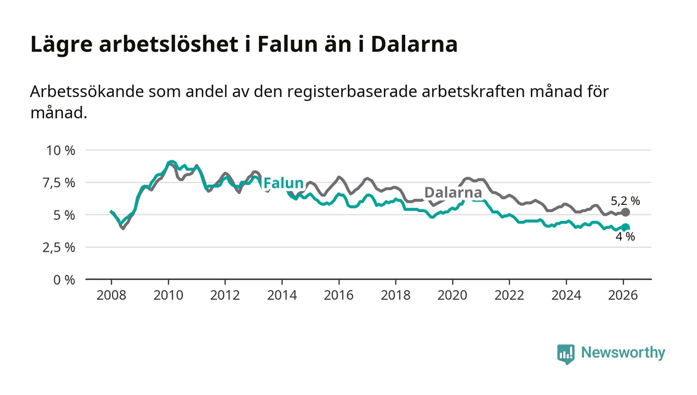 Falun hade redan tidigare lägre arbetslöshet än snittet i hela Dalarnas län och nu växer klyftan (4,0 procent i kommunen, jämfört med 5,2 procent i hela länet). Mora har den lägsta arbetslösheten i länet (3,5 procent), medan Avesta har den högsta (7,5 procent). För att Falun skulle komma ner i samma arbetslöshetsnivå som Mora skulle 148 personer behöva sysselsättas.