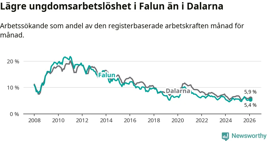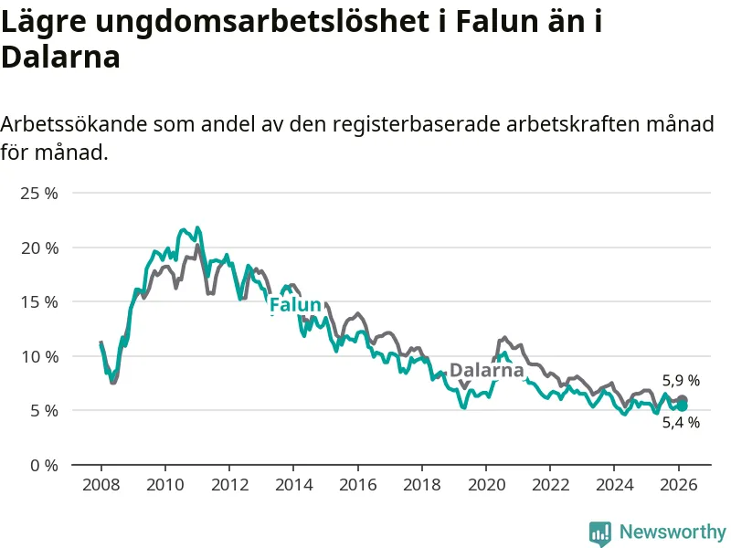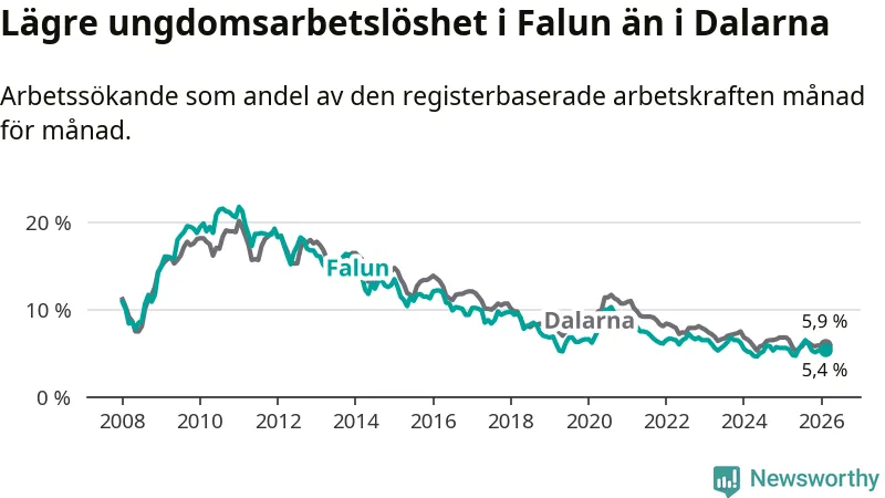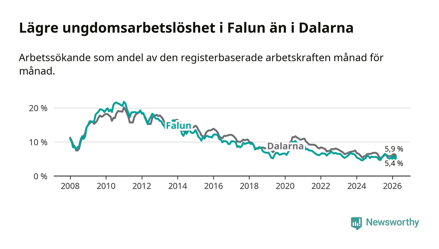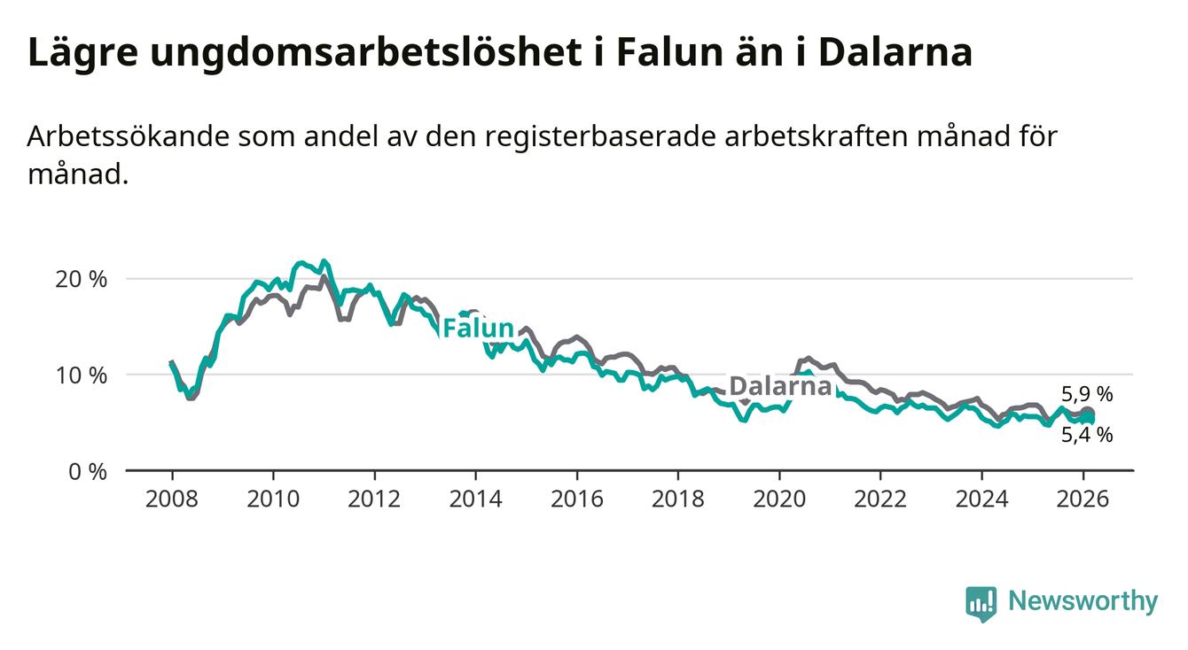 Precis som den totala arbetslösheten ligger ungdomsarbetslösheten i Falun lägre än i Dalarna som helhet. Skillnaden mellan kommunen och länet är 0,5 procentenheter.