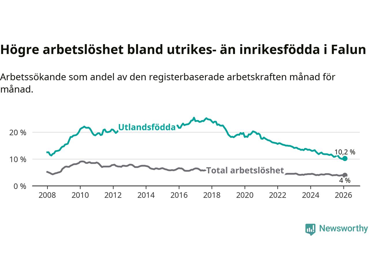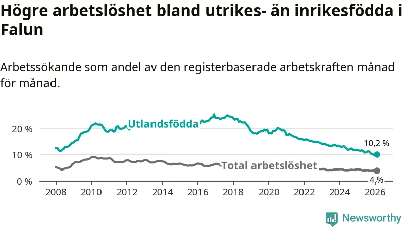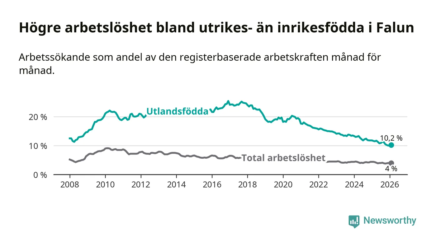 Skillnaden i arbetslöshet mellan utrikesfödda och hela befolkningen är 6,2 procentenheter i Falun. Det är en mindre skillnad än för ett år sedan (−1,0 procentenheter).