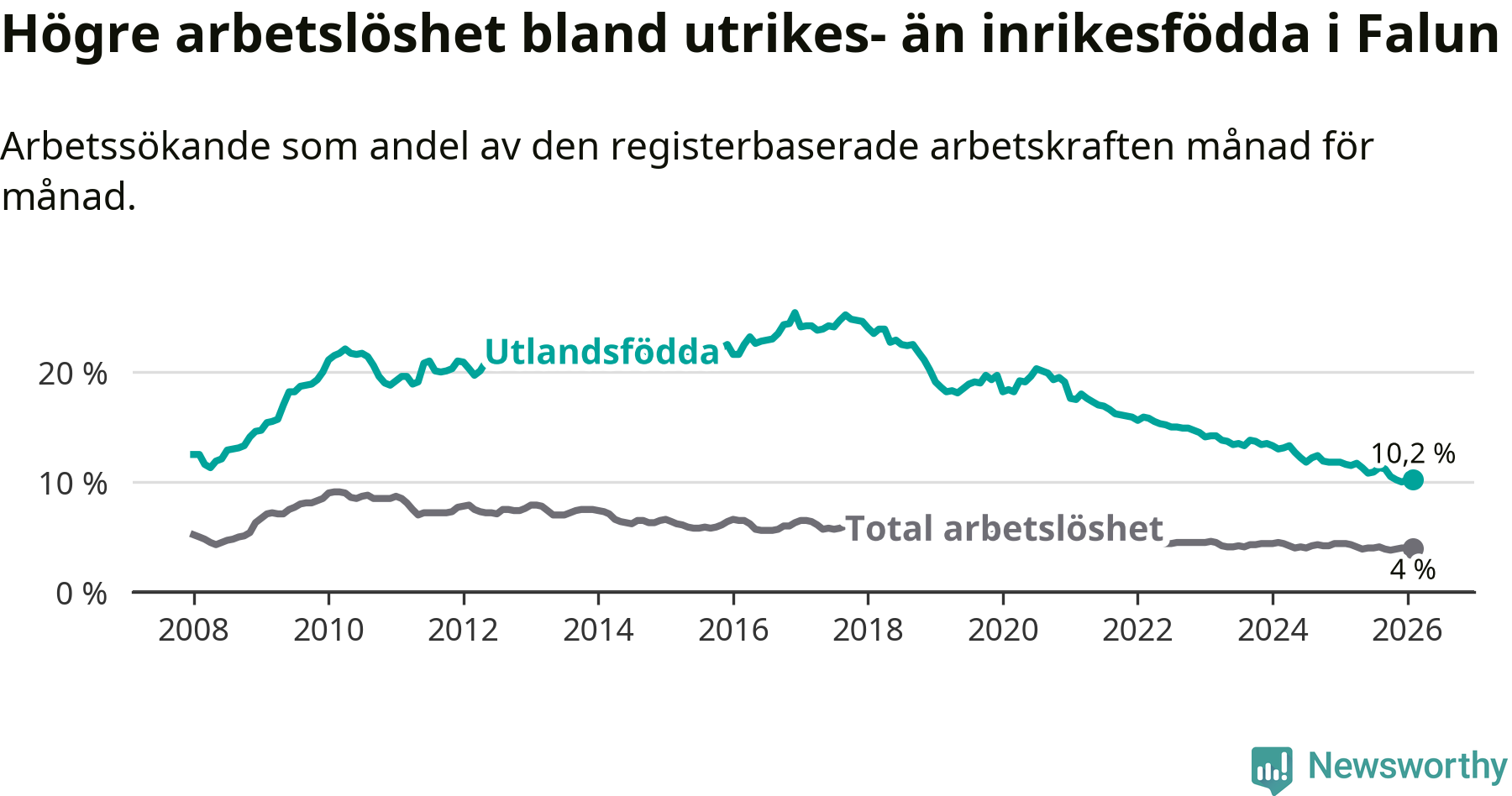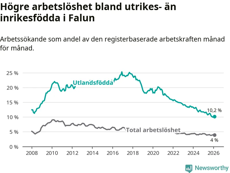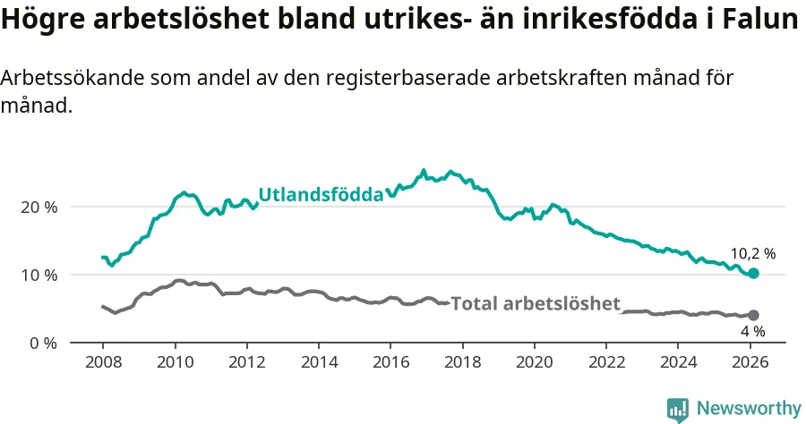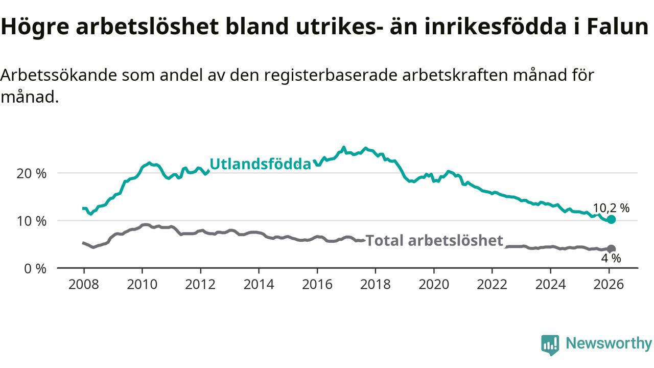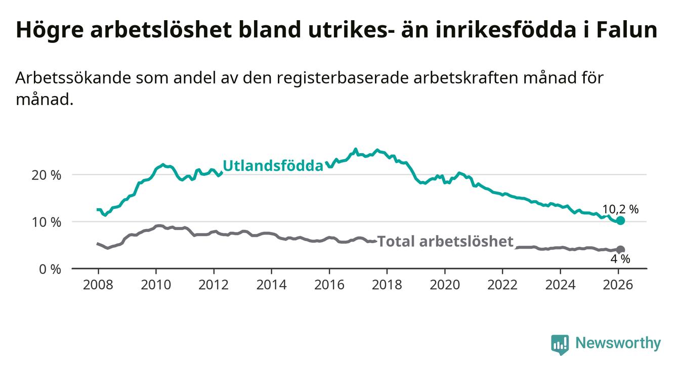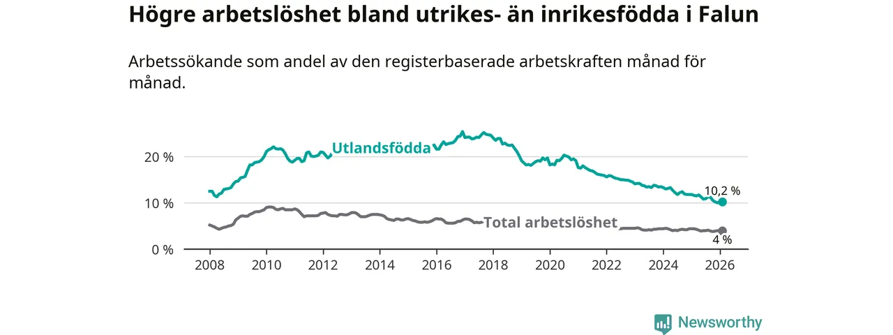 Arbetslösheten bland utlandsfödda var 10,2 procent i Falun under februari månad, motsvarande 383 av 3 755 personer. Det är 1,4 procentenheter färre än vid samma tidpunkt i fjol (−55 om man räknar personer). Därmed har de utlandsföddas arbetslöshet varit lägre än vid samma tidpunkt i fjol i över fem år i sträck. Sedan november 2020 har arbetslösheten bland utlandsfödda minskat från 19,5 till 10,2 procent.