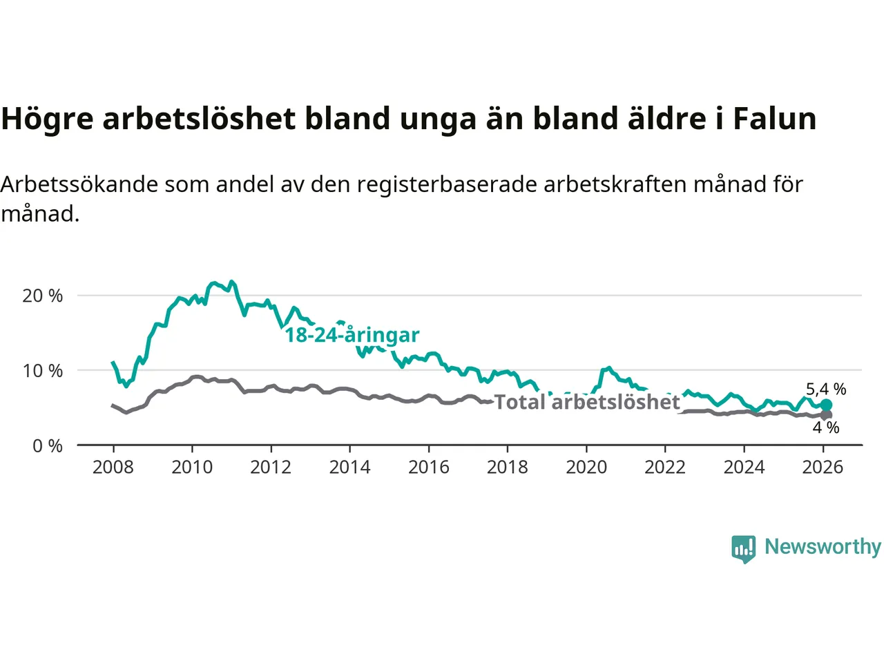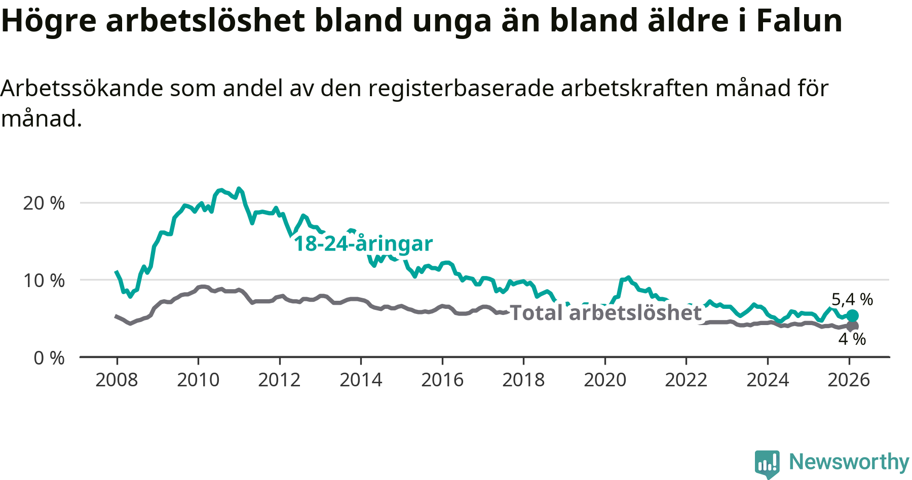 Precis som den totala arbetslösheten sjunker arbetslösheten bland unga (−0,2 procentenheter). I februari var 5,4 procent av 18–24-åringarna inskrivna som arbetssökande (motsvarande 163 personer). Mäter vi antalet inskrivna ser vi en minskning med sju personer på ett års sikt.
