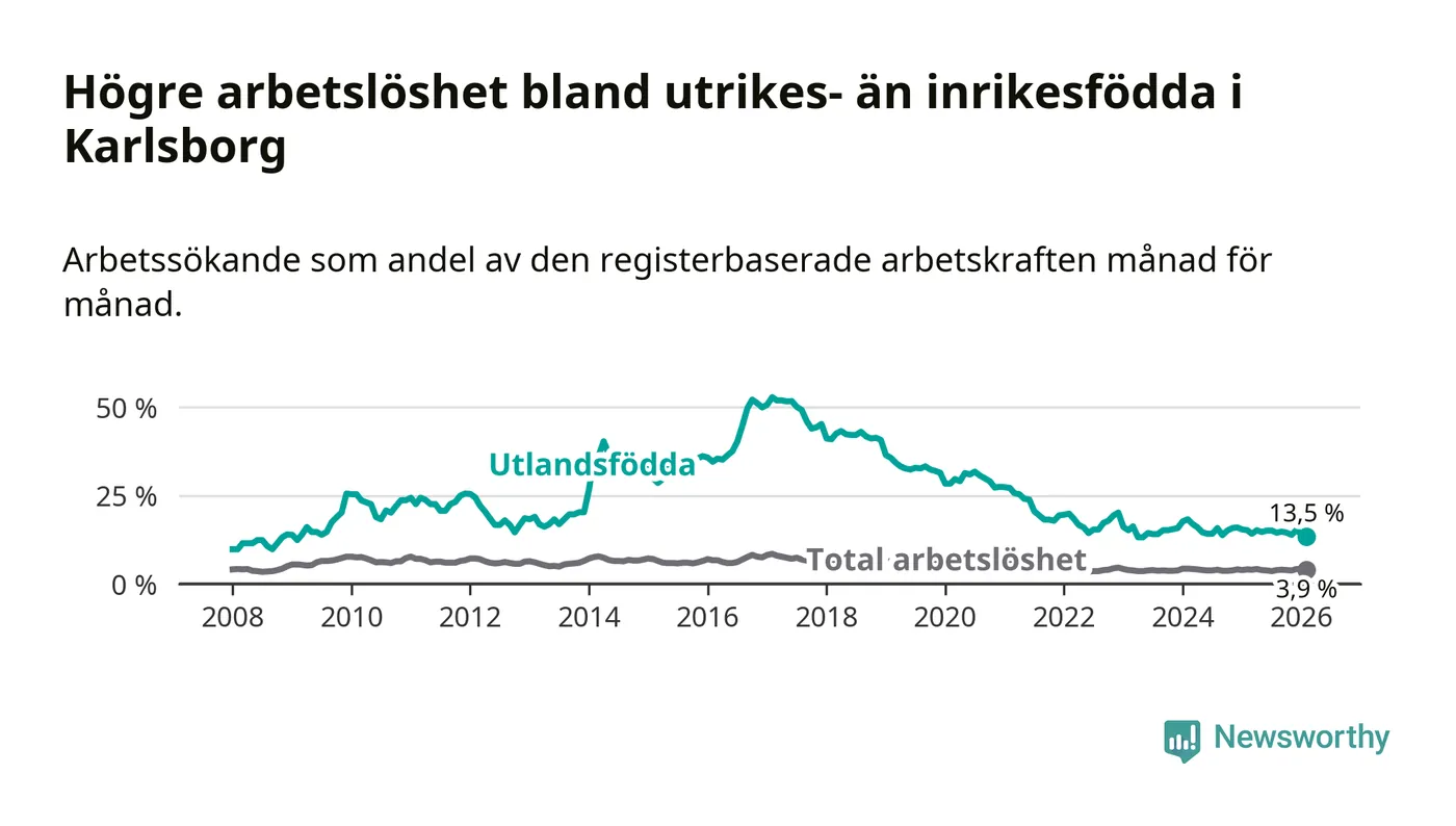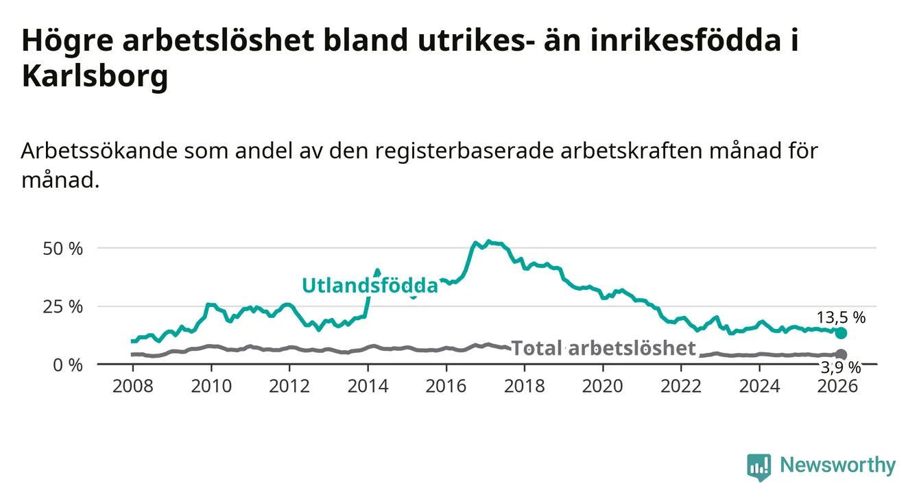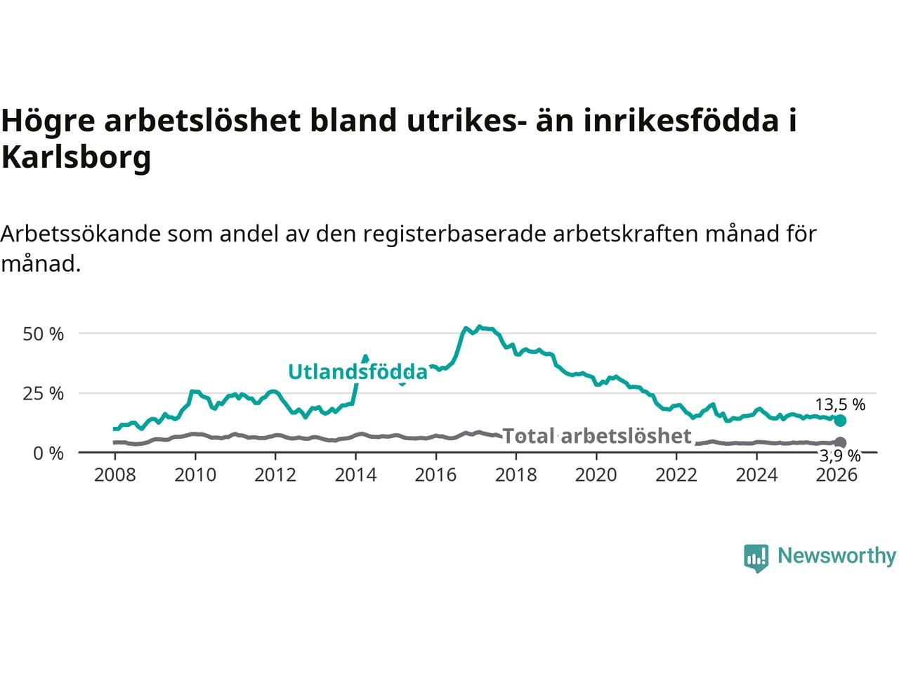 Arbetslösheten bland utlandsfödda var 13,5 procent i Karlsborg under februari månad, motsvarande 41 av 304 personer. Det är 1,7 procentenheter färre än vid samma tidpunkt i fjol (−6 om man räknar personer).