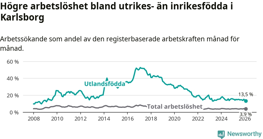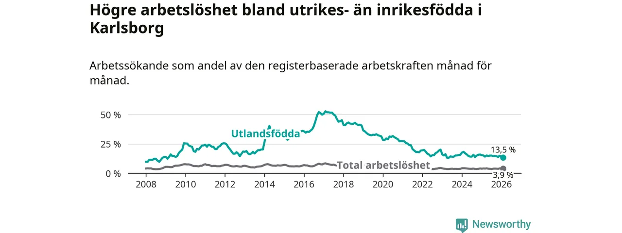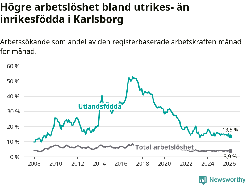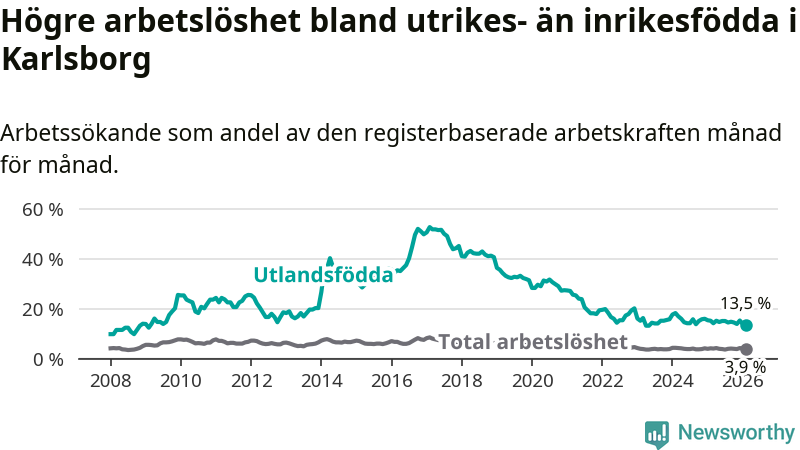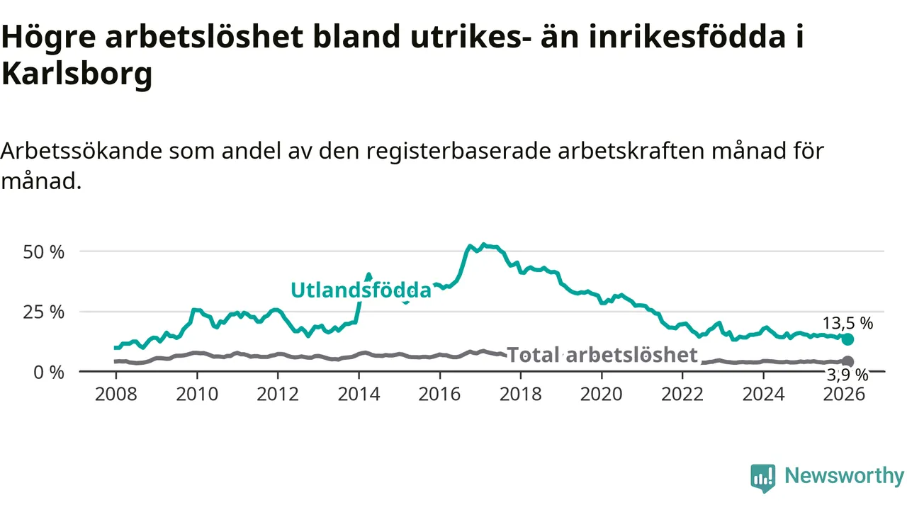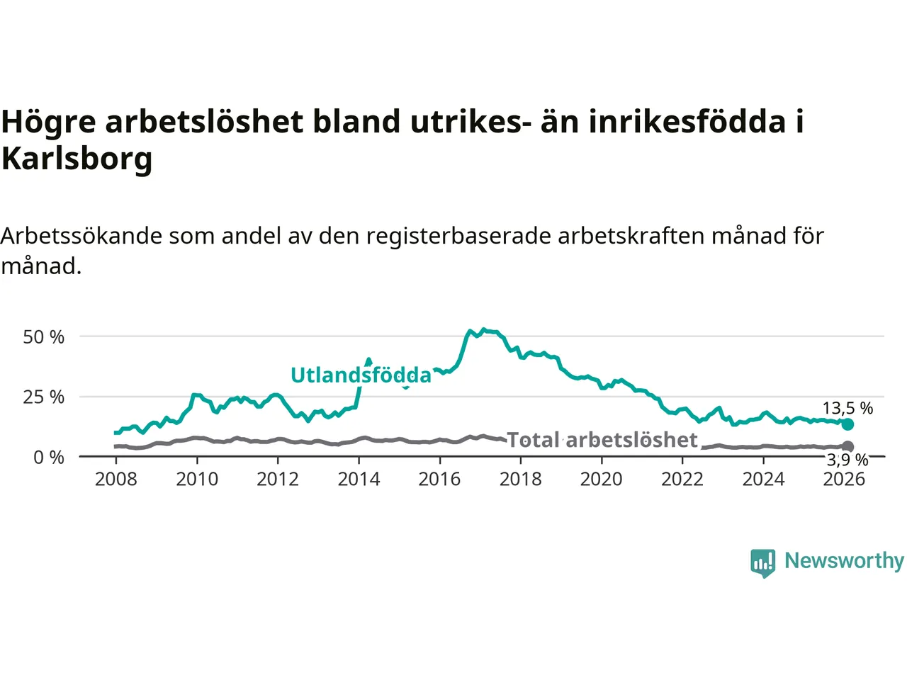 Arbetslösheten bland utlandsfödda var 13,5 procent i Karlsborg under februari månad, motsvarande 41 av 304 personer. Det är 1,7 procentenheter färre än vid samma tidpunkt i fjol (−6 om man räknar personer).