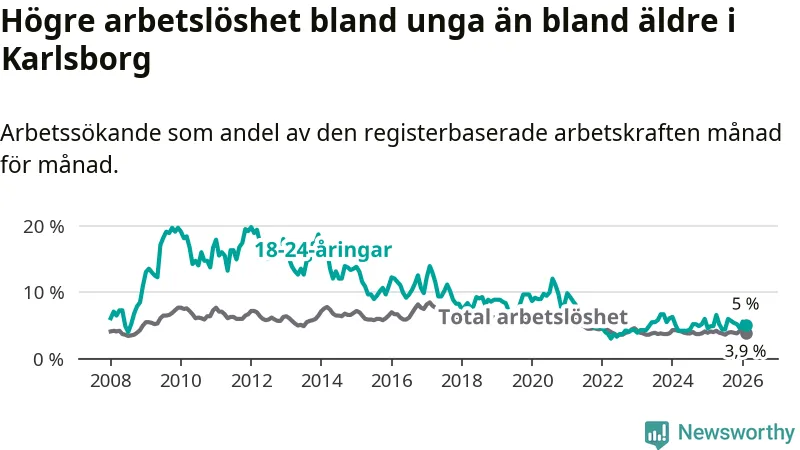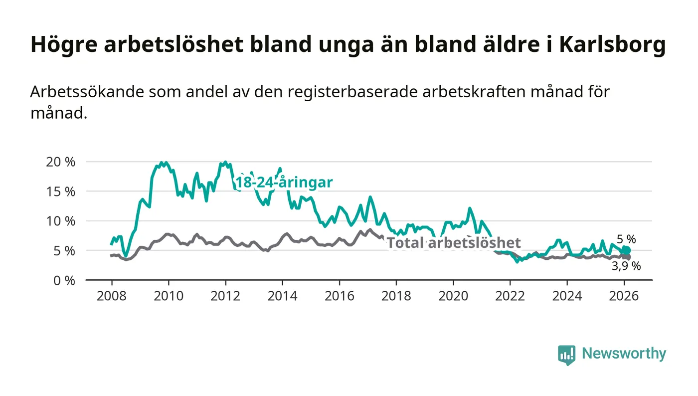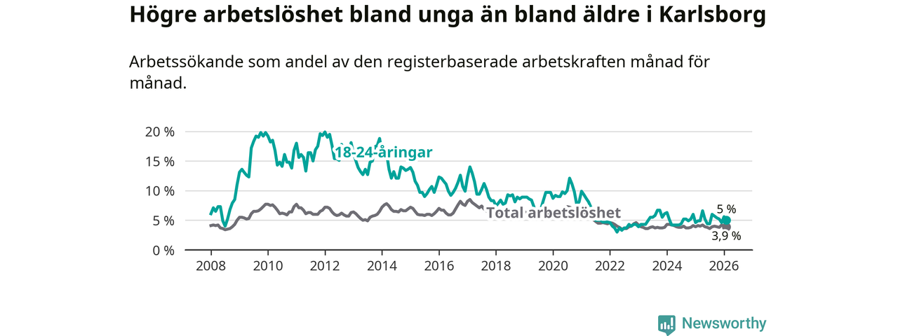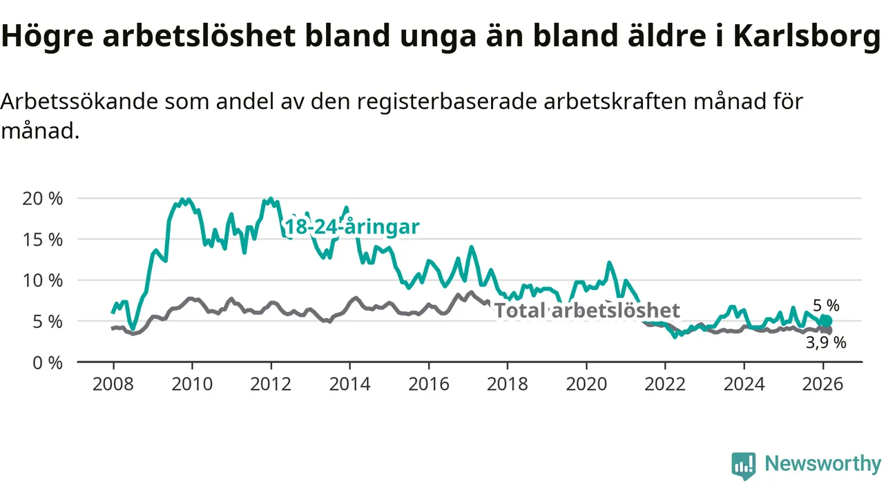 Till skillnad från den totala arbetslösheten stiger arbetslösheten bland unga (+0,1 procentenheter). I februari var 5,0 procent av 18–24-åringarna inskrivna som arbetssökande (motsvarande 19 personer). Mäter vi antalet inskrivna ser vi en ökning med ett personer på ett års sikt.