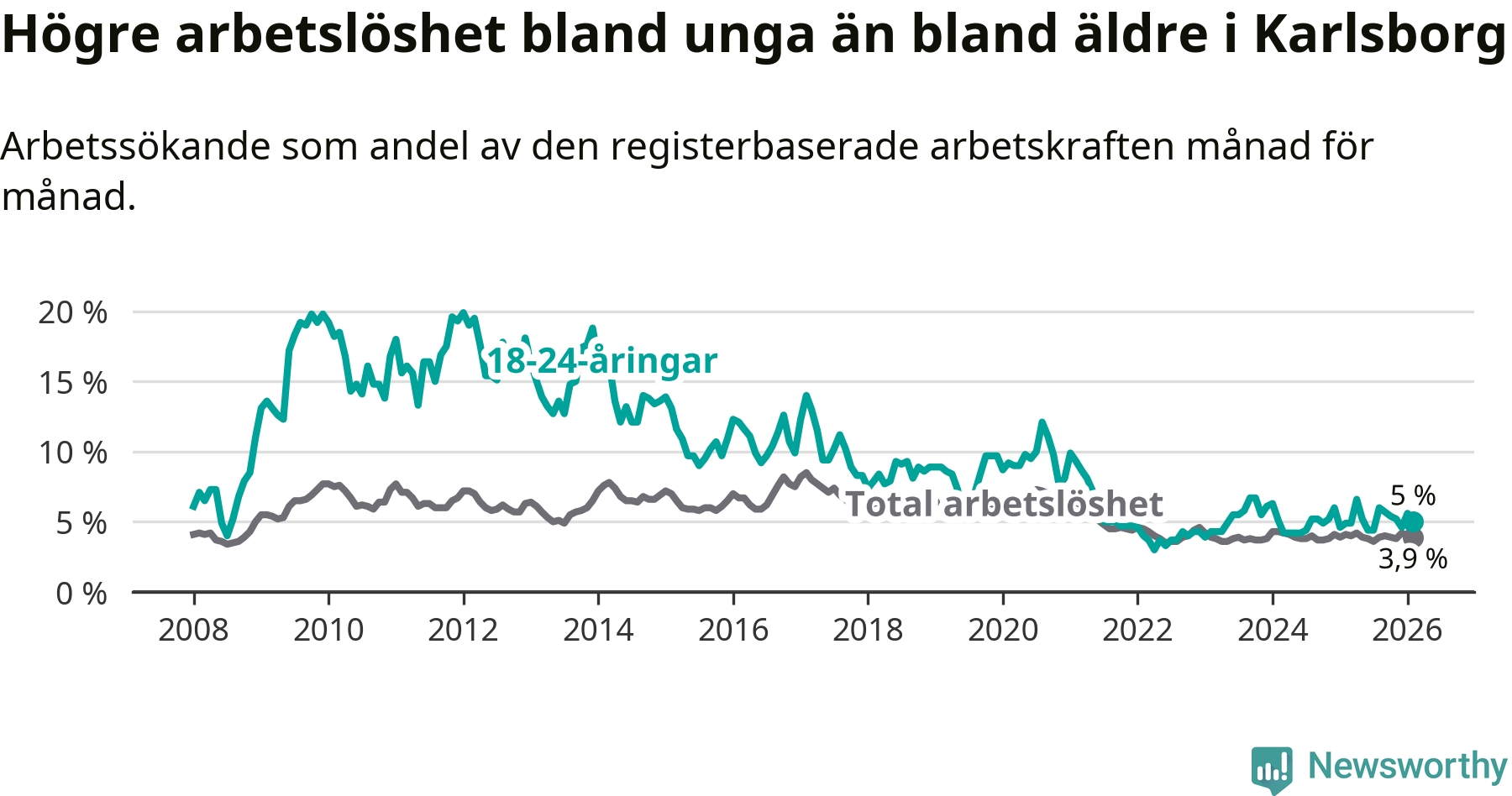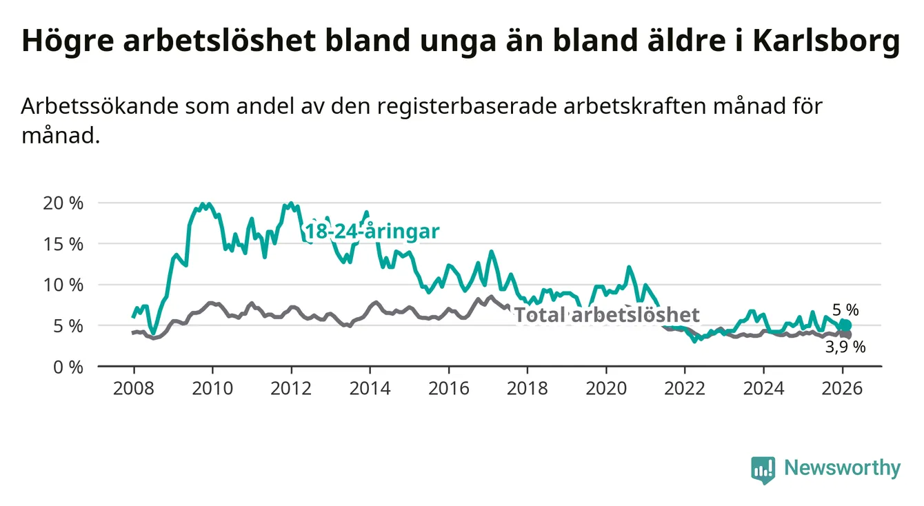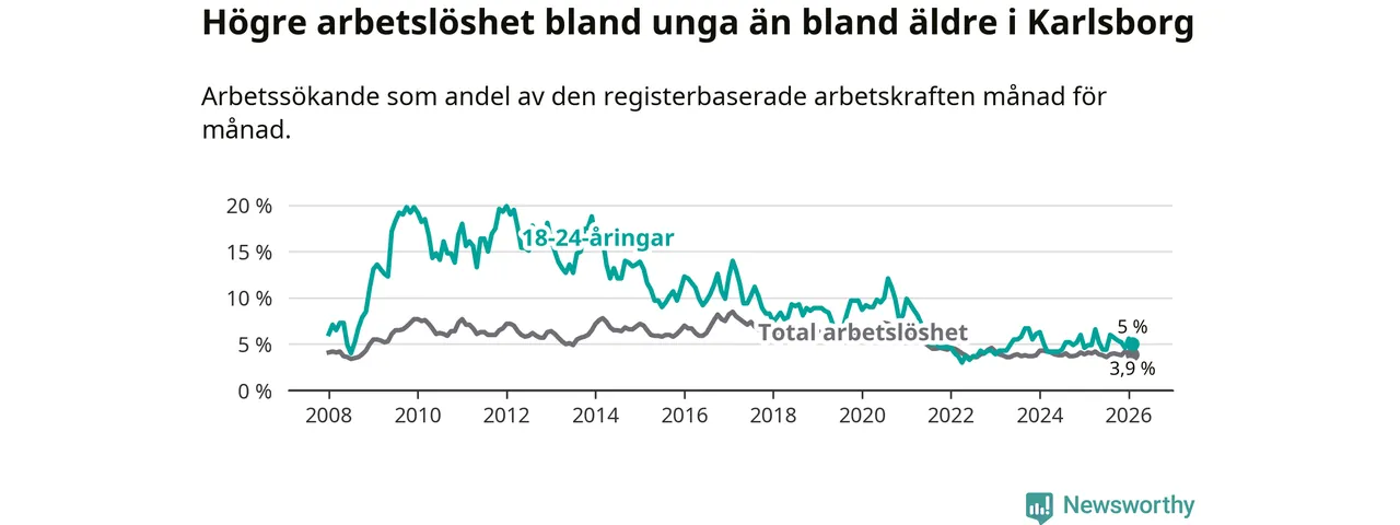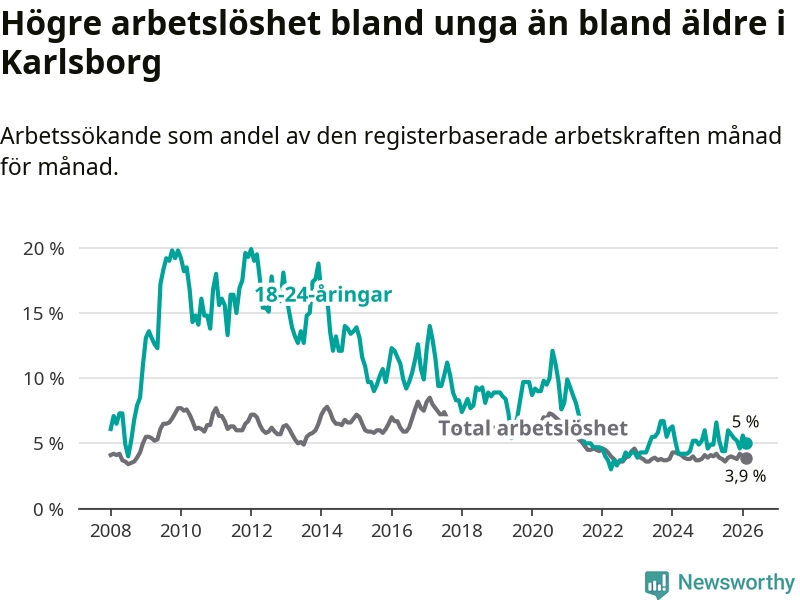 Till skillnad från den totala arbetslösheten stiger arbetslösheten bland unga (+0,1 procentenheter). I februari var 5,0 procent av 18–24-åringarna inskrivna som arbetssökande (motsvarande 19 personer). Mäter vi antalet inskrivna ser vi en ökning med ett personer på ett års sikt.