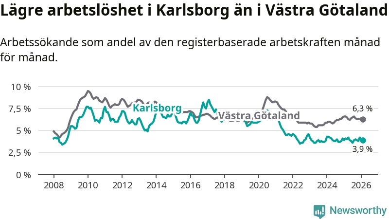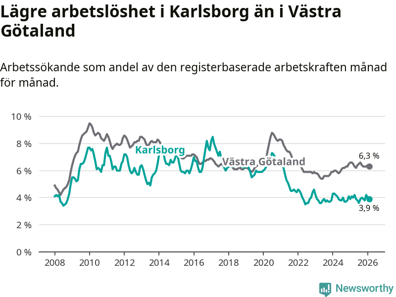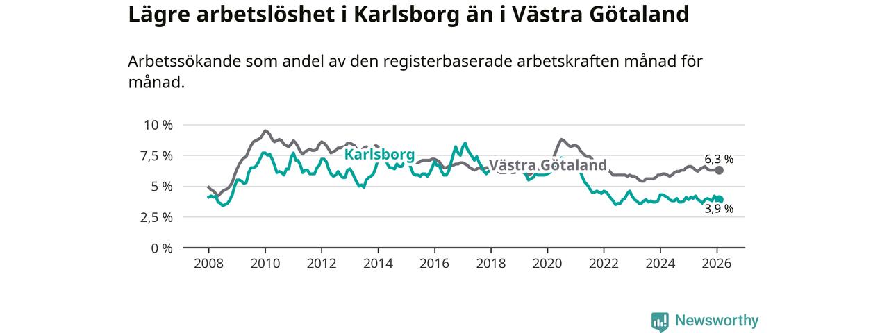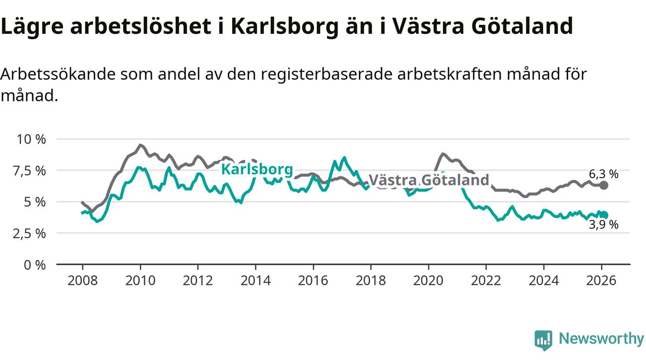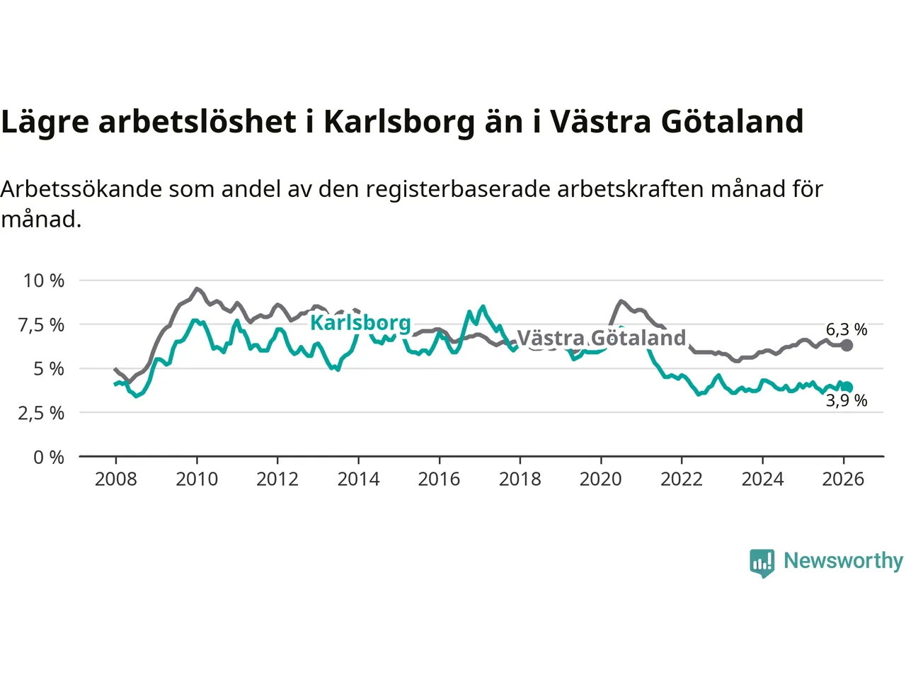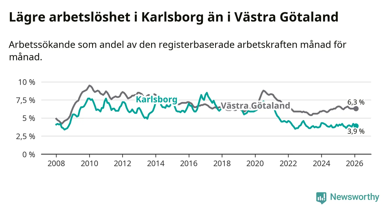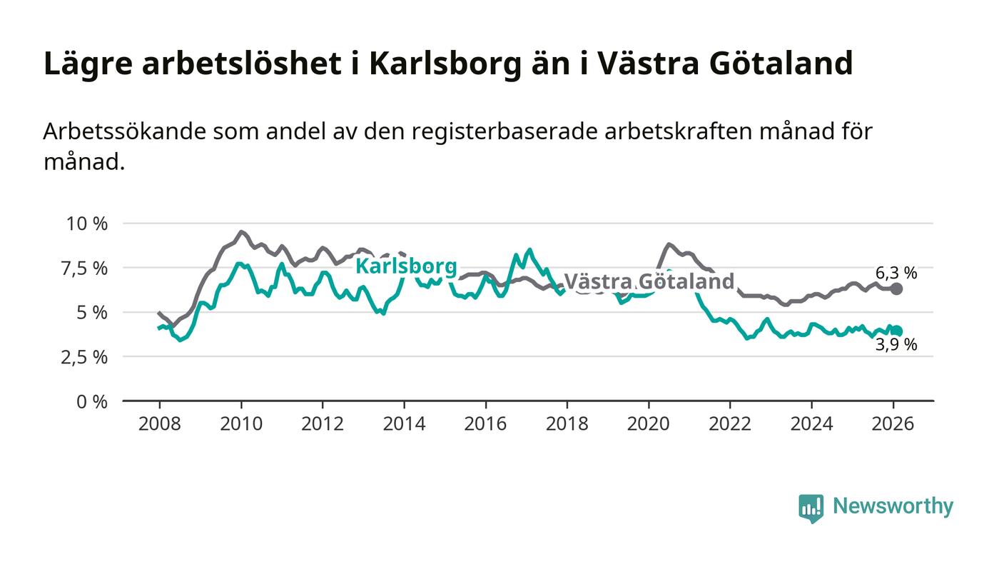 Under februari månad rapporterade Karlsborgs kommun en total arbetslöshet på 3,9 procent. Det är en minskning jämfört med samma tidpunkt i fjol (−0,2 procentenheter). Även i Västra Götalands län sjunker arbetslösheten .