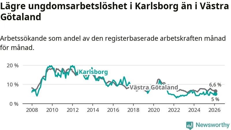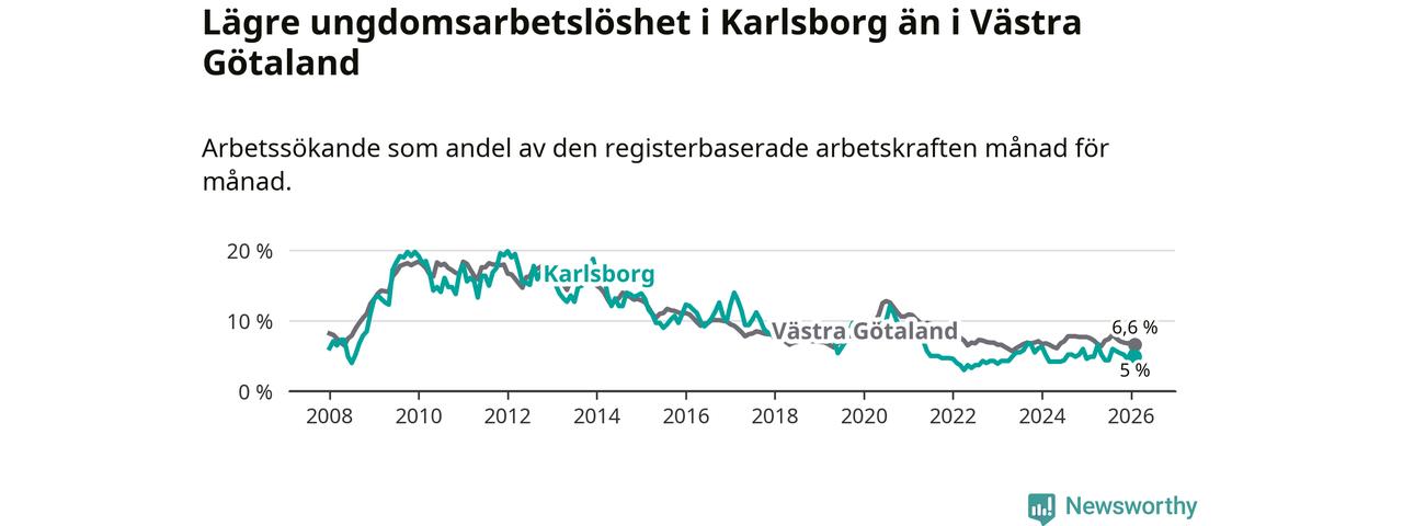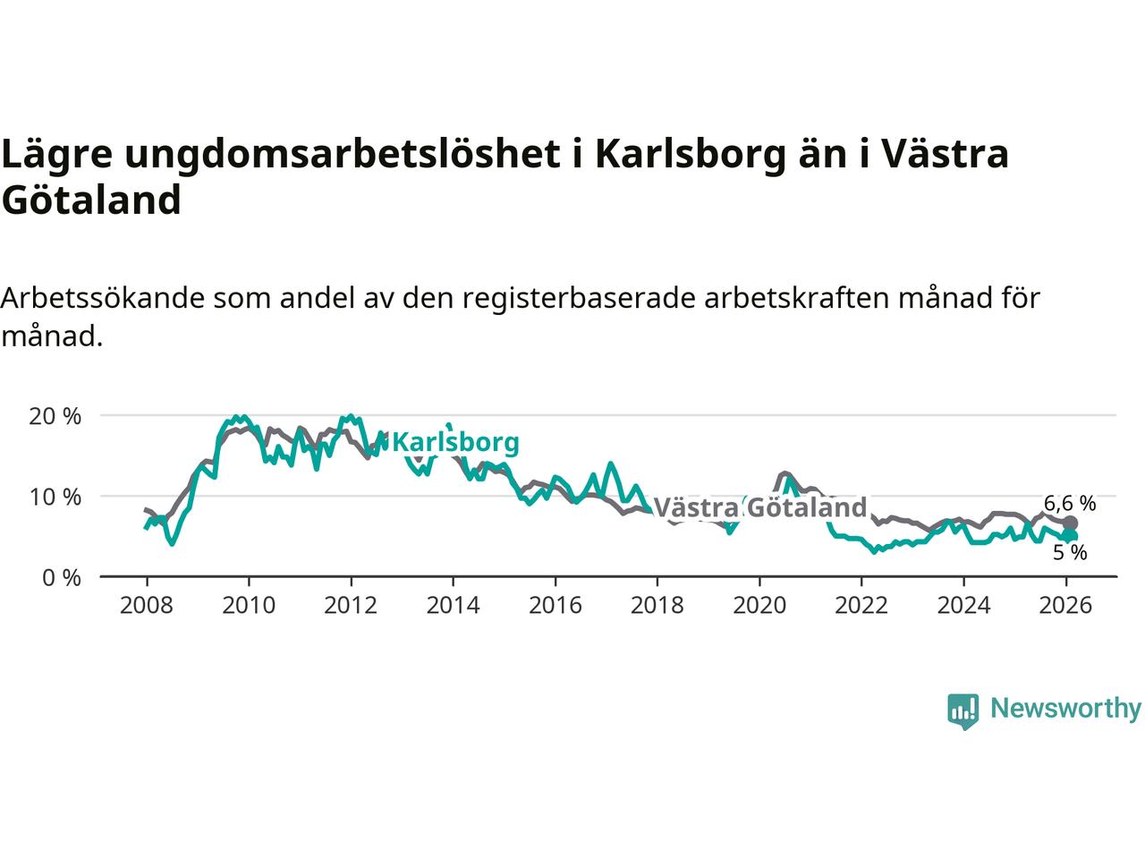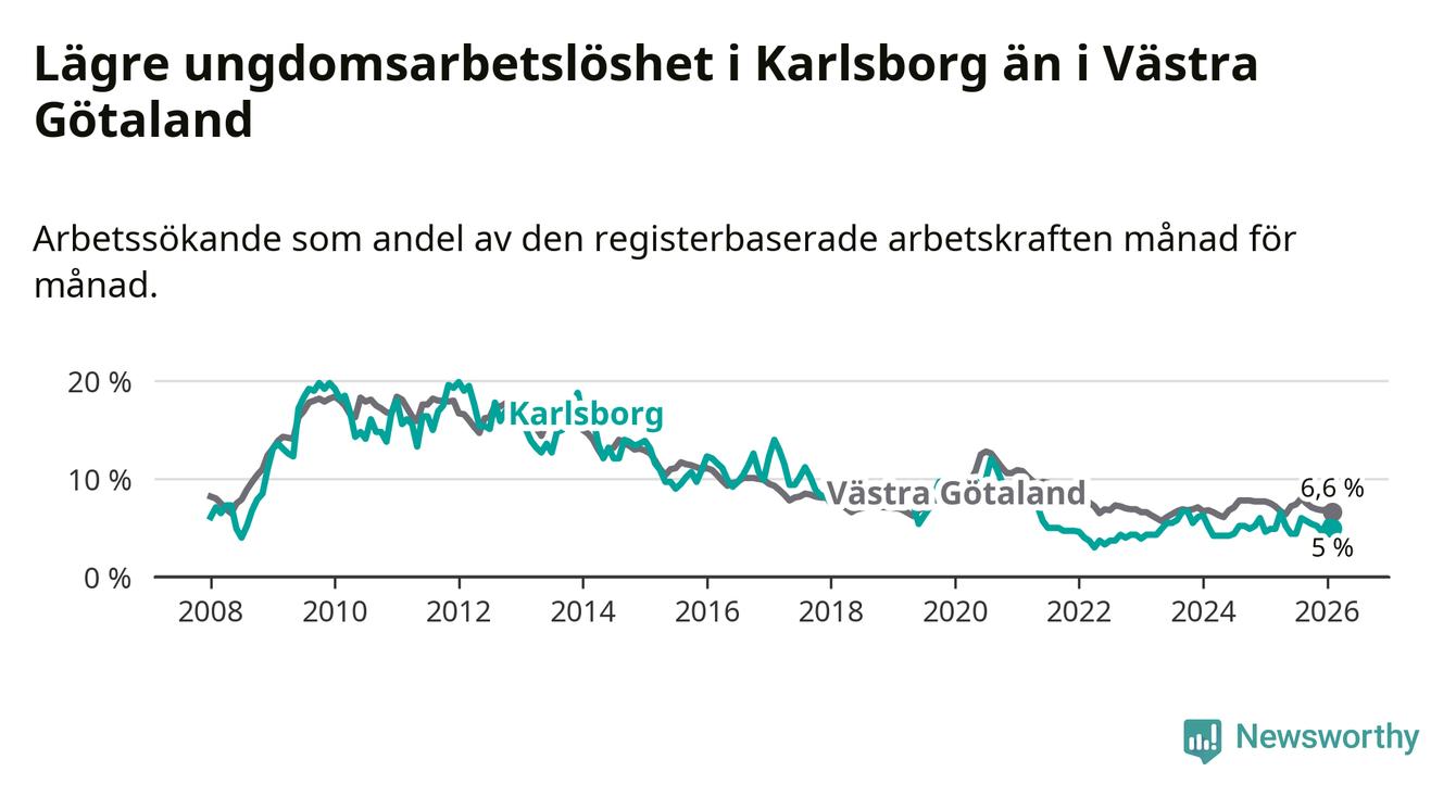 Precis som den totala arbetslösheten ligger ungdomsarbetslösheten i Karlsborg lägre än i Västra Götaland som helhet. Skillnaden mellan kommunen och länet är 1,6 procentenheter.
