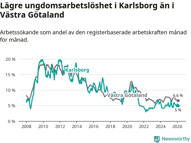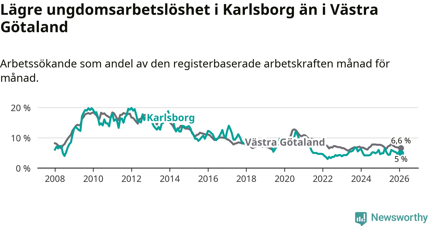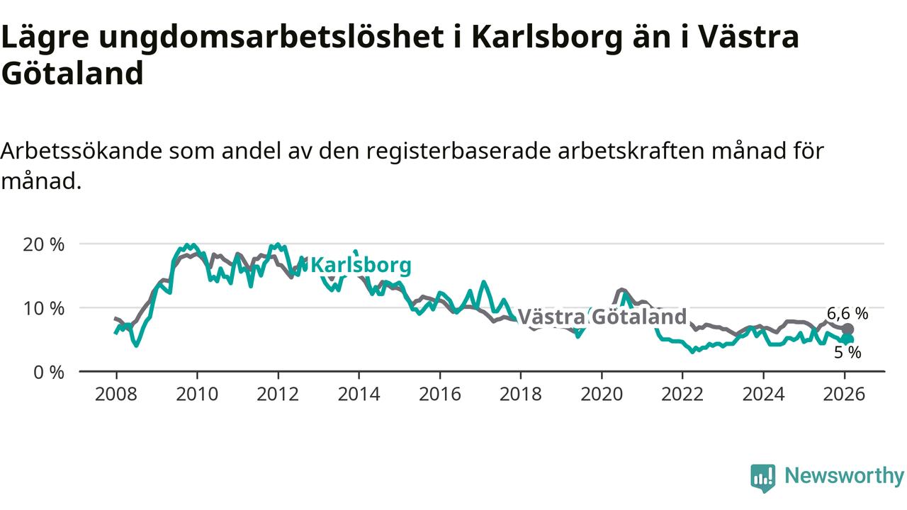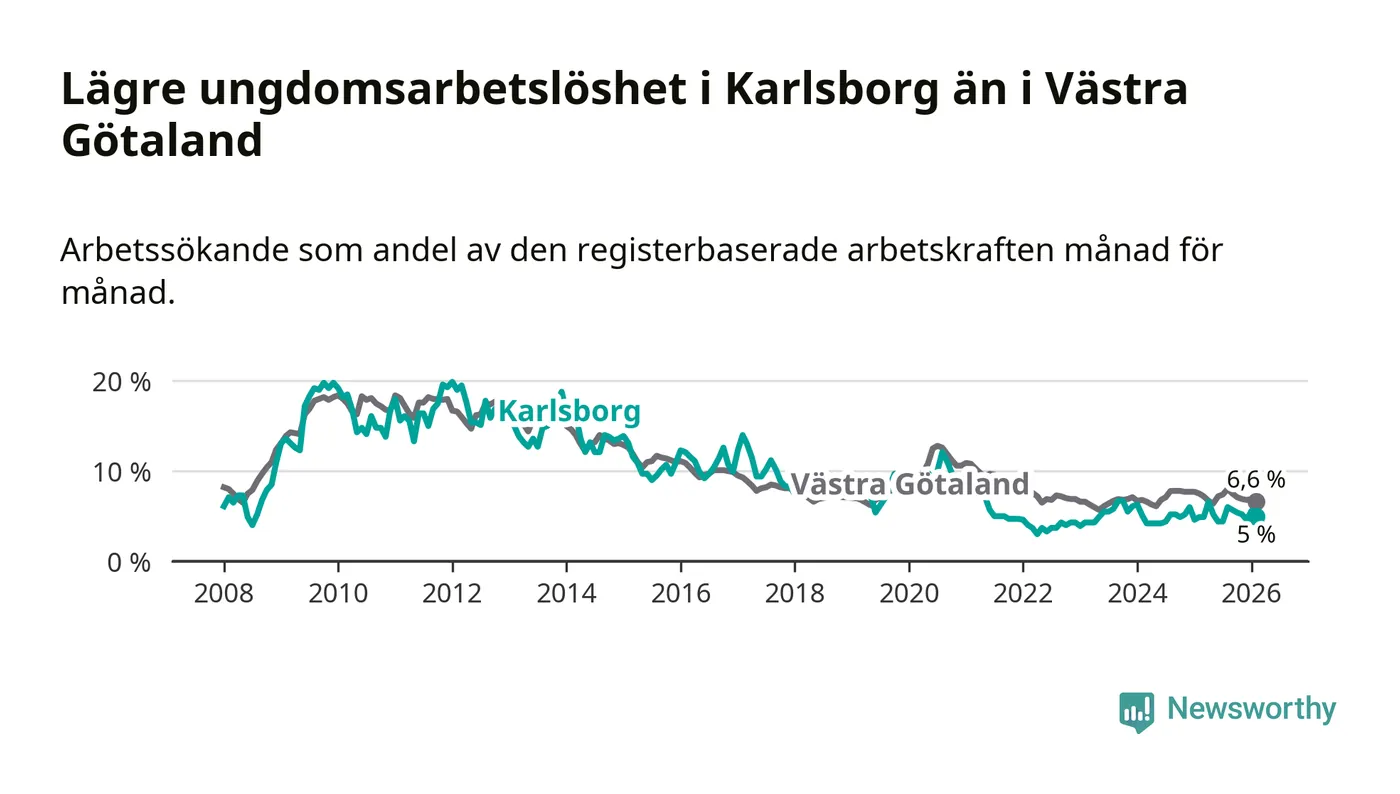 Precis som den totala arbetslösheten ligger ungdomsarbetslösheten i Karlsborg lägre än i Västra Götaland som helhet. Skillnaden mellan kommunen och länet är 1,6 procentenheter.