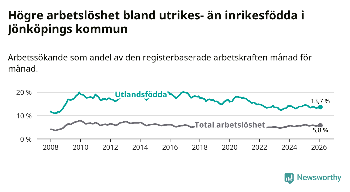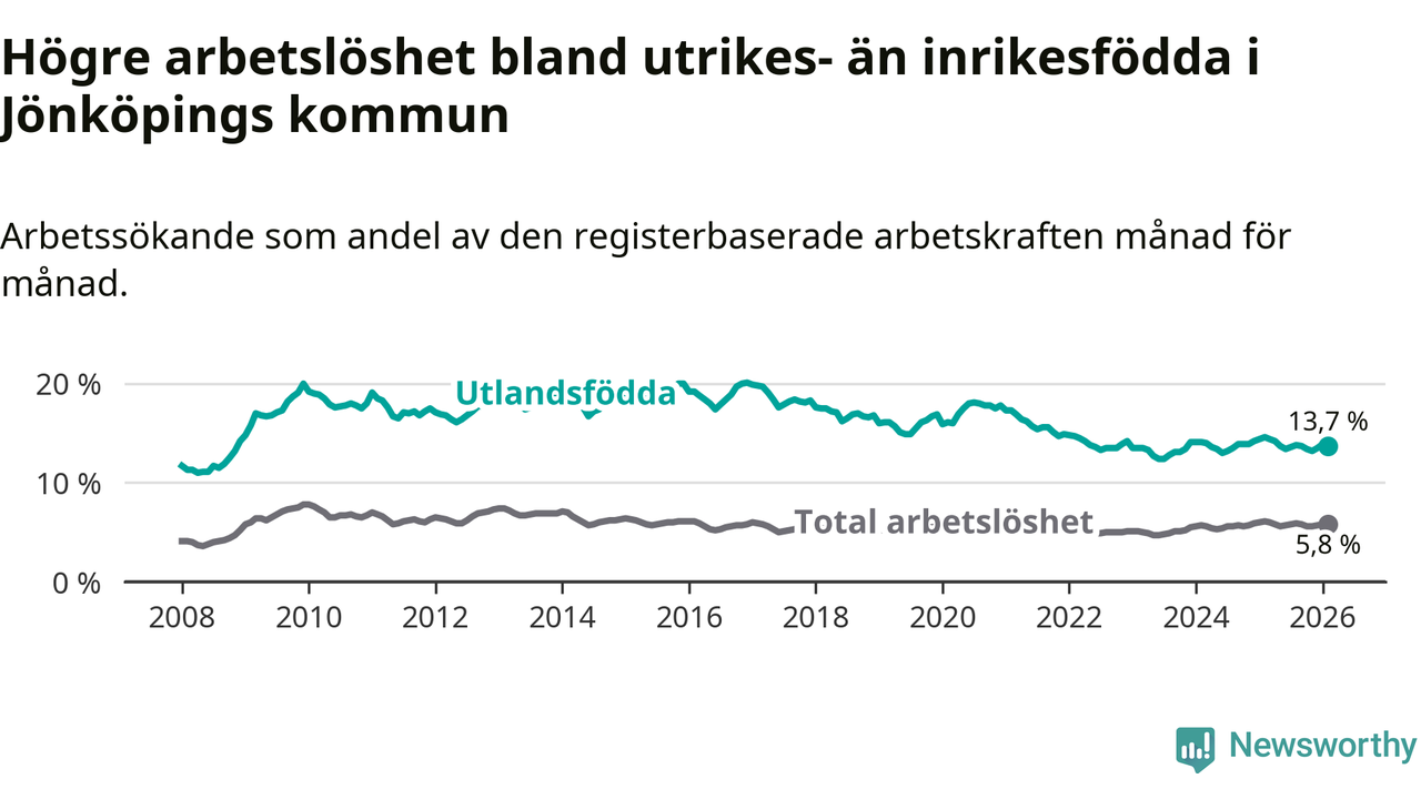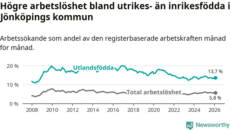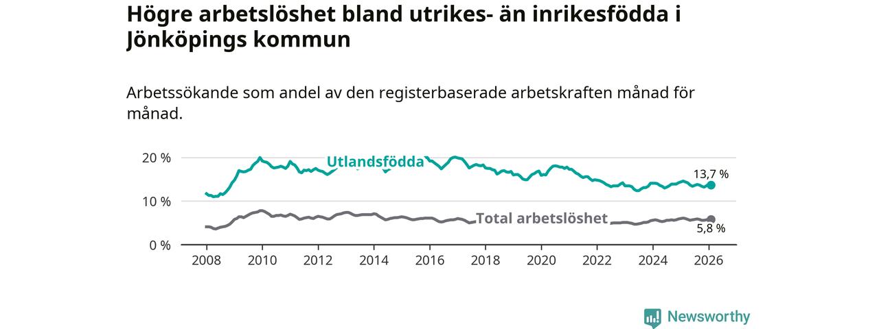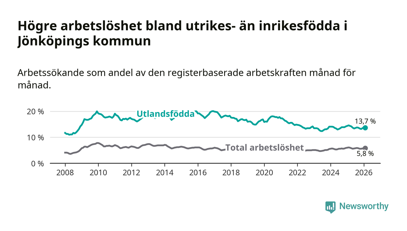 Skillnaden i arbetslöshet mellan utrikesfödda och hela befolkningen är 7,9 procentenheter i Jönköping. Det är en mindre skillnad än för ett år sedan (−0,6 procentenheter).