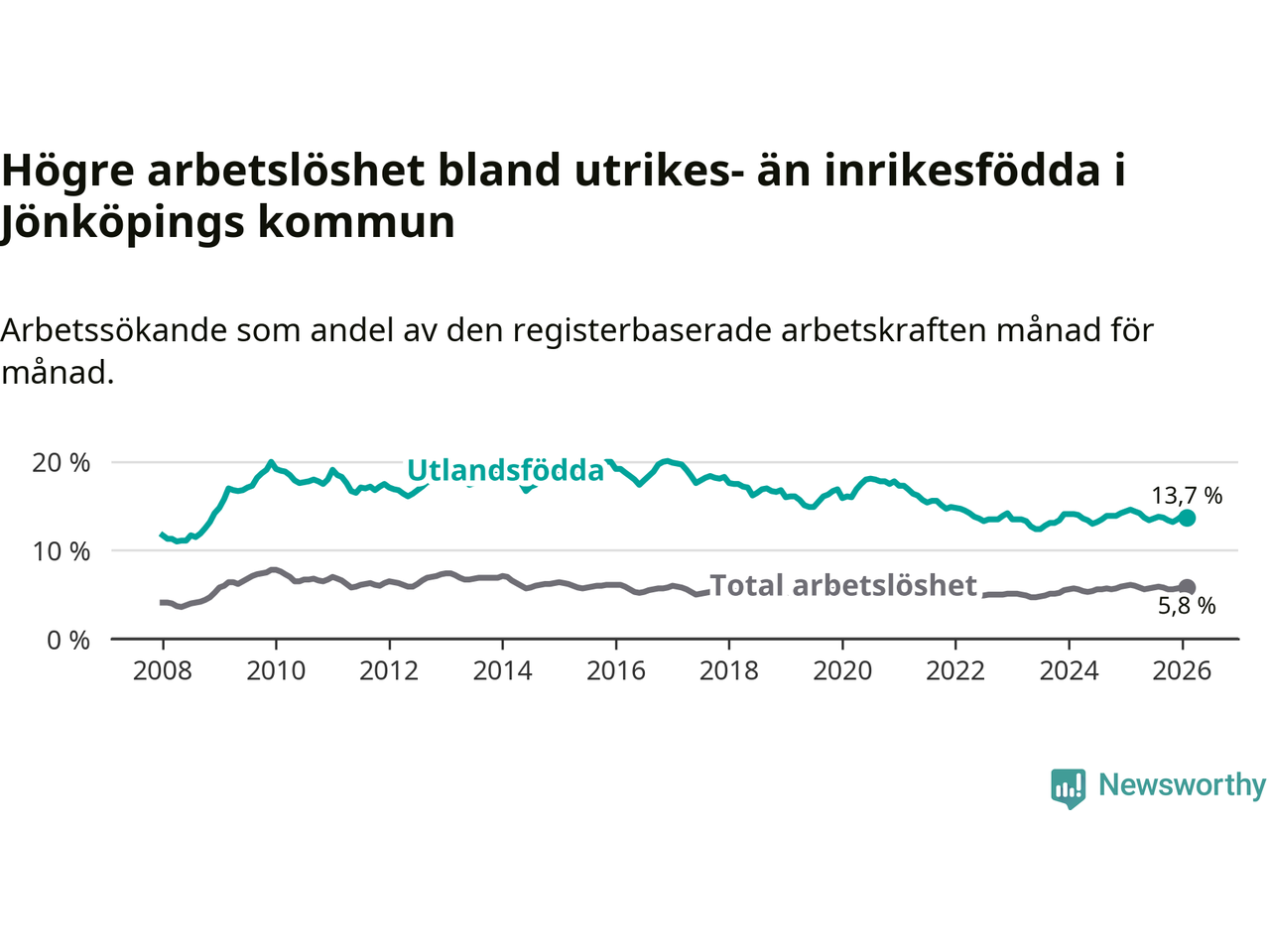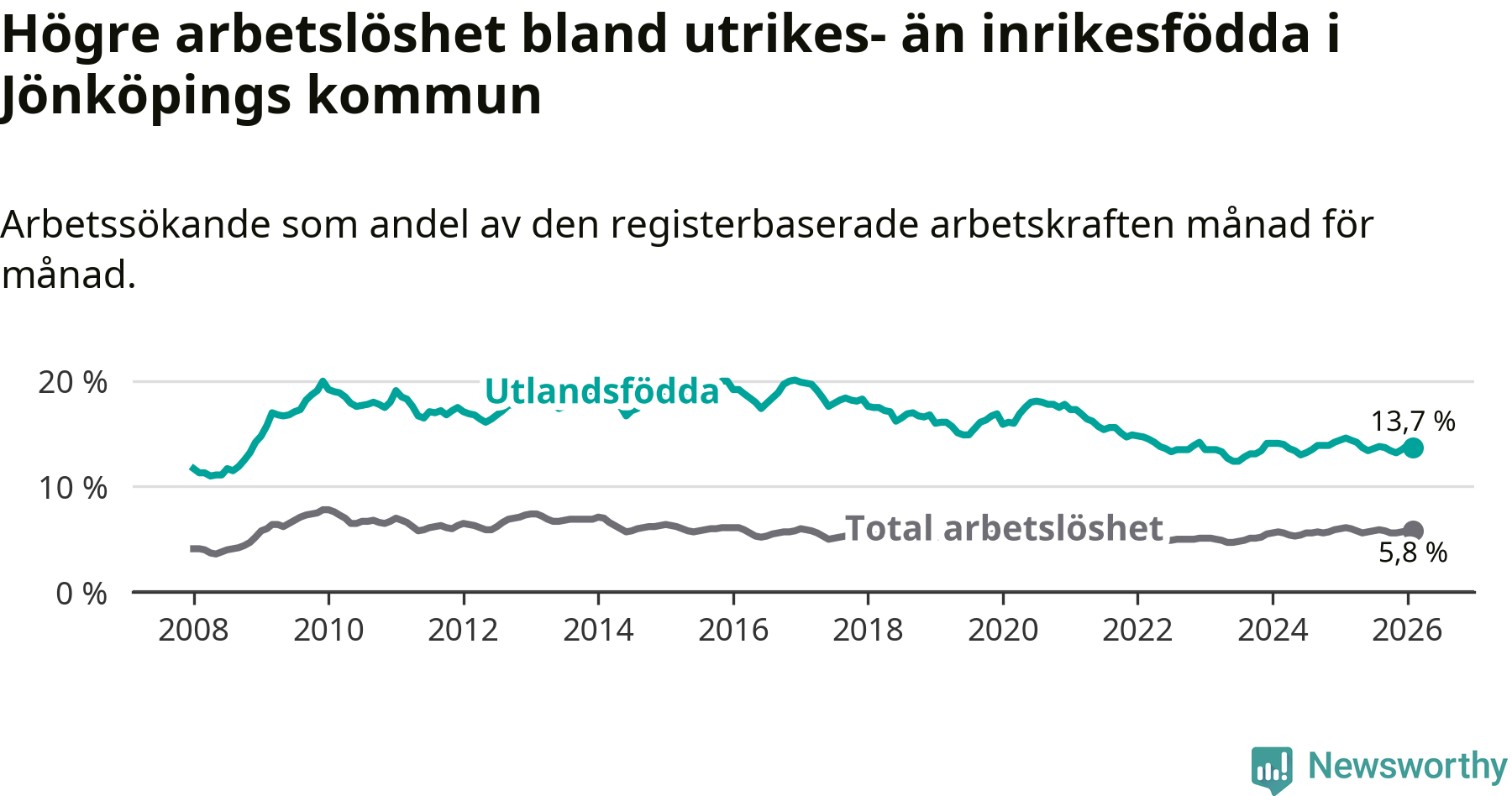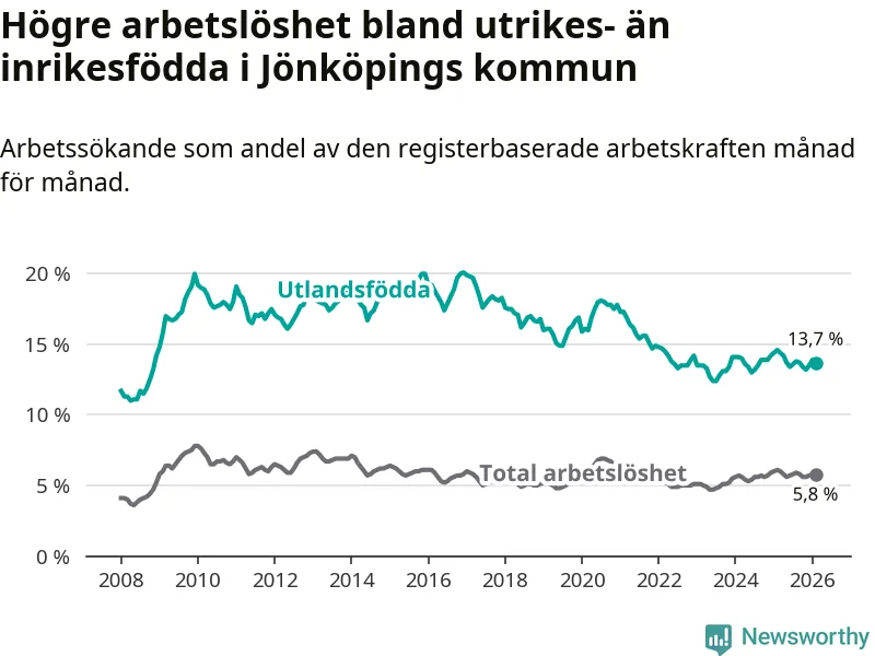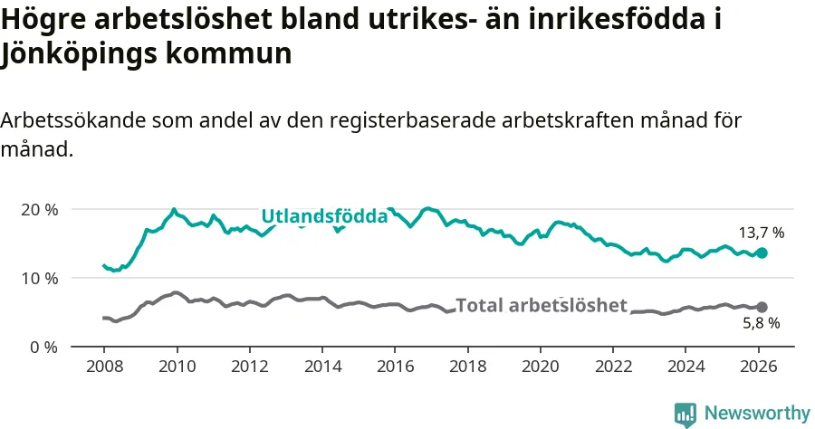 Skillnaden i arbetslöshet mellan utrikesfödda och hela befolkningen är 7,9 procentenheter i Jönköping. Det är en mindre skillnad än för ett år sedan (−0,6 procentenheter).