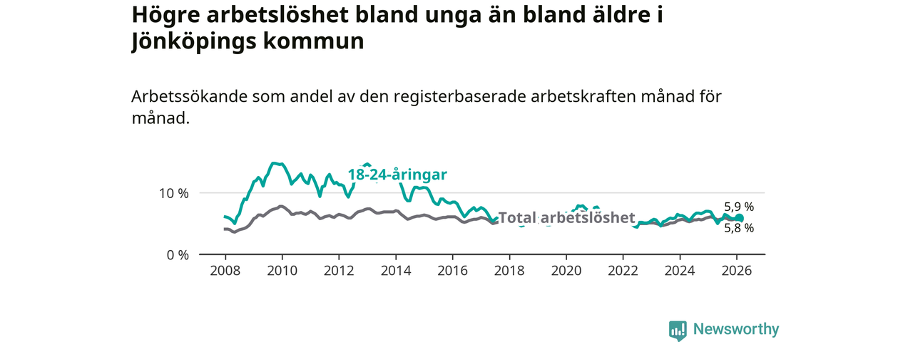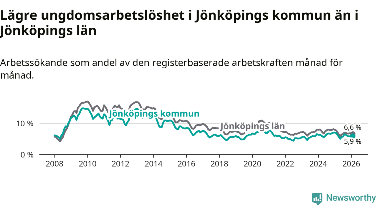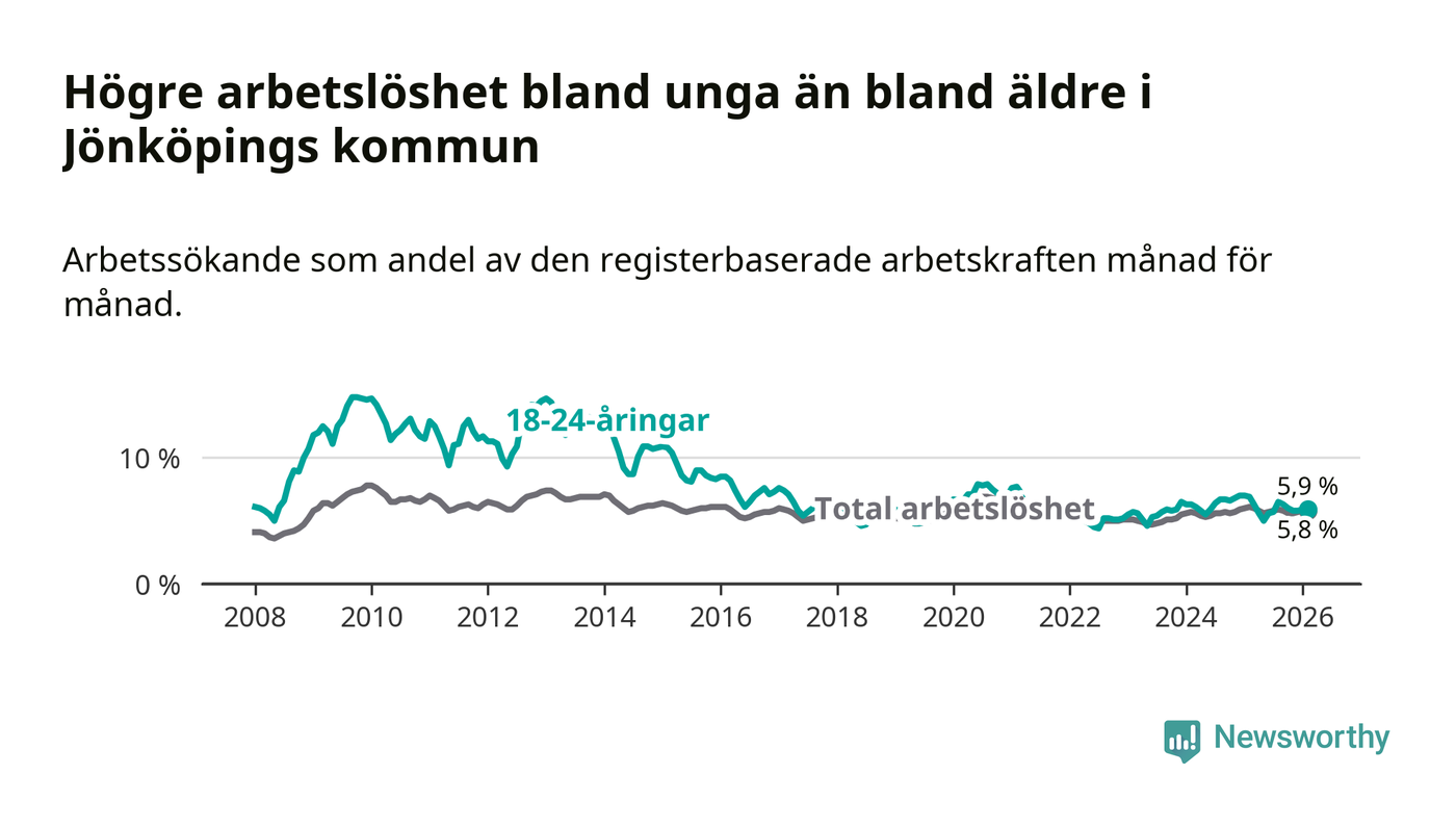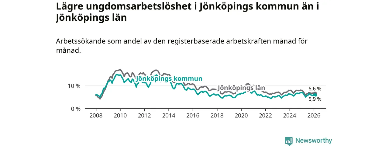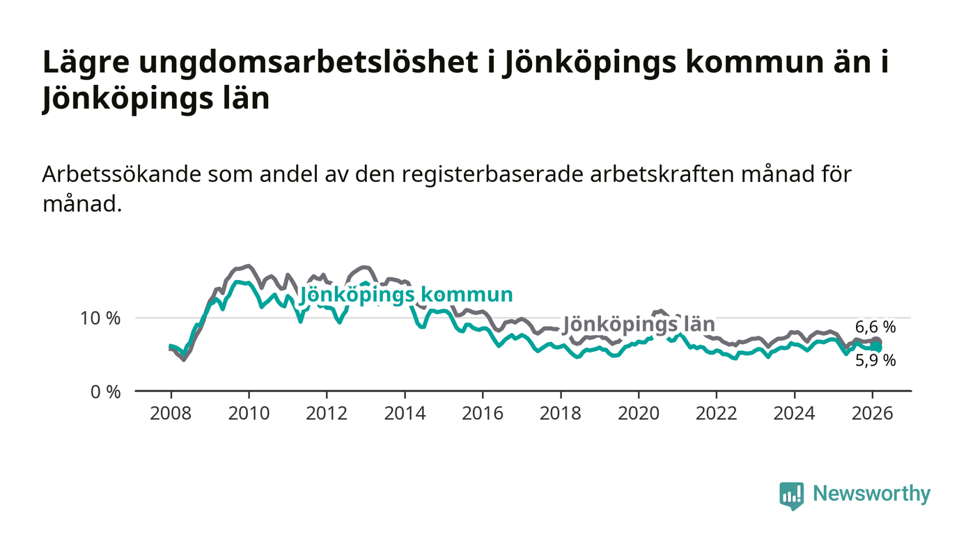 I och med den senaste månadens nedgång har de ungas arbetslöshet i Jönköping sjunkit elva månader i följd (ner från 6,3 procent i mars 2025 till 5,9 procent nu).