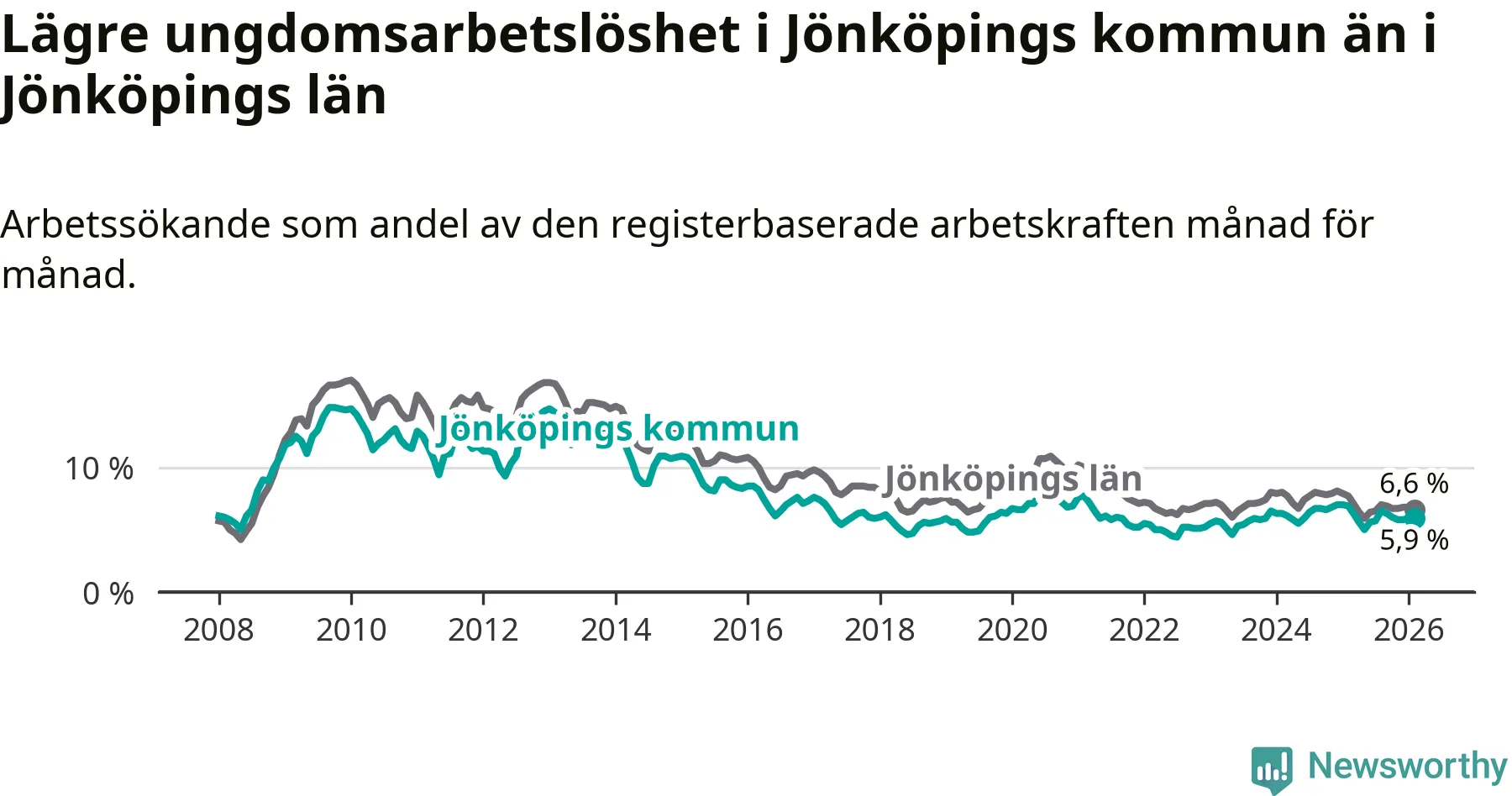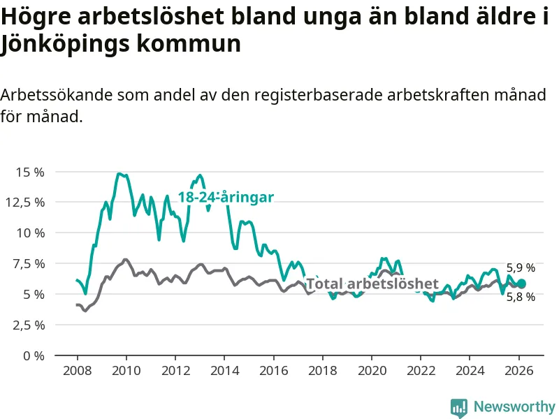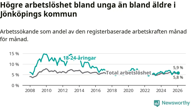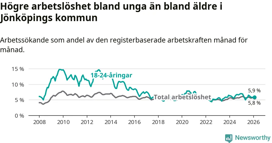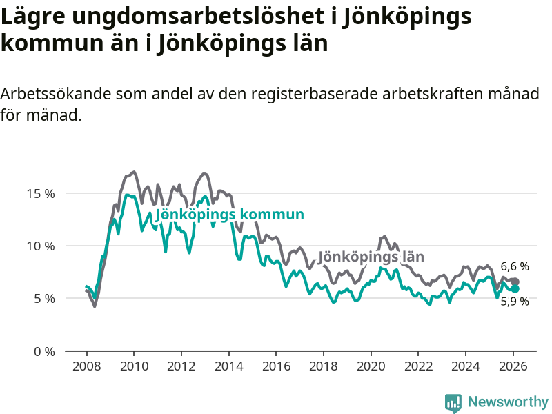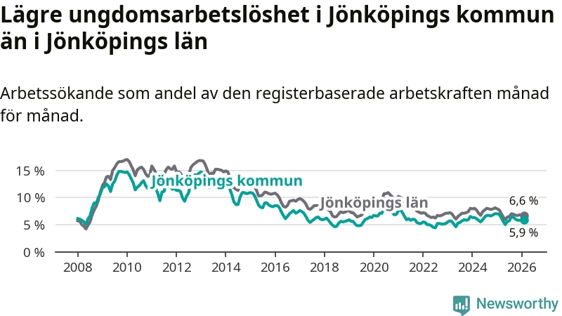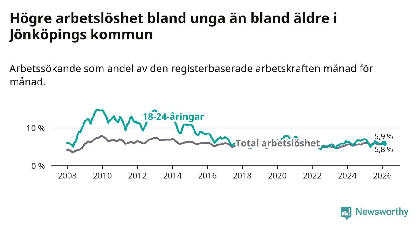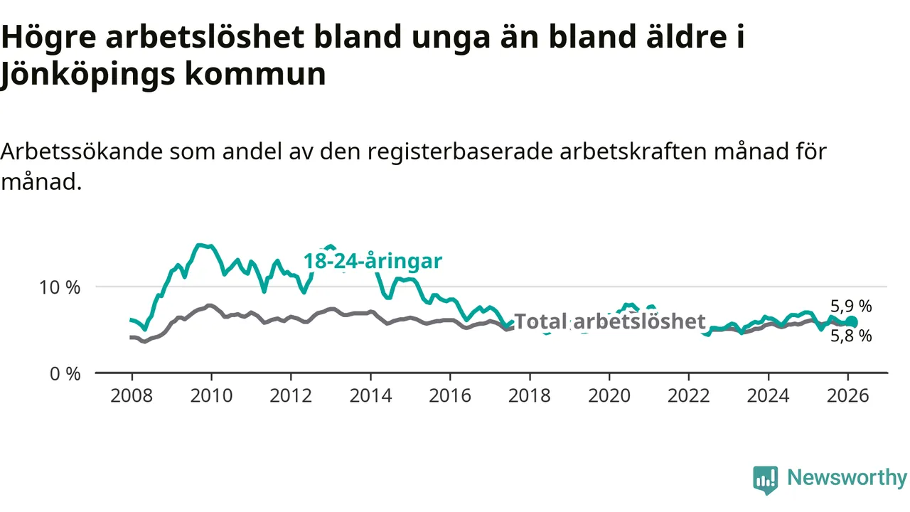 I och med den senaste månadens nedgång har de ungas arbetslöshet i Jönköping sjunkit elva månader i följd (ner från 6,3 procent i mars 2025 till 5,9 procent nu).