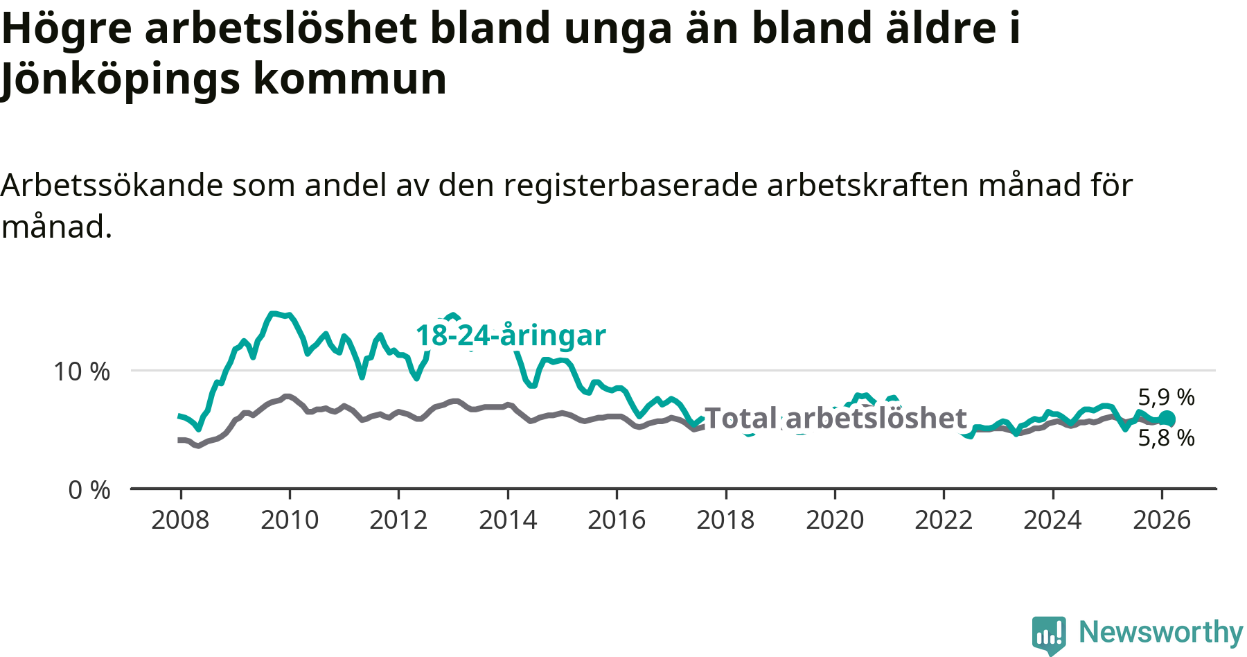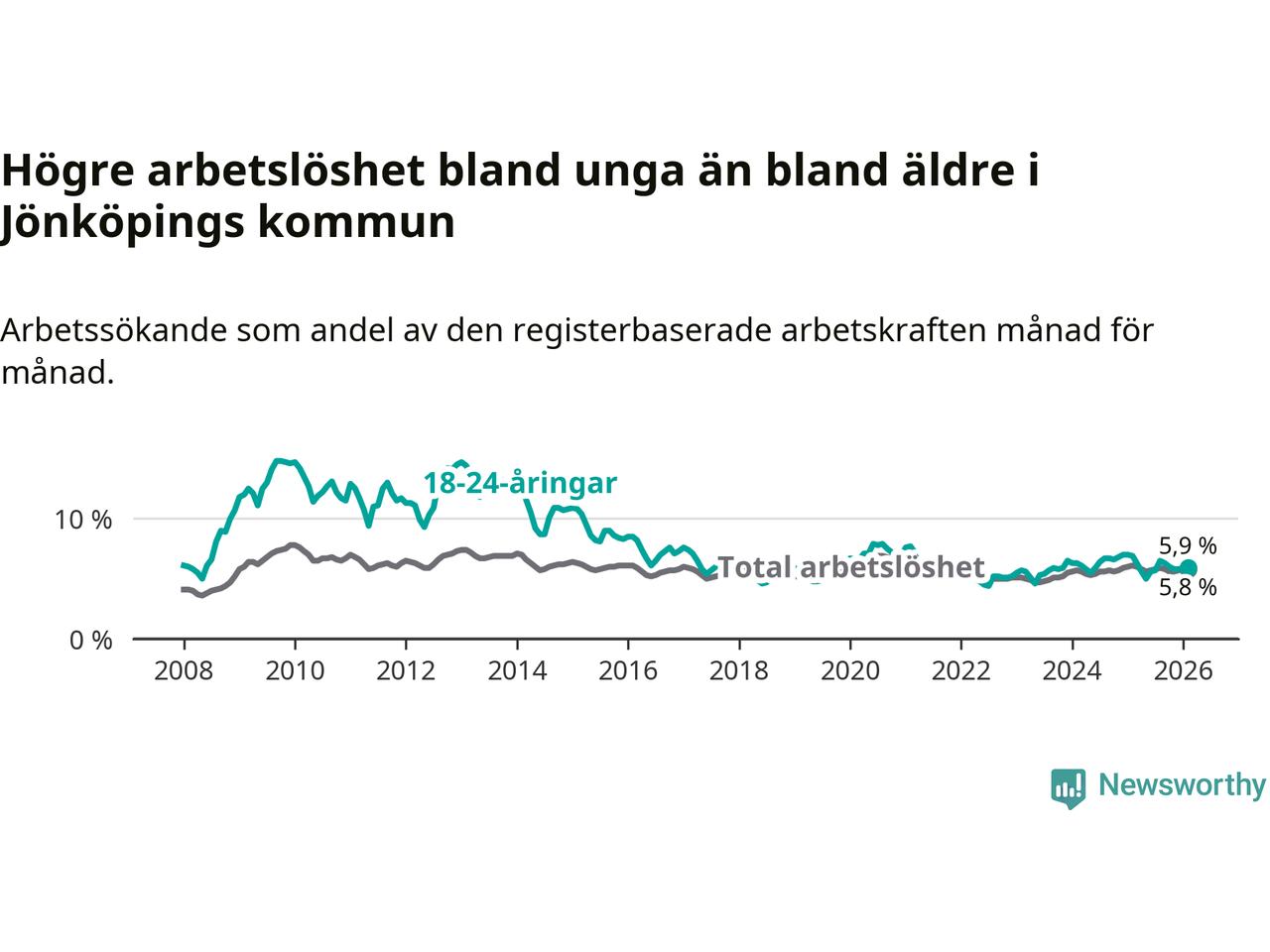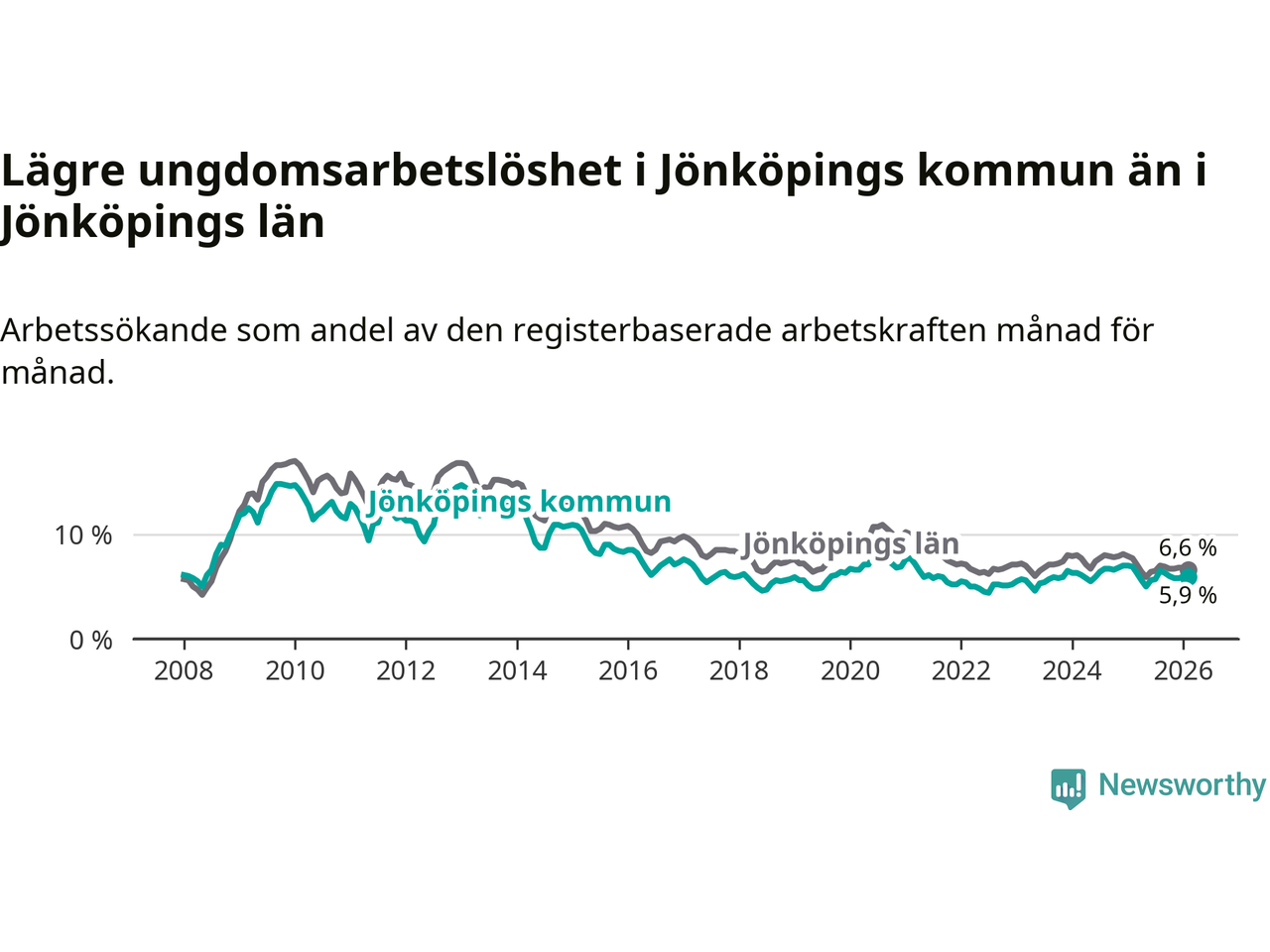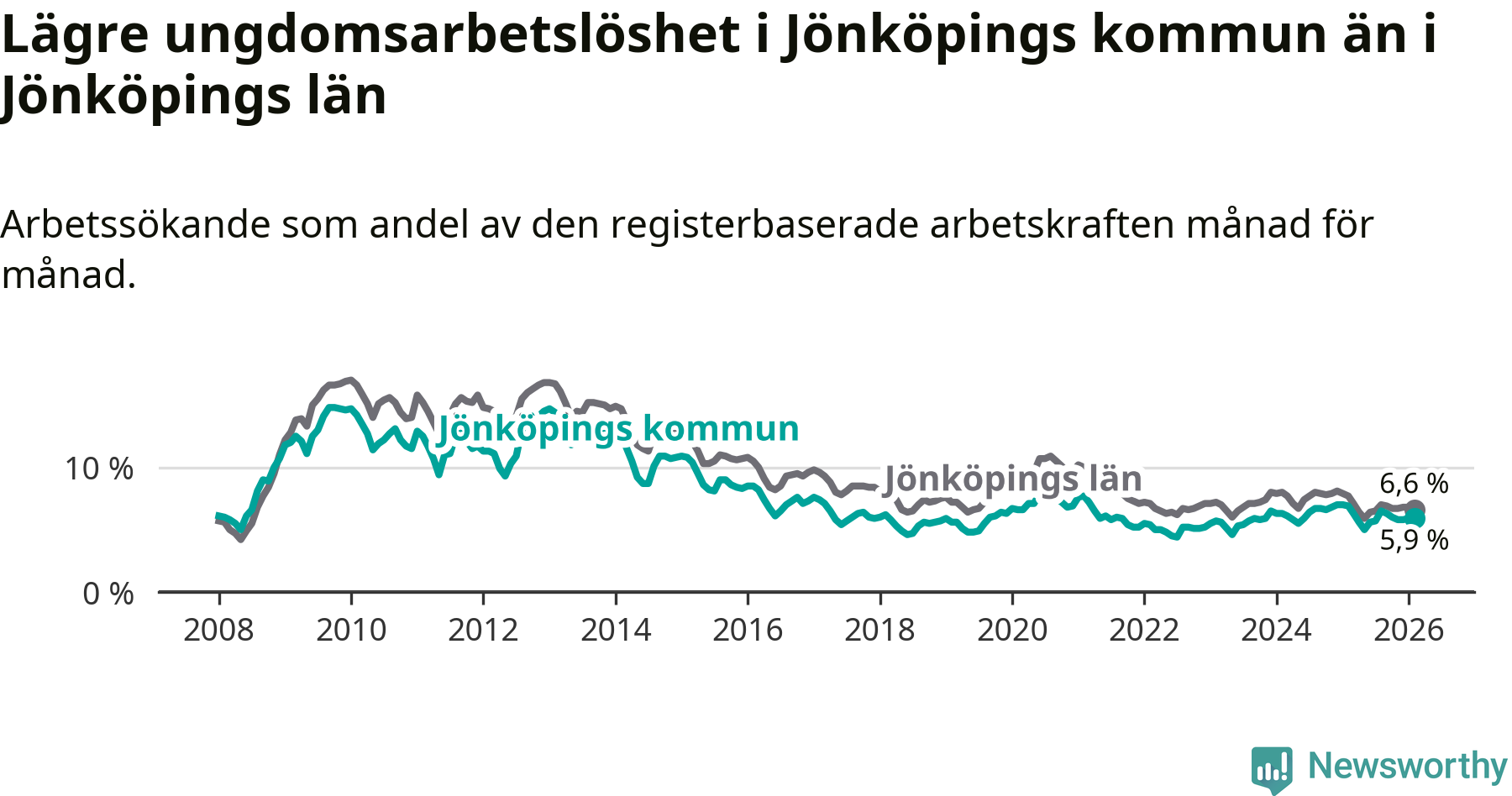 I och med den senaste månadens nedgång har de ungas arbetslöshet i Jönköping sjunkit elva månader i följd (ner från 6,3 procent i mars 2025 till 5,9 procent nu).