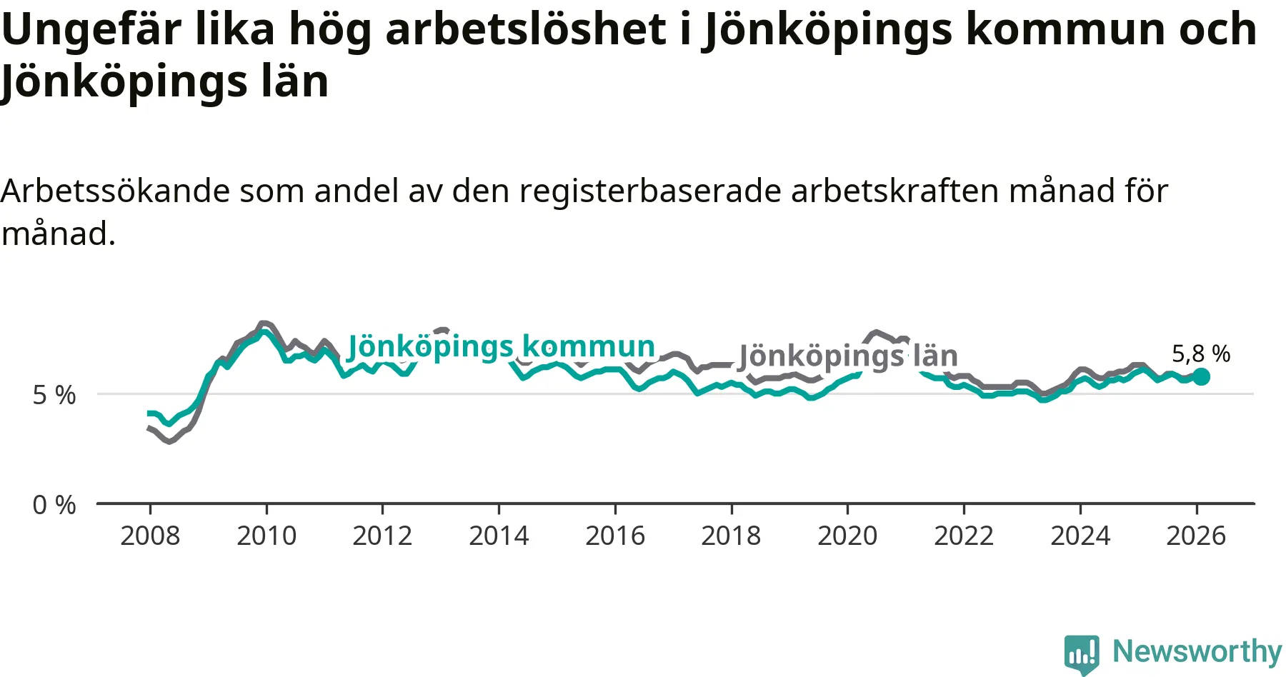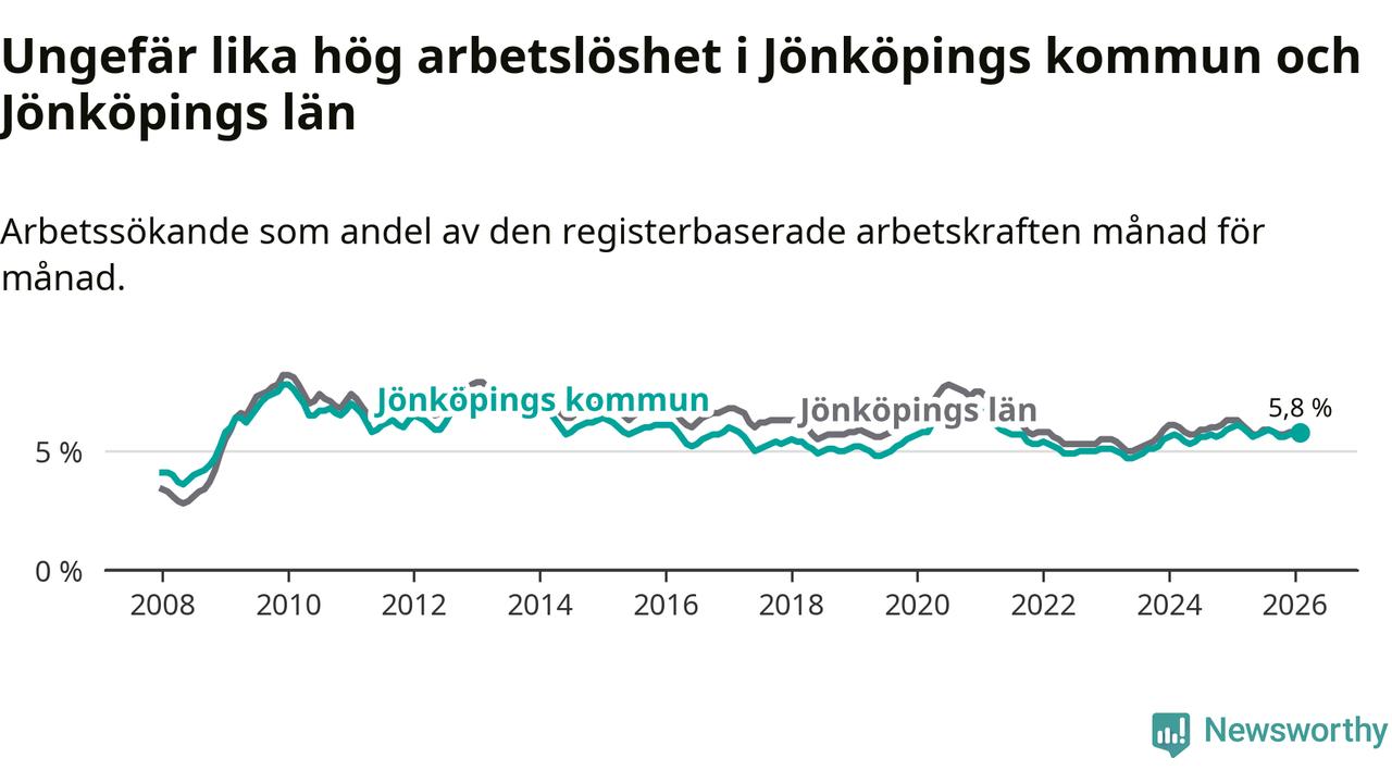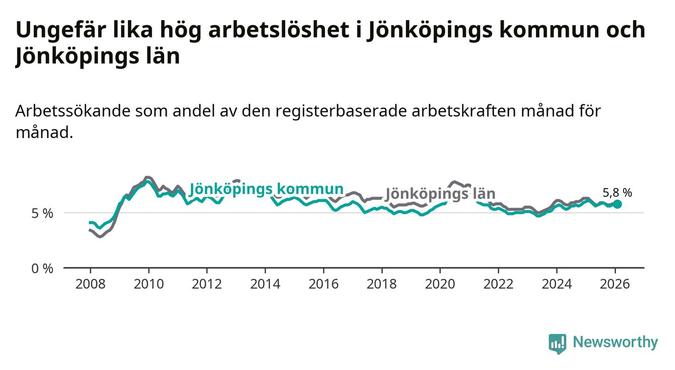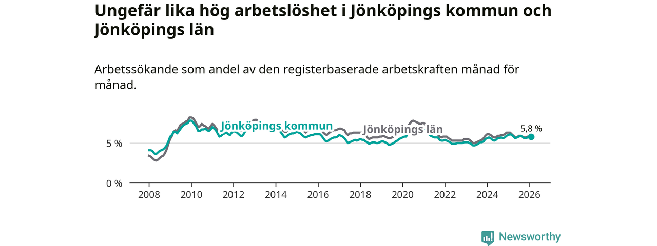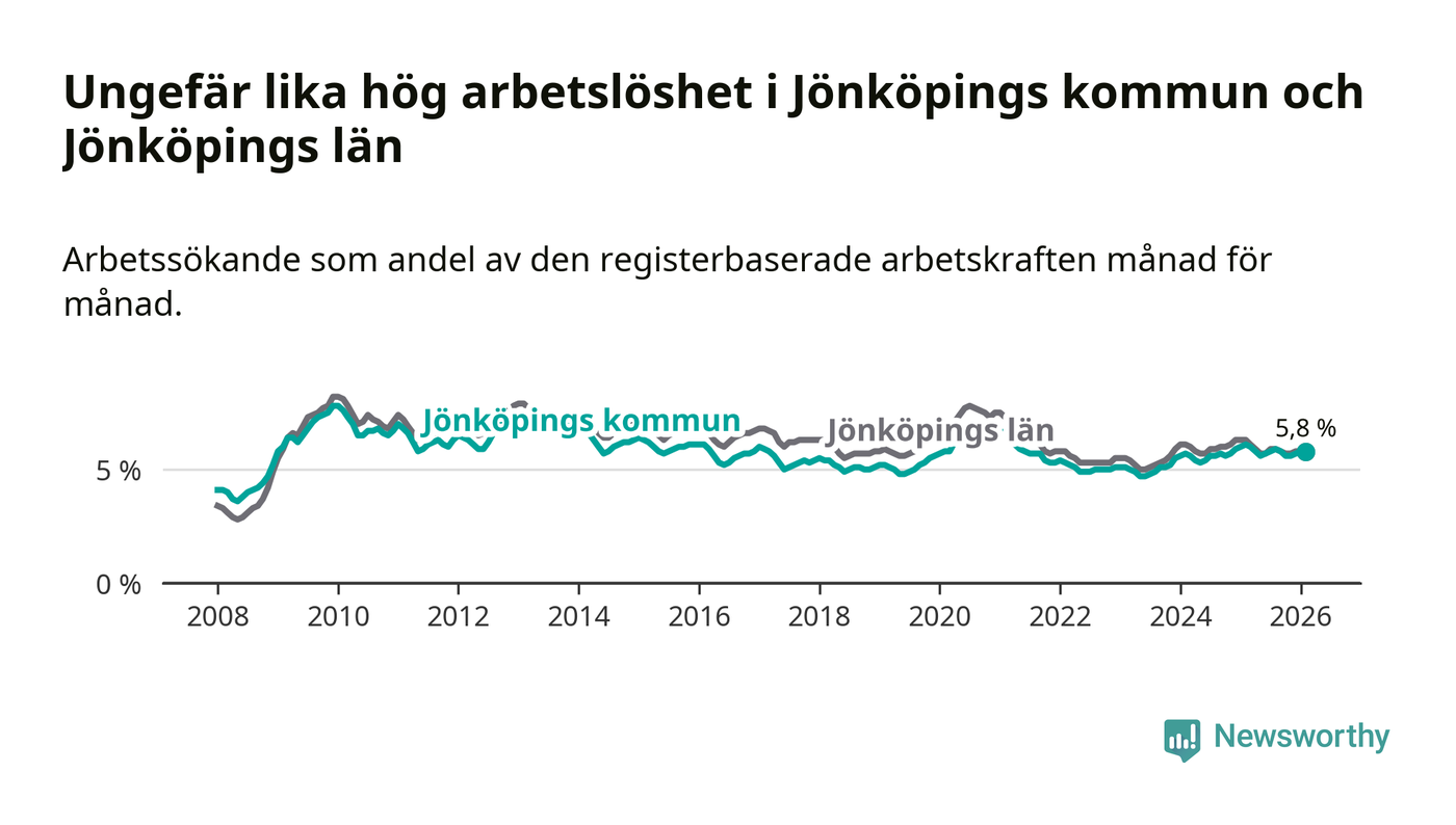 Under februari månad rapporterade Jönköpings kommun en total arbetslöshet på 5,8 procent. Det är en minskning jämfört med samma tidpunkt i fjol (−0,3 procentenheter). Även i Jönköpings län sjunker arbetslösheten .