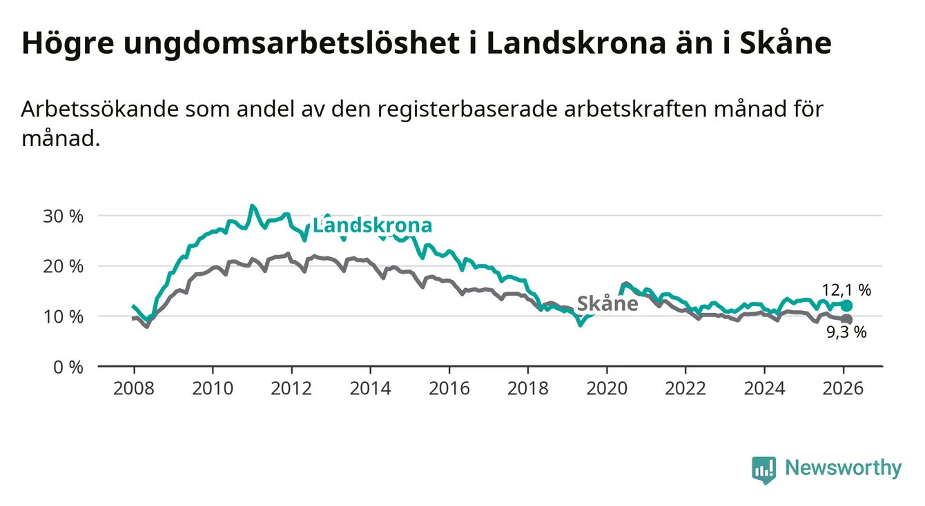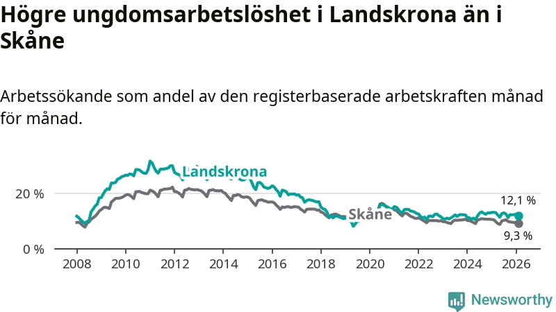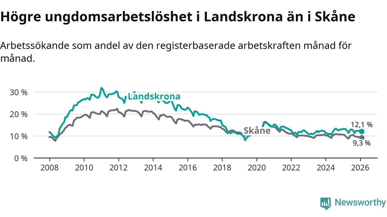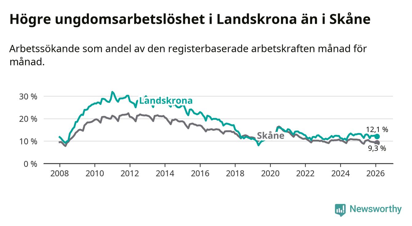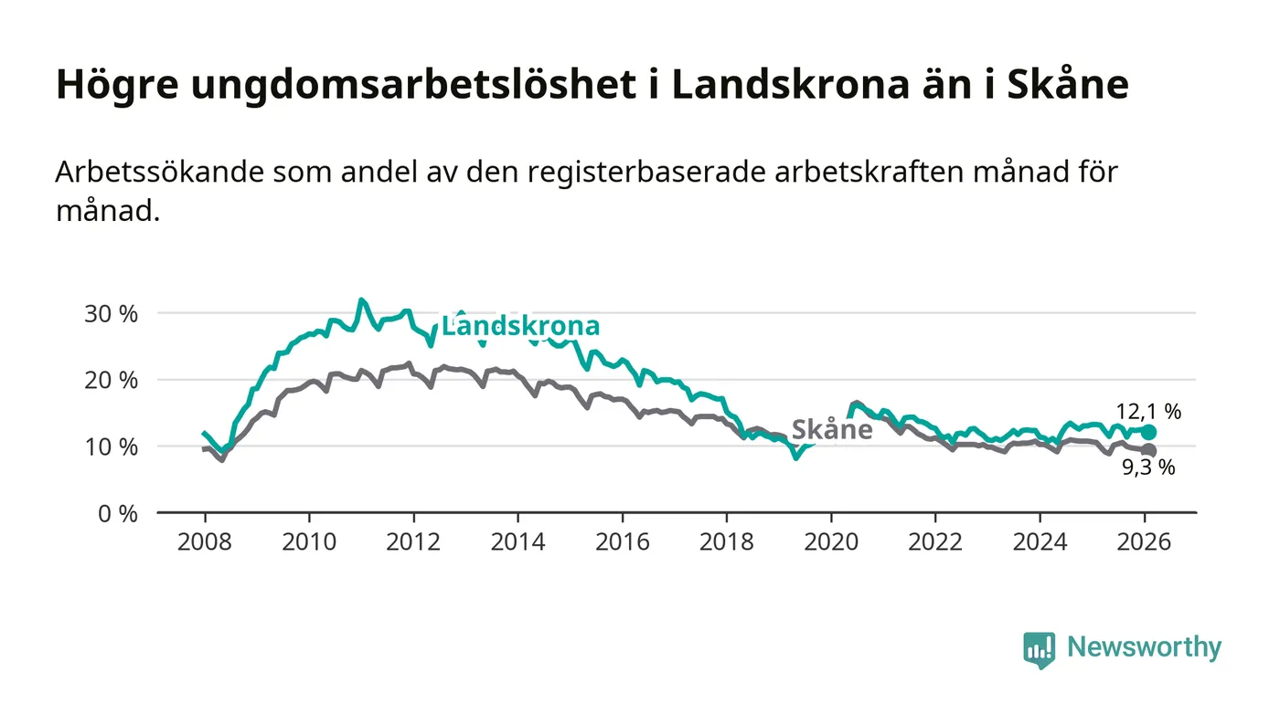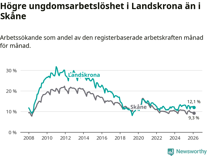 Precis som den totala arbetslösheten ligger ungdomsarbetslösheten i Landskrona högre än i Skåne som helhet. Skillnaden mellan kommunen och länet är 2,8 procentenheter.