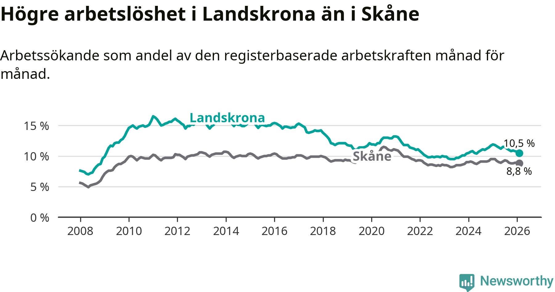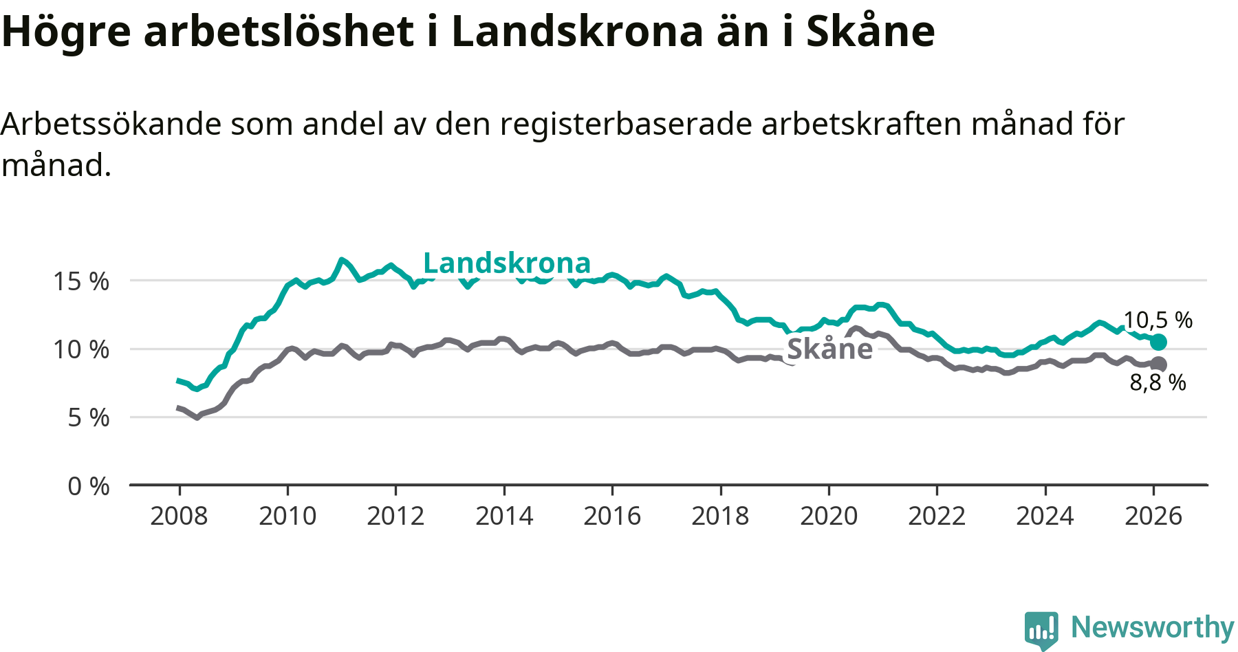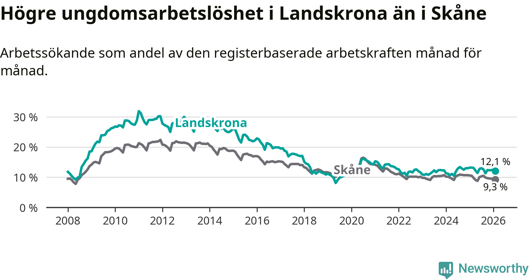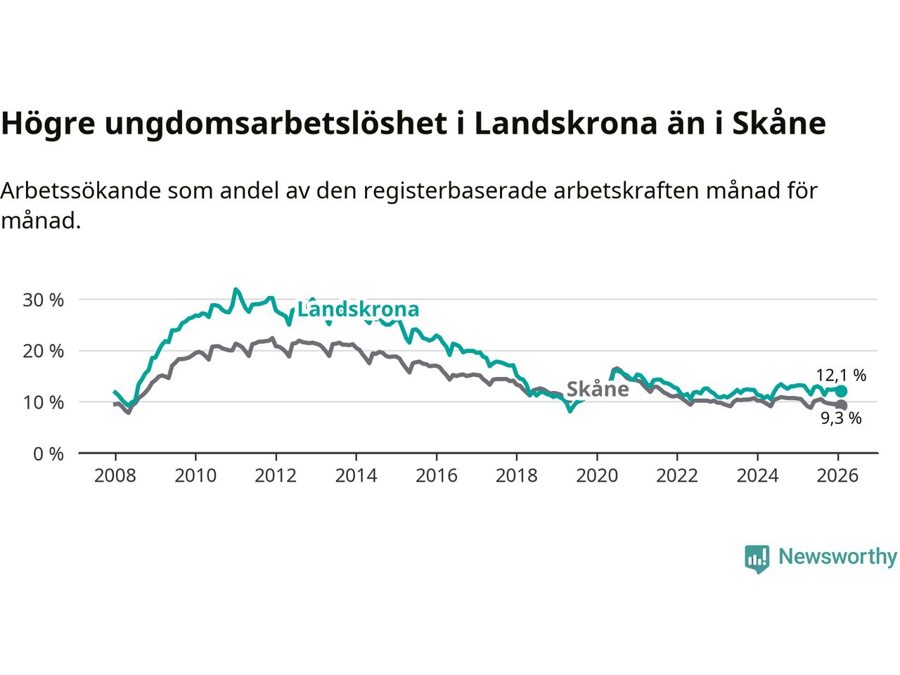Precis som den totala arbetslösheten ligger ungdomsarbetslösheten i Landskrona högre än i Skåne som helhet. Skillnaden mellan kommunen och länet är 2,8 procentenheter.