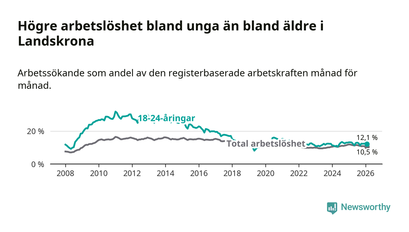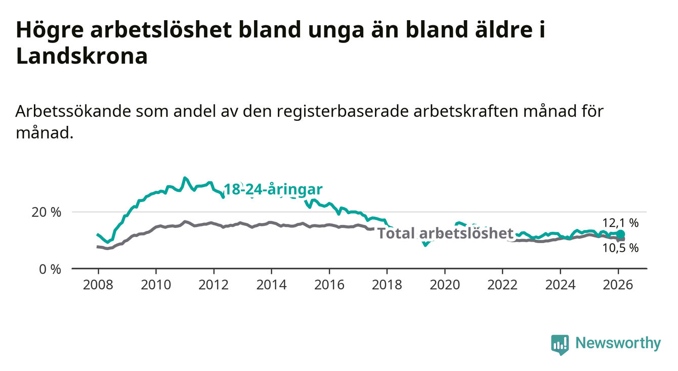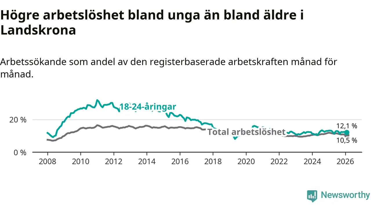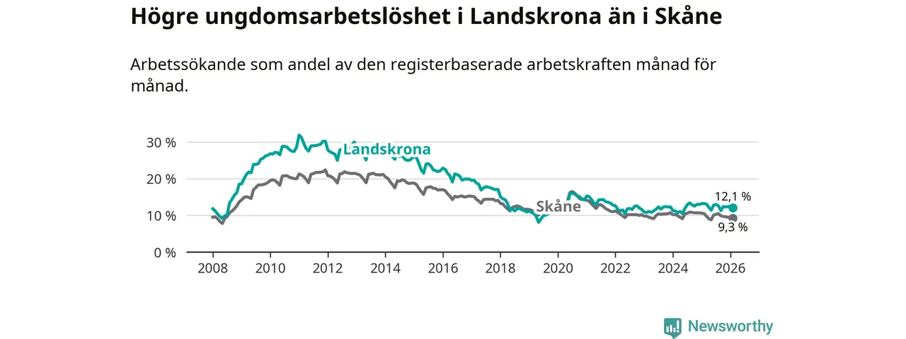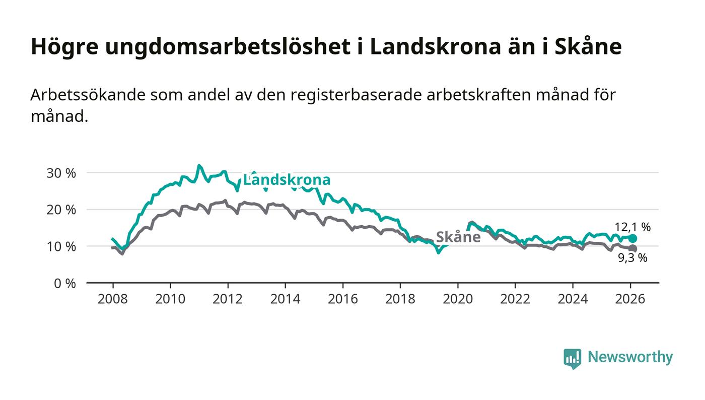 I och med den senaste månadens nedgång har de ungas arbetslöshet i Landskrona sjunkit sju månader i följd (ner från 13,0 procent i juli 2025 till 12,1 procent nu).