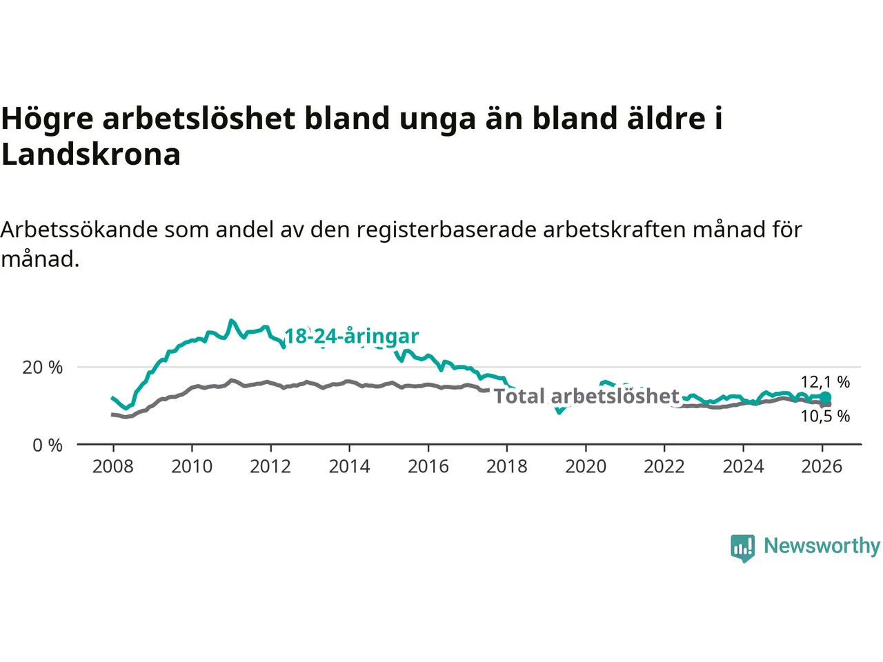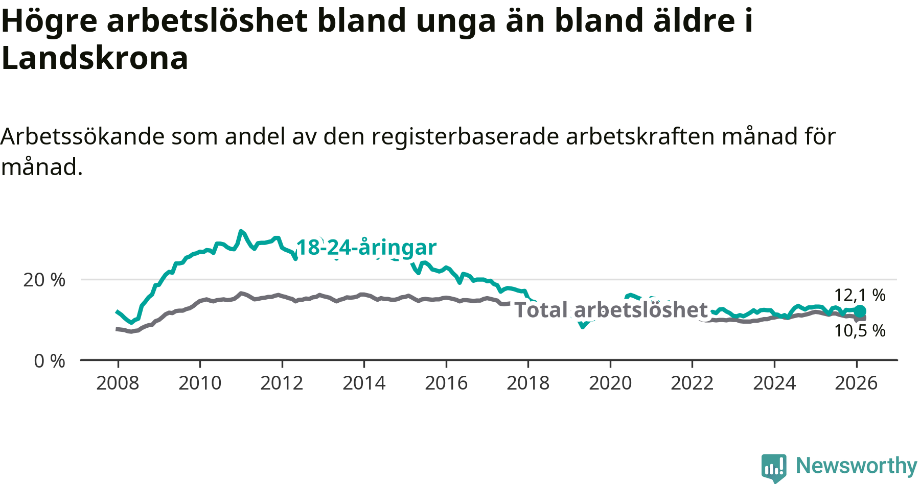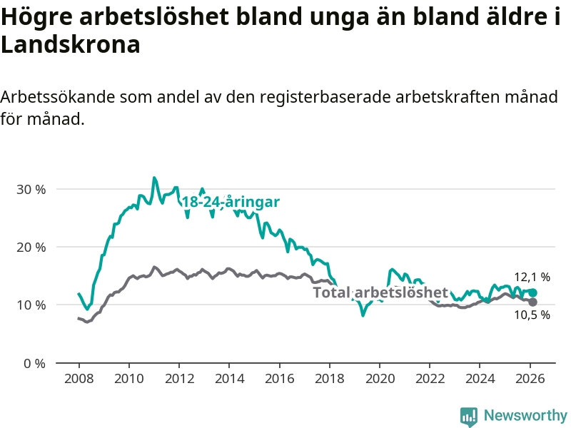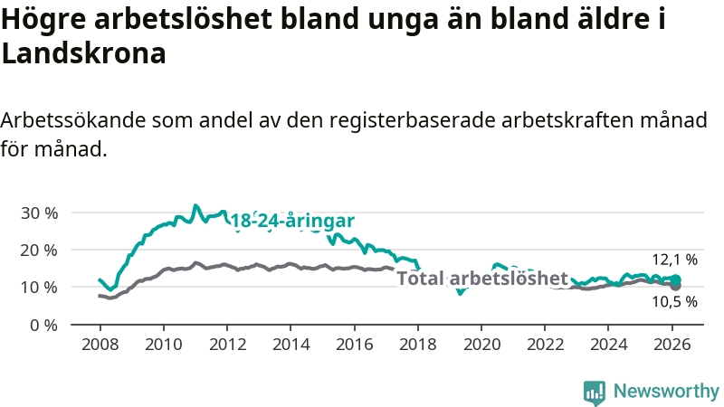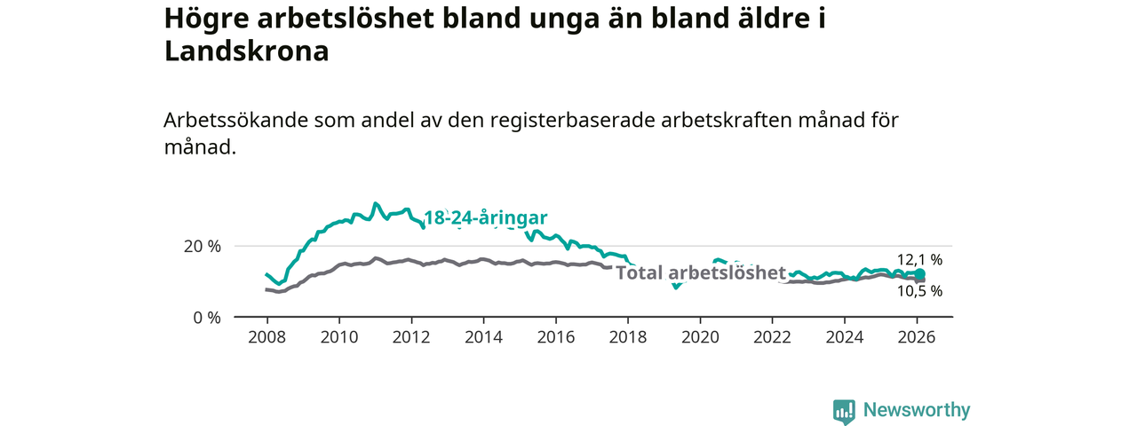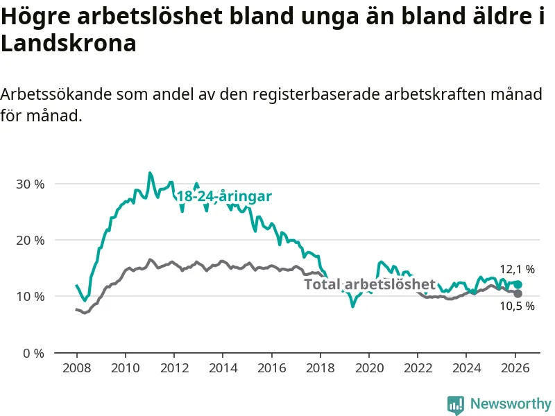 I och med den senaste månadens nedgång har de ungas arbetslöshet i Landskrona sjunkit sju månader i följd (ner från 13,0 procent i juli 2025 till 12,1 procent nu).