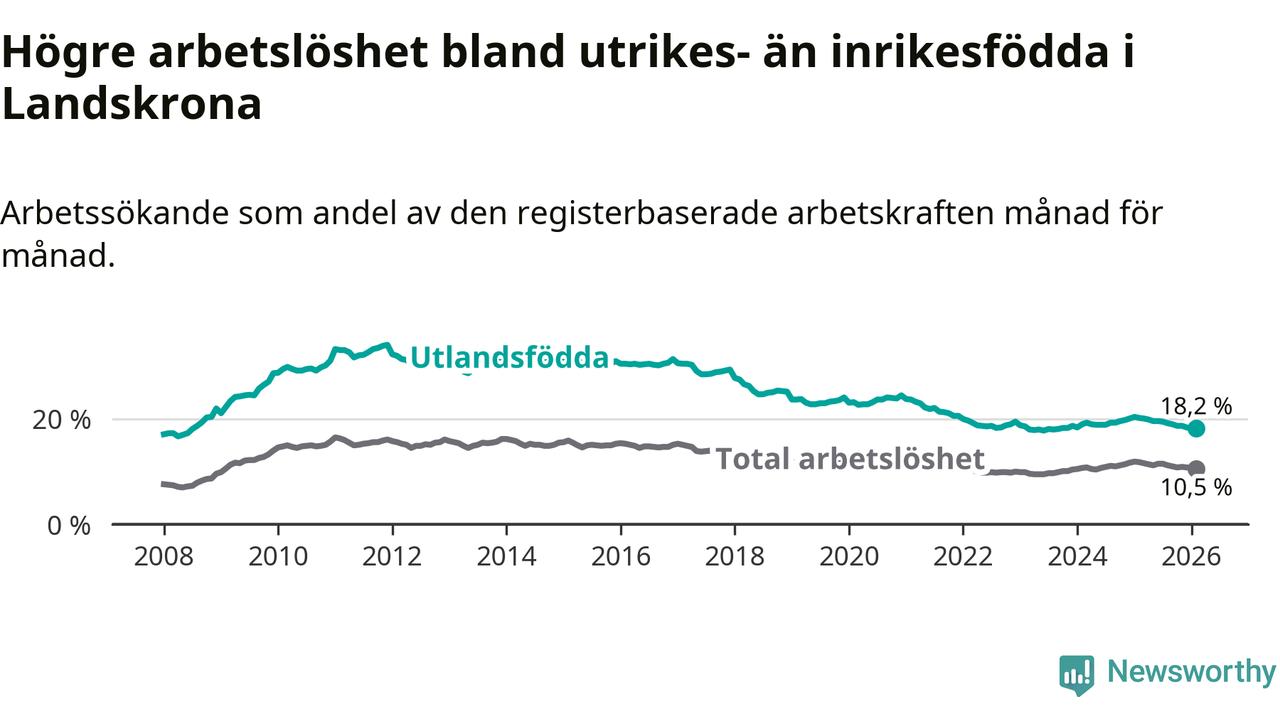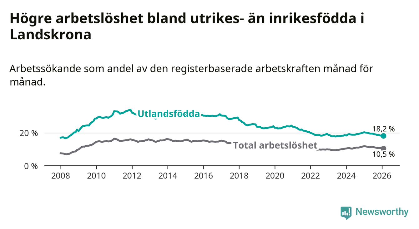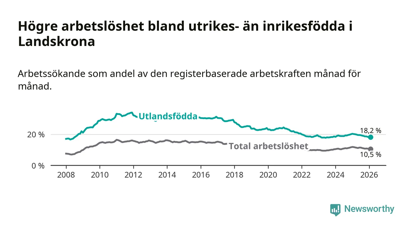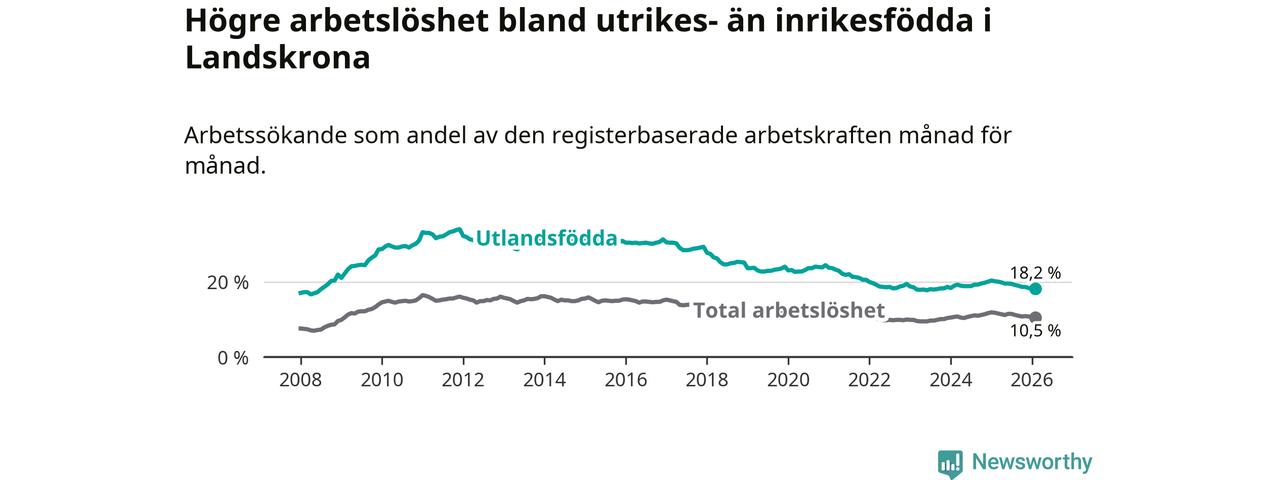 Arbetslösheten bland utlandsfödda var 18,2 procent i Landskrona under februari månad, motsvarande 1 390 av 7 637 personer. Det är 2,0 procentenheter färre än vid samma tidpunkt i fjol (−128 om man räknar personer). Därmed är de utlandsföddas arbetslöshet lägre än vid samma tidpunkt i fjol för sjunde månaden i följd. Sedan juli 2025 har arbetslösheten bland utlandsfödda minskat från 19,5 till 18,2 procent.