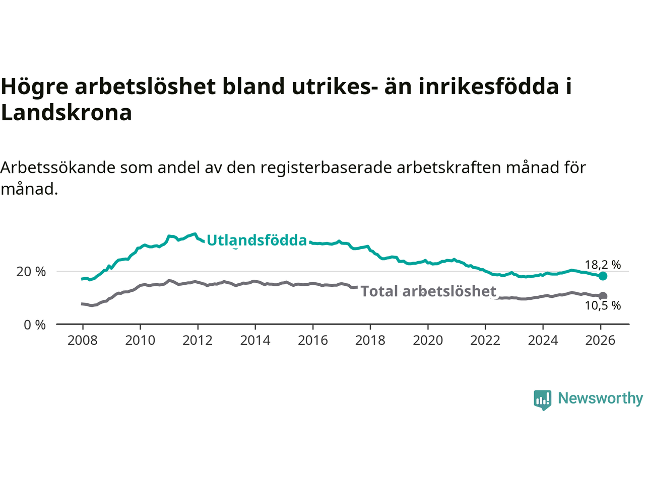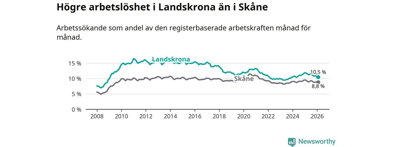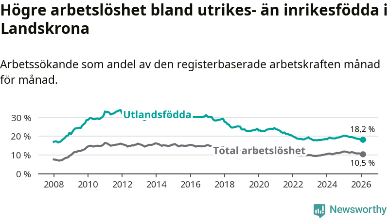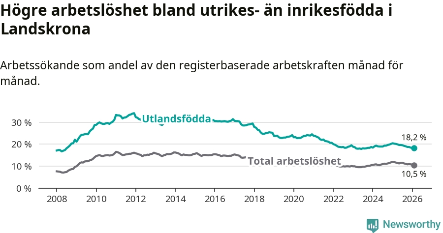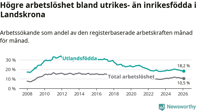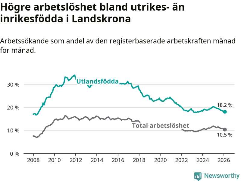 Arbetslösheten bland utlandsfödda var 18,2 procent i Landskrona under februari månad, motsvarande 1 390 av 7 637 personer. Det är 2,0 procentenheter färre än vid samma tidpunkt i fjol (−128 om man räknar personer). Därmed är de utlandsföddas arbetslöshet lägre än vid samma tidpunkt i fjol för sjunde månaden i följd. Sedan juli 2025 har arbetslösheten bland utlandsfödda minskat från 19,5 till 18,2 procent.