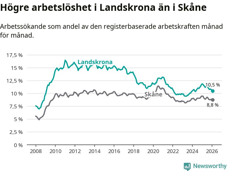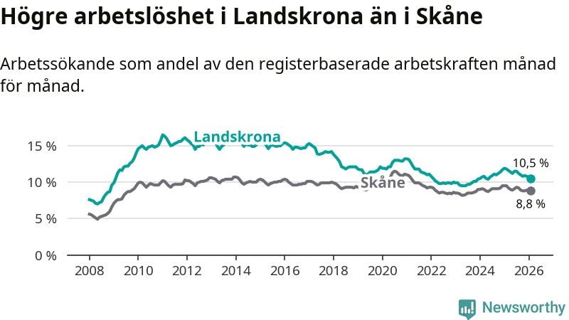 Perstorp är den kommun som har högst arbetslöshet just nu (13,2 procent) i landet som helhet, medan Sorsele har den lägsta (2,2 procent). Landskronas arbetslöshet sticker ut som den åttonde högsta i hela landet.