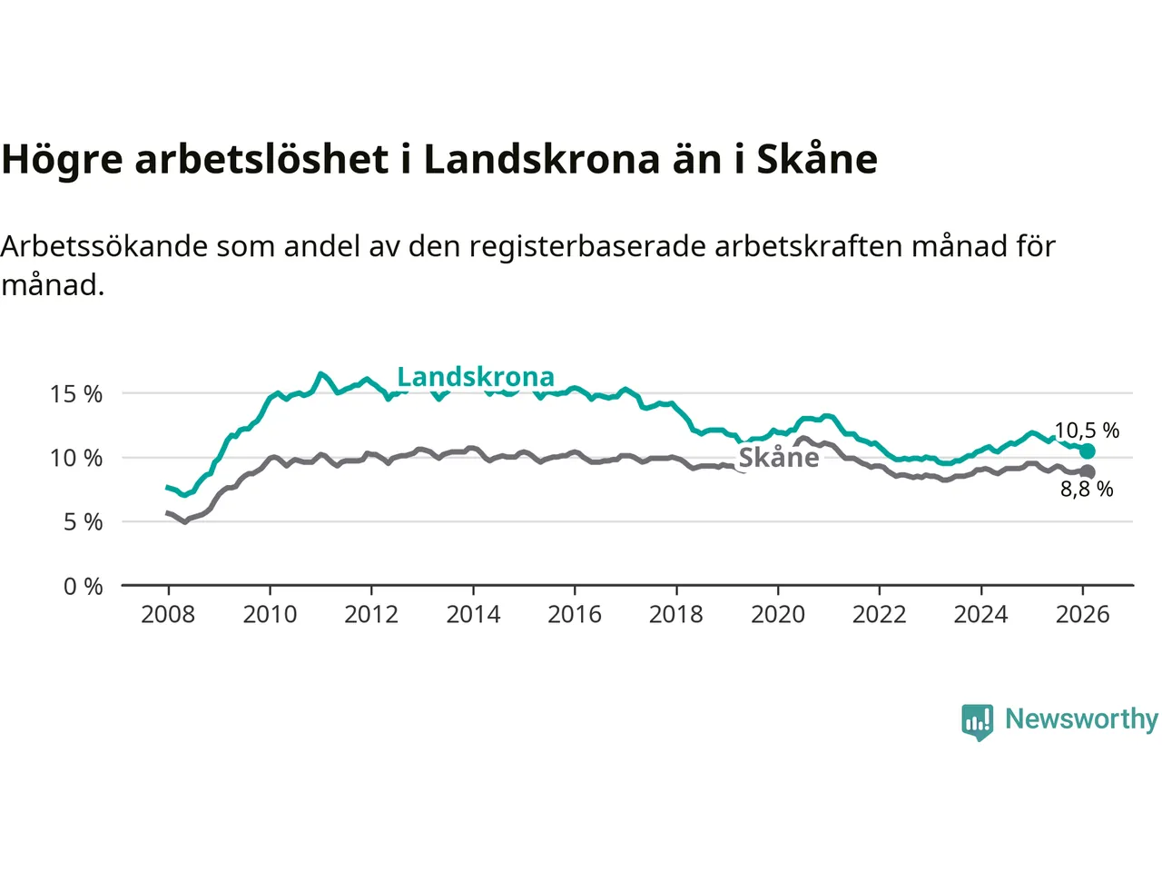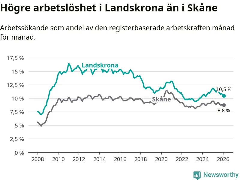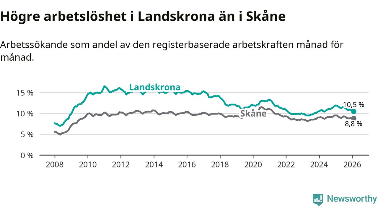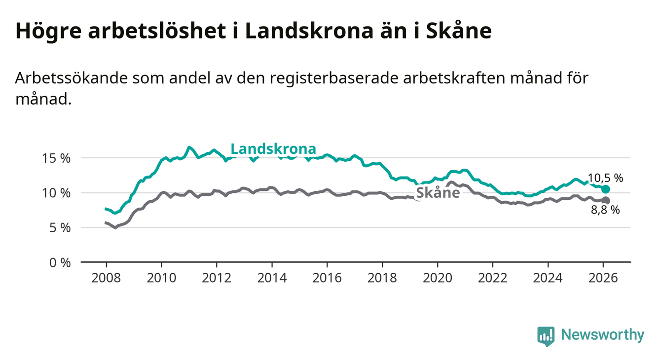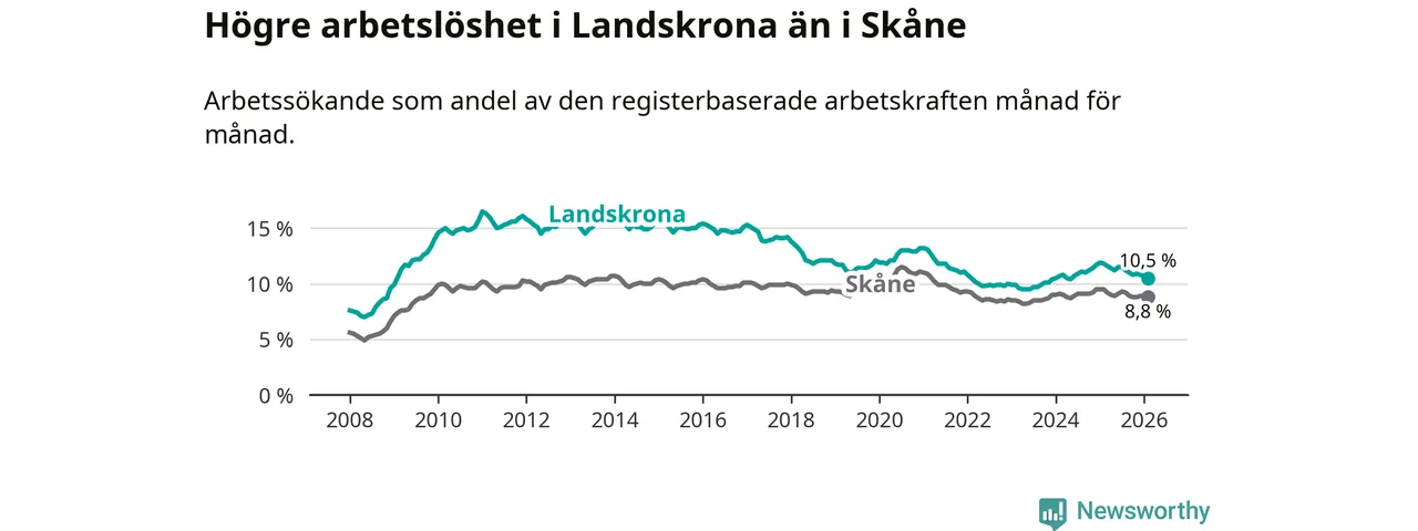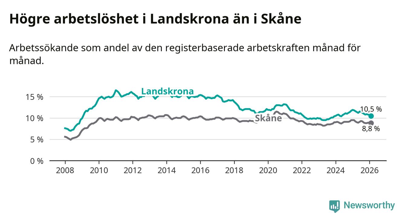 Under februari månad rapporterade Landskrona kommun en total arbetslöshet på 10,5 procent. Det är en minskning jämfört med samma tidpunkt i fjol (−1,3 procentenheter). Även i Skåne län sjunker arbetslösheten .