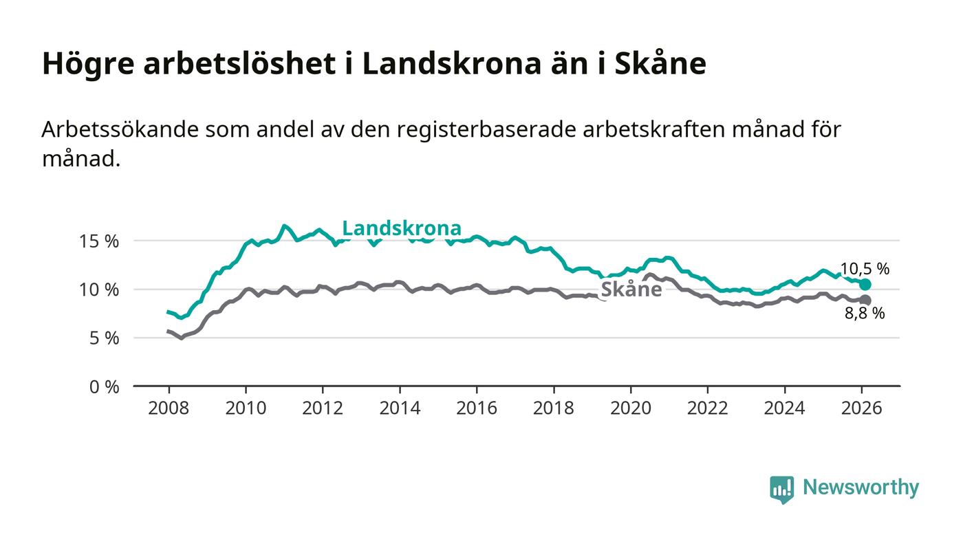 Även om arbetslösheten i Landskrona alltså minskar, så ligger den fortfarande över snittet i hela Skåne län (10,5 procent i kommunen, jämfört med 8,8 procent i hela länet). Lomma har den lägsta arbetslösheten i länet (3,8 procent), medan Perstorp har den högsta (13,2 procent). För att Landskrona skulle komma ner i samma arbetslöshetsnivå som Lomma skulle 1 535 personer behöva sysselsättas.
