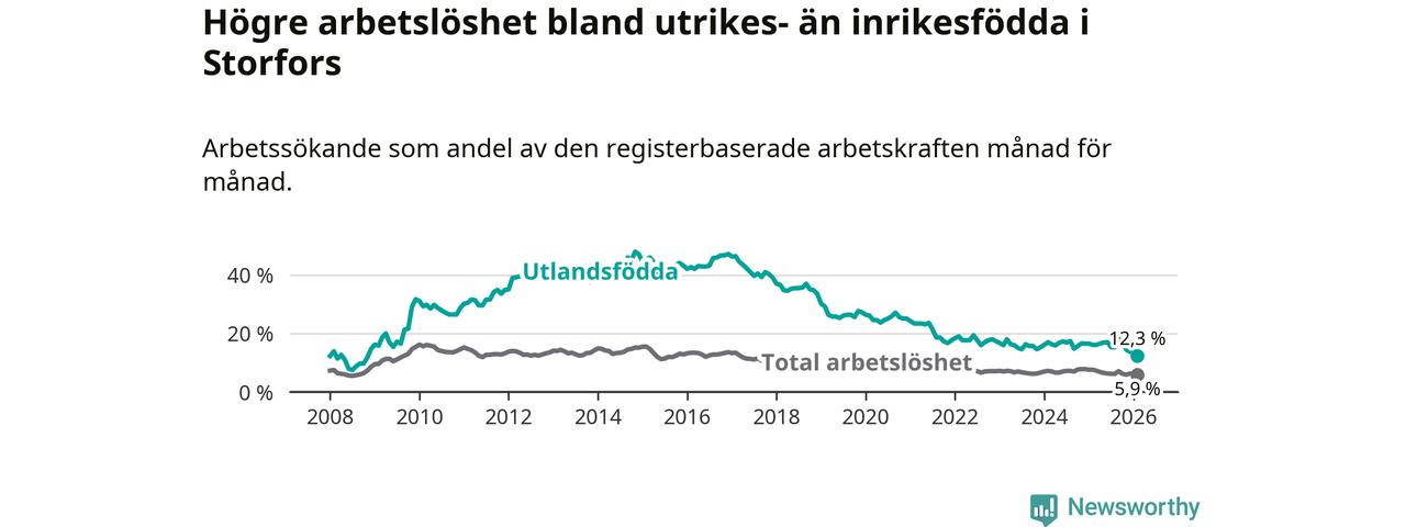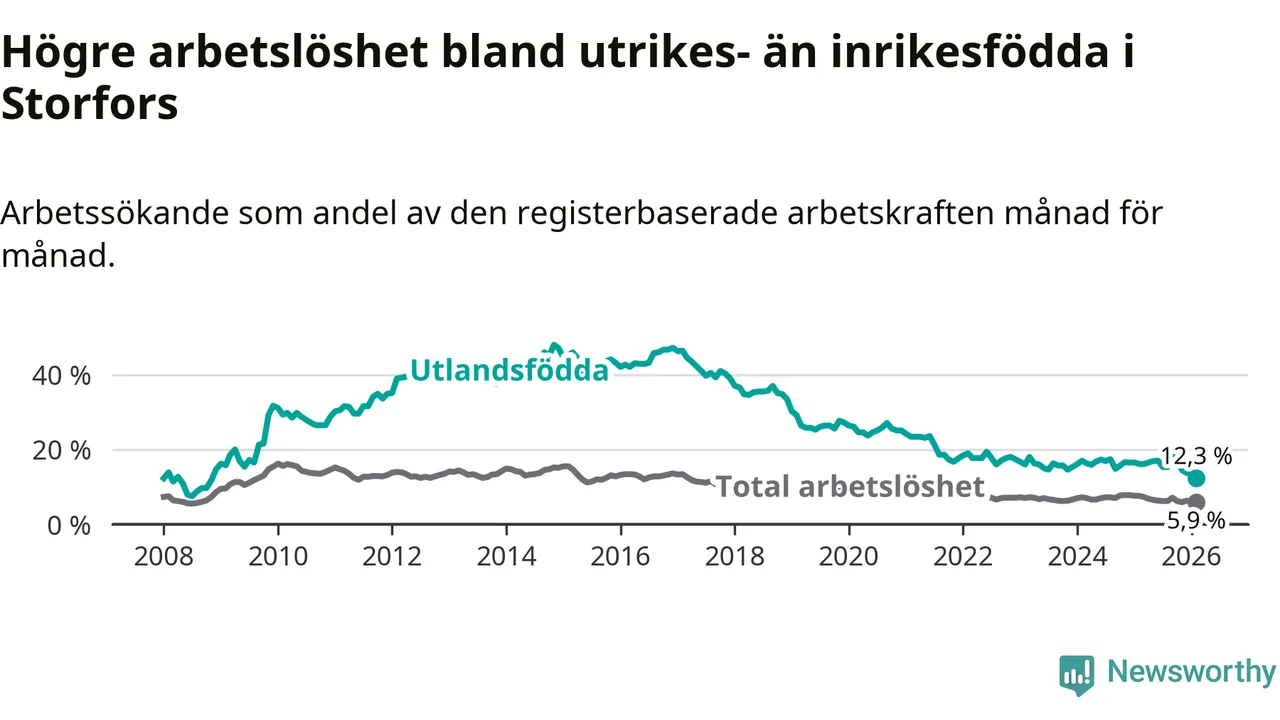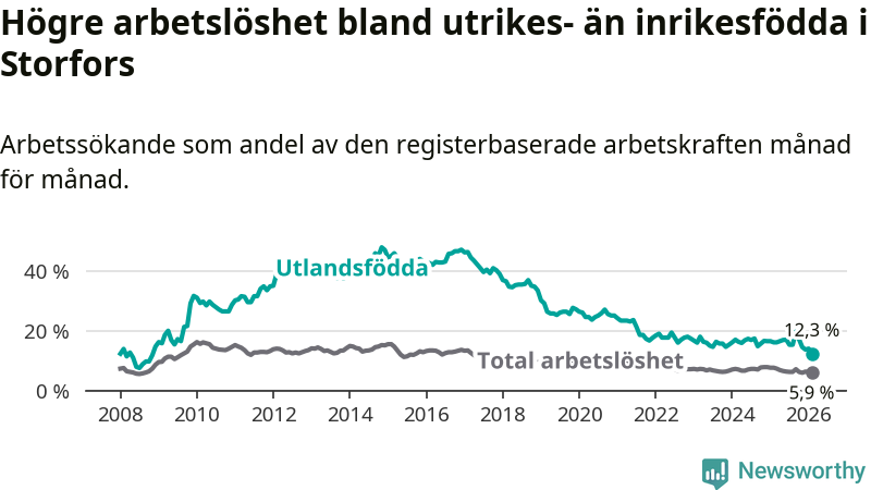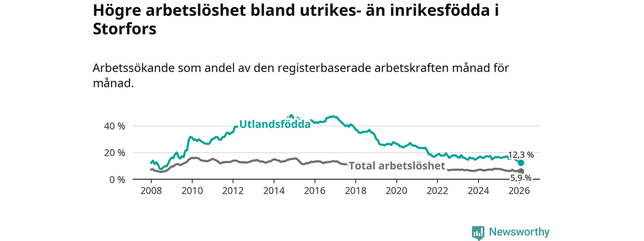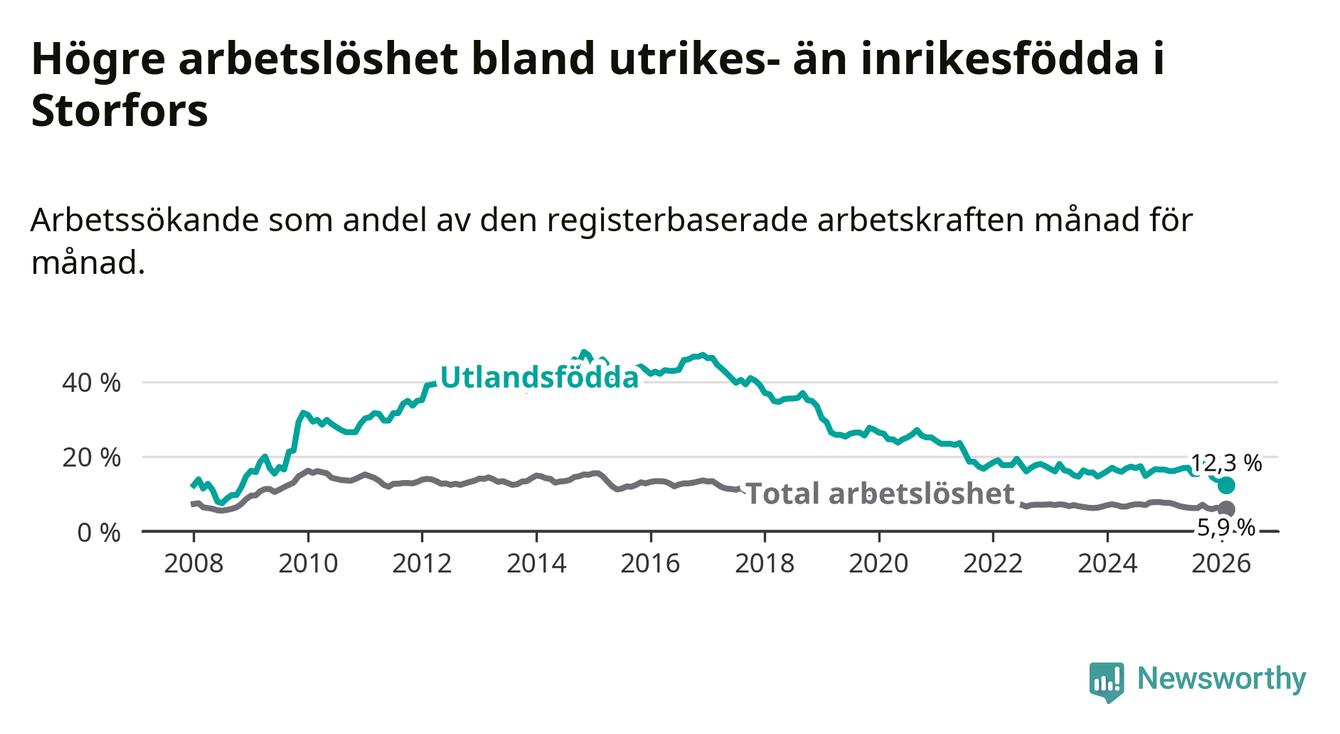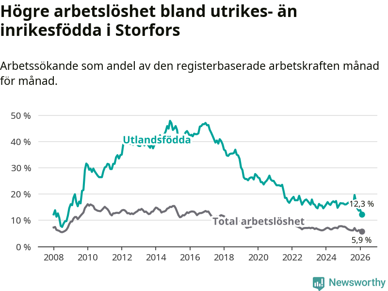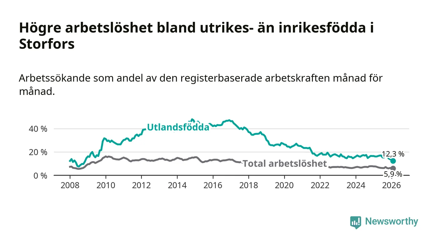 Skillnaden i arbetslöshet mellan utrikesfödda och hela befolkningen är 6,4 procentenheter i Storfors. Det är en betydligt mindre skillnad än för ett år sedan (−2,1 procentenheter).