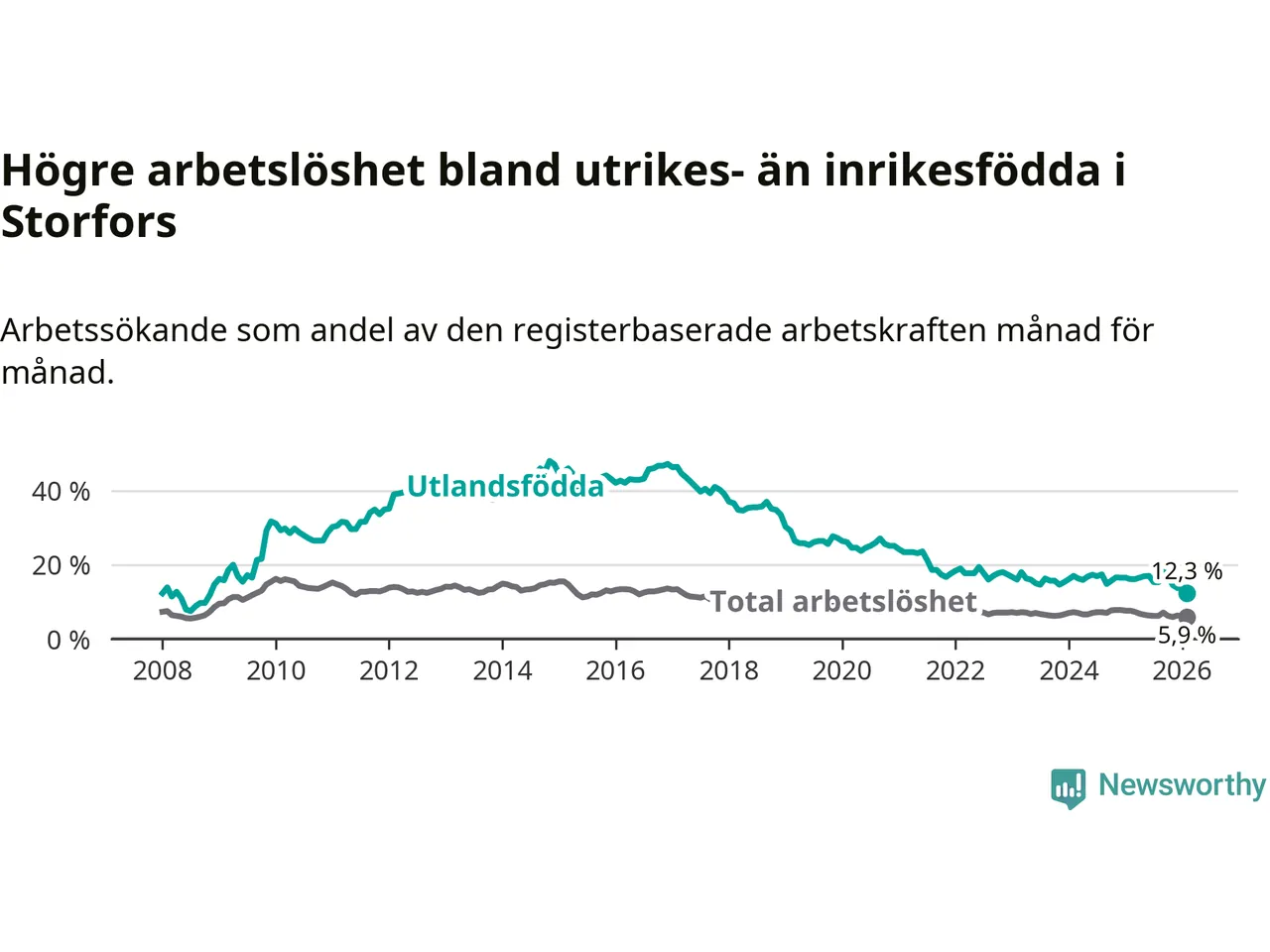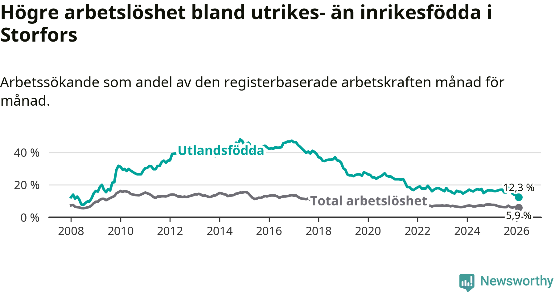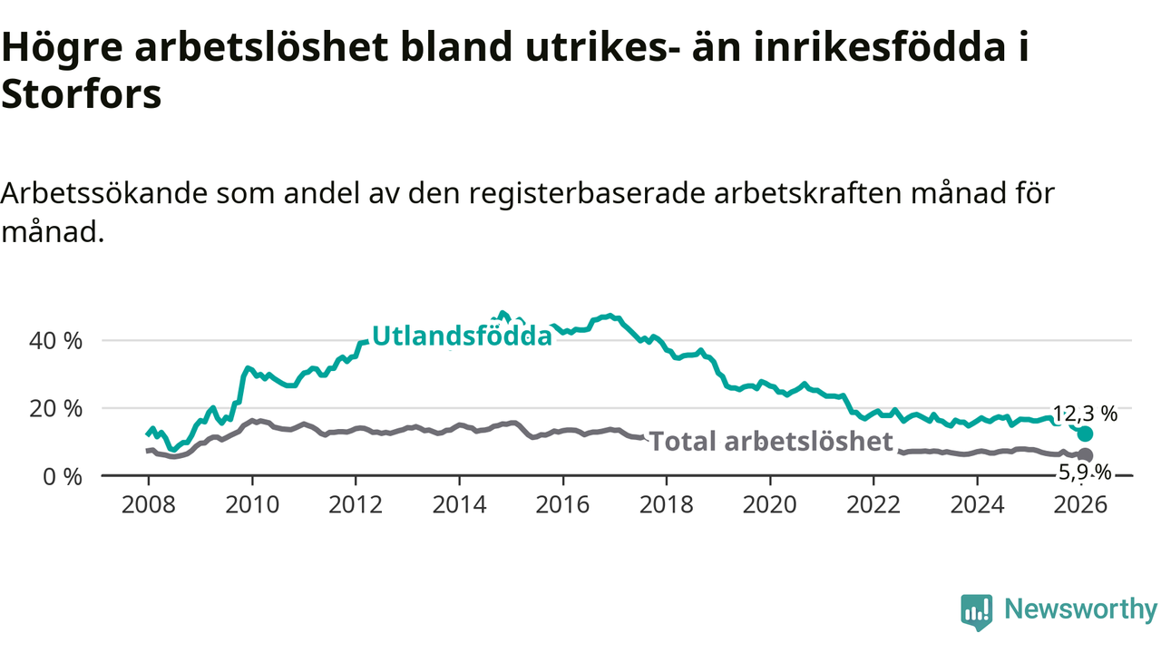 | Bland utlandsfödda | 12,3 % | −3,8 % ▼ | 14,1 % | −1,9 % ▼ | 14,3 % | −1,4 % ▼ |