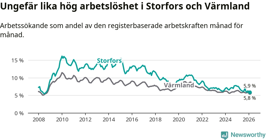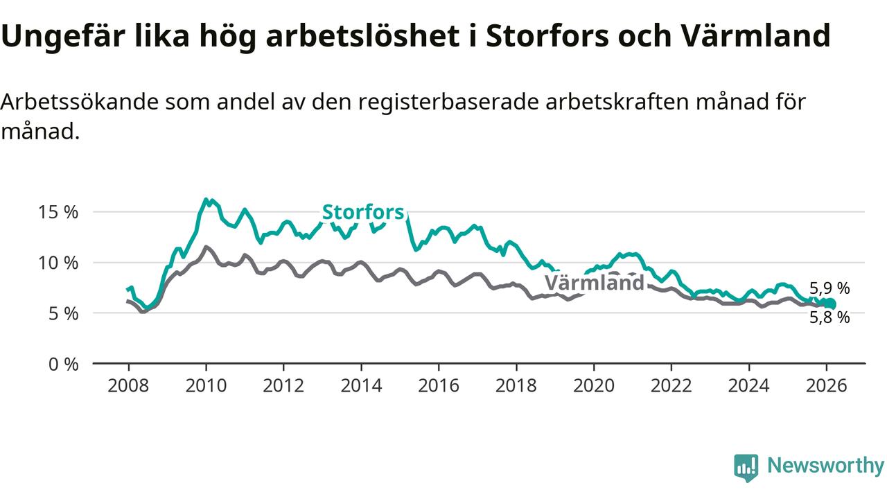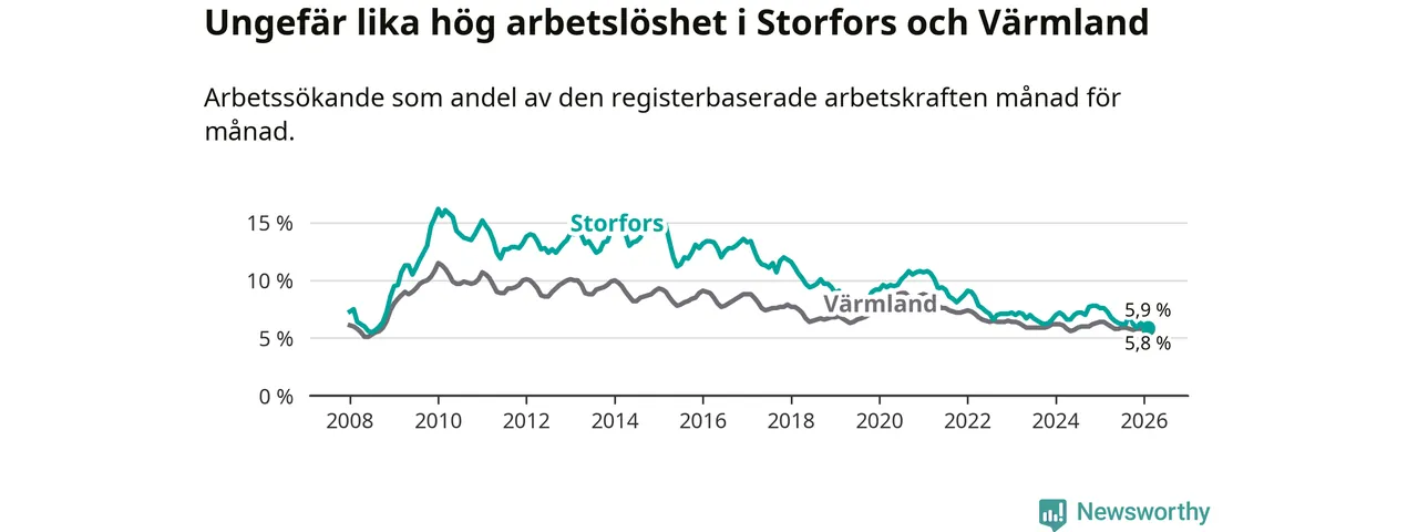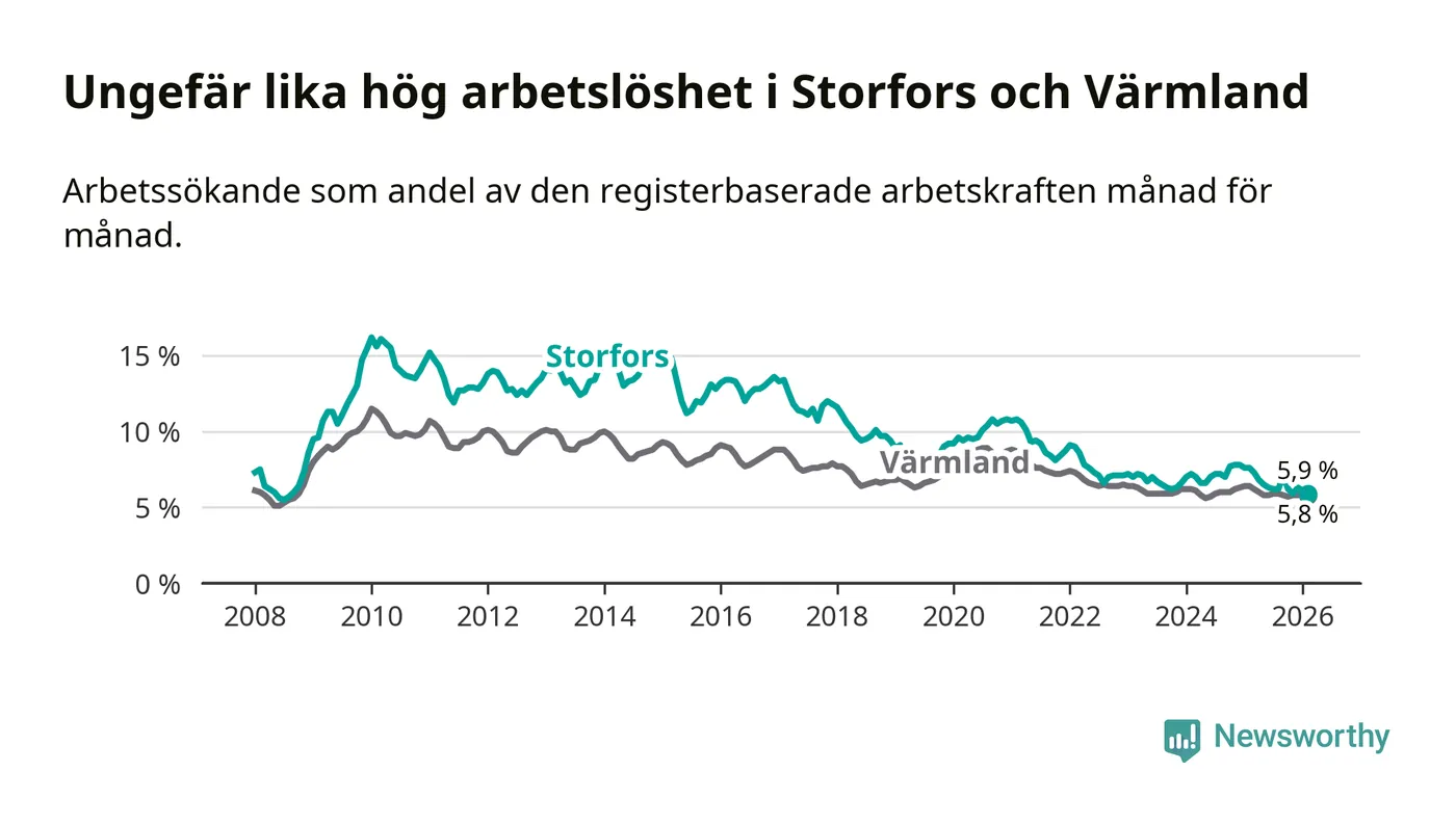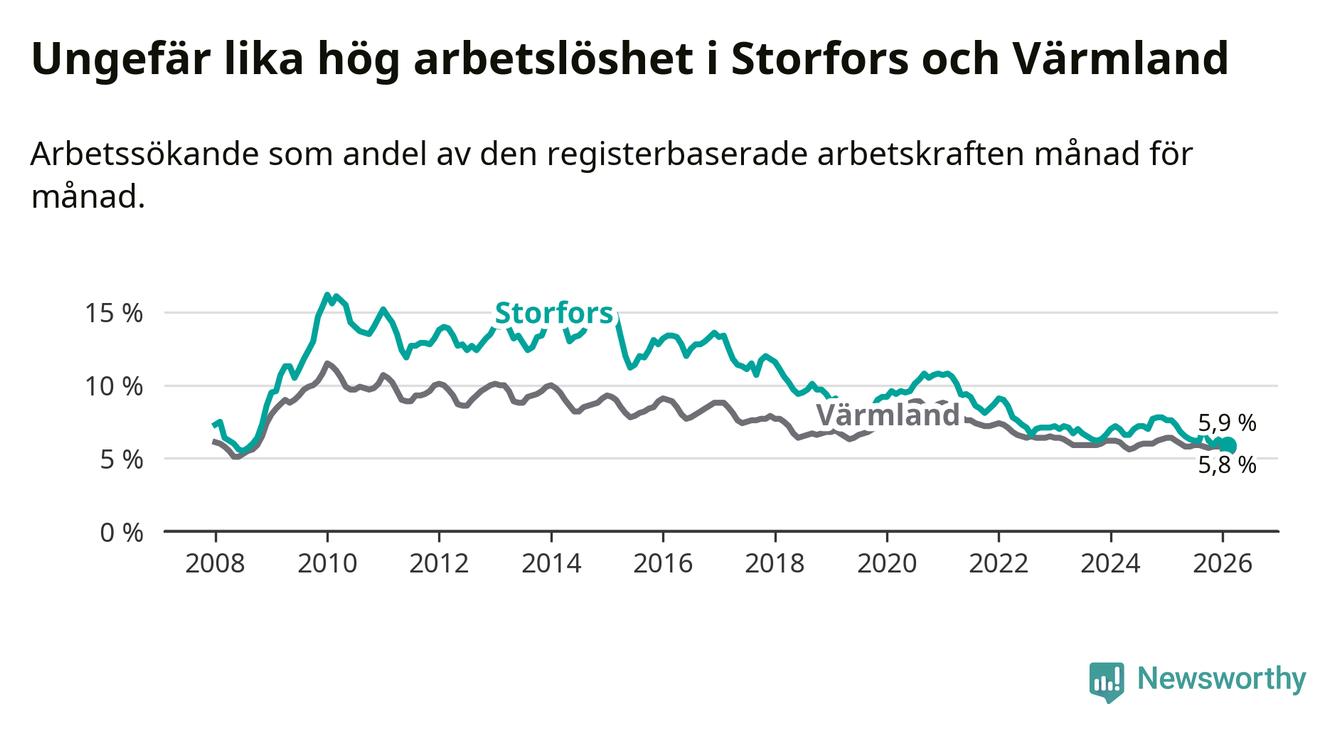 Under februari månad rapporterade Storfors kommun en total arbetslöshet på 5,9 procent. Det är en minskning jämfört med samma tidpunkt i fjol (−1,7 procentenheter). Även i Värmlands län sjunker arbetslösheten .