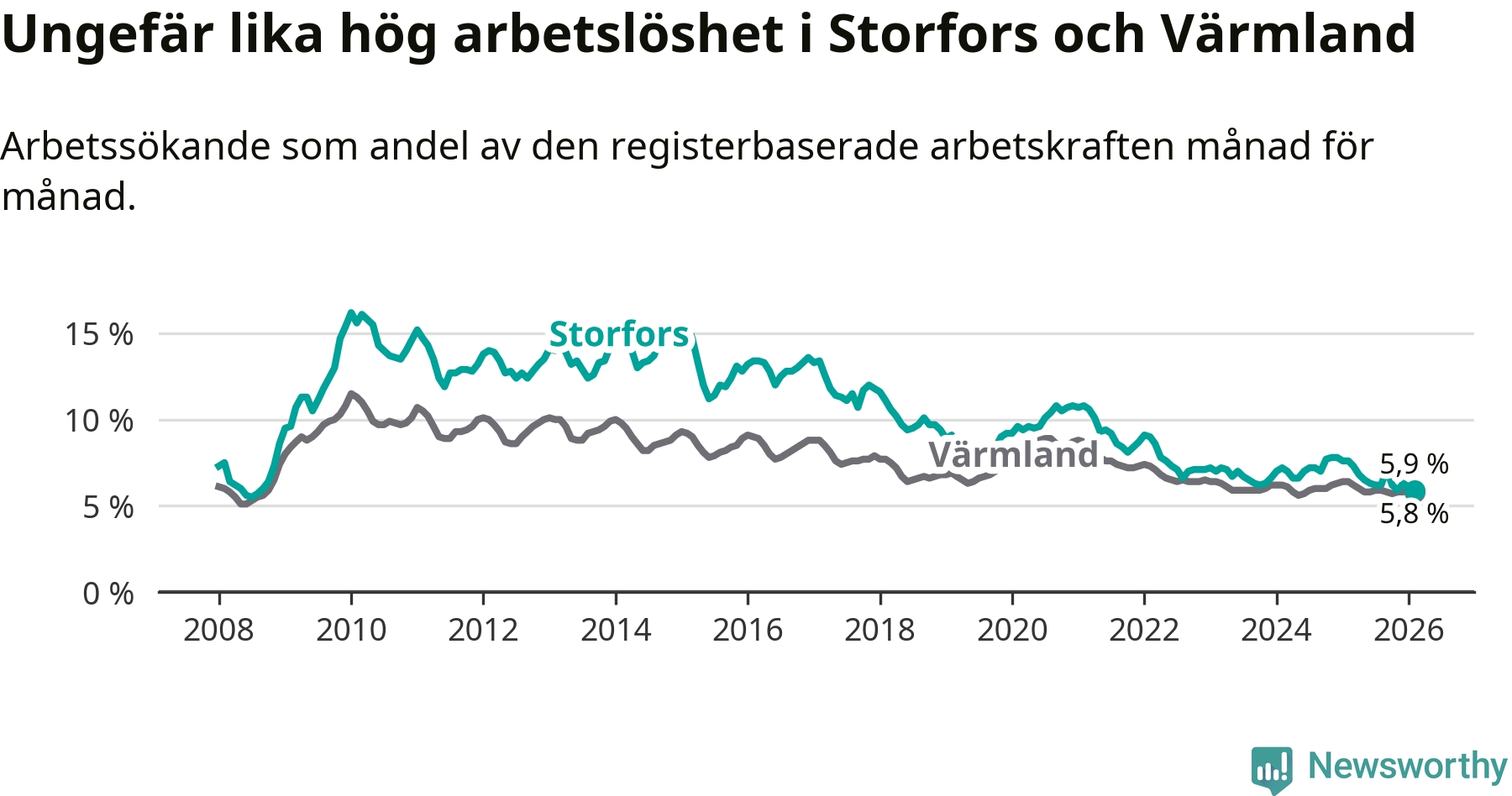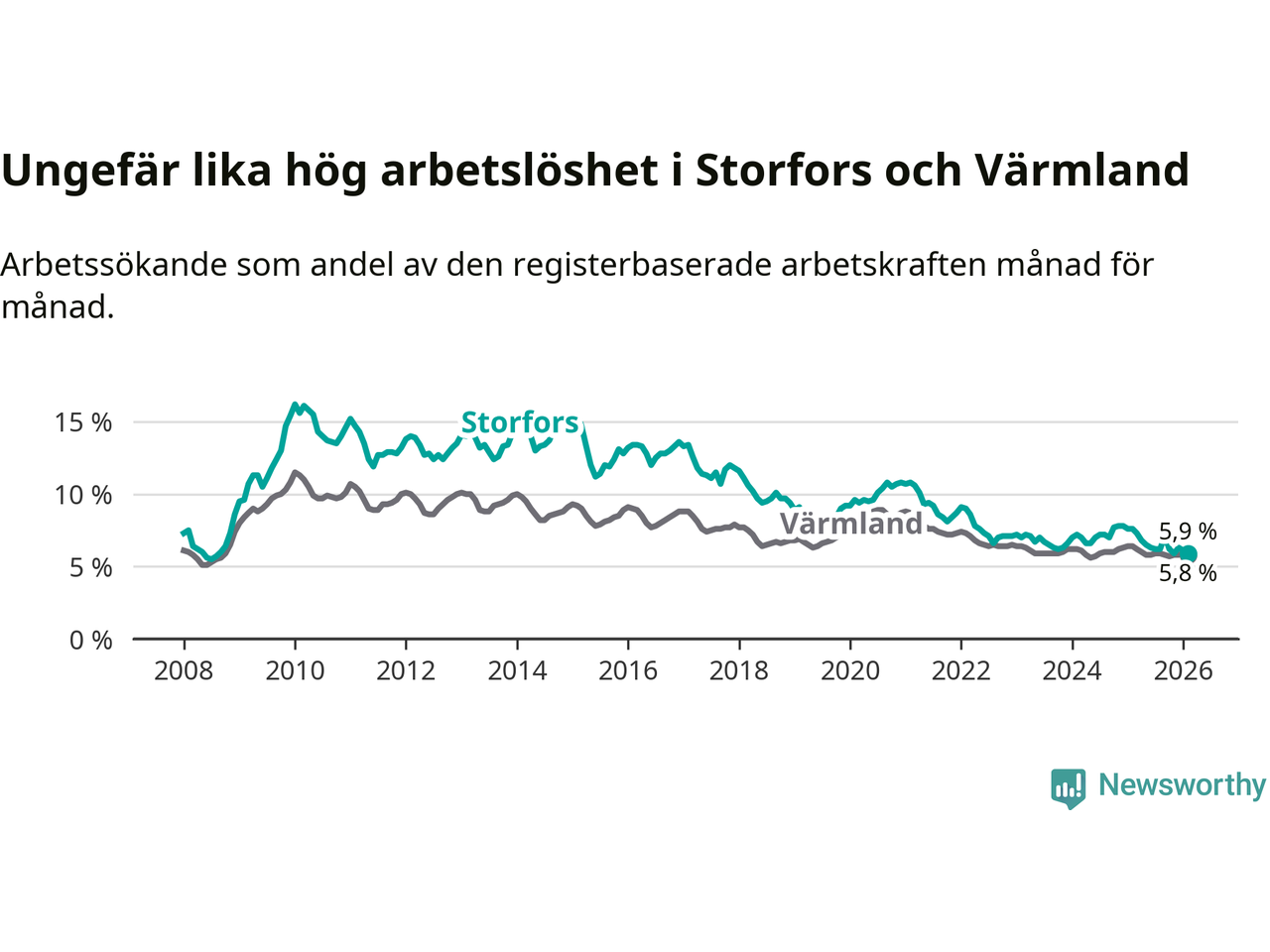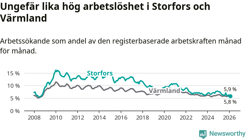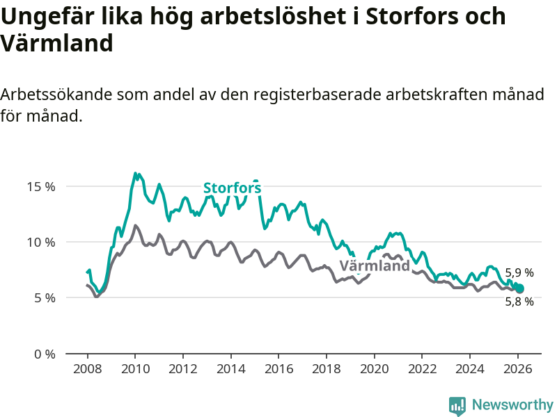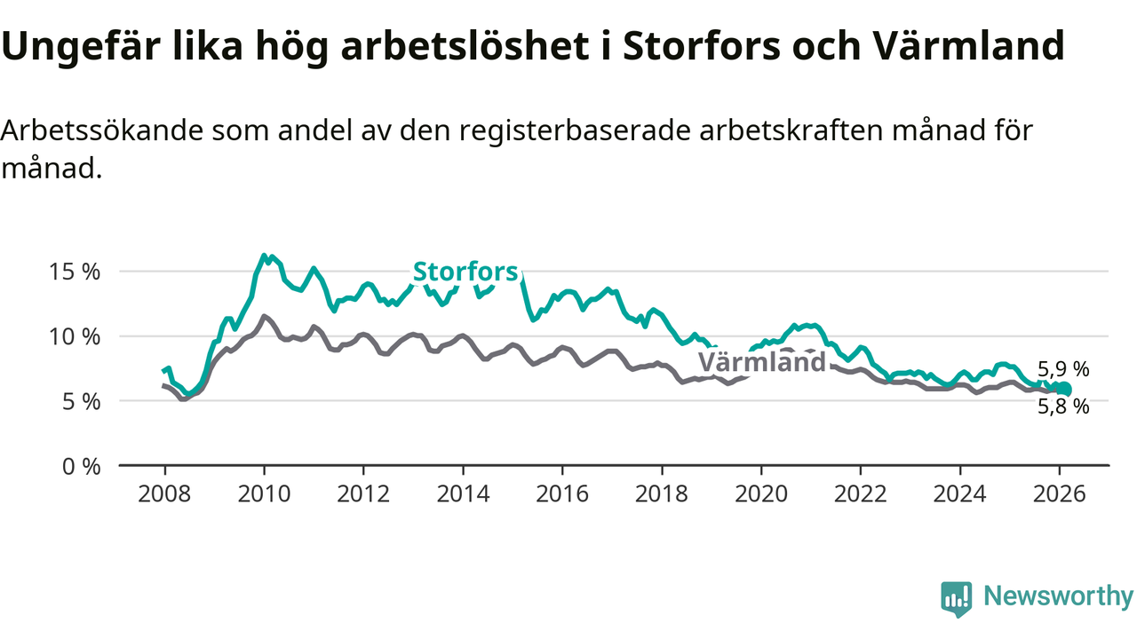 Under februari månad rapporterade Storfors kommun en total arbetslöshet på 5,9 procent. Det är en minskning jämfört med samma tidpunkt i fjol (−1,7 procentenheter). Även i Värmlands län sjunker arbetslösheten .