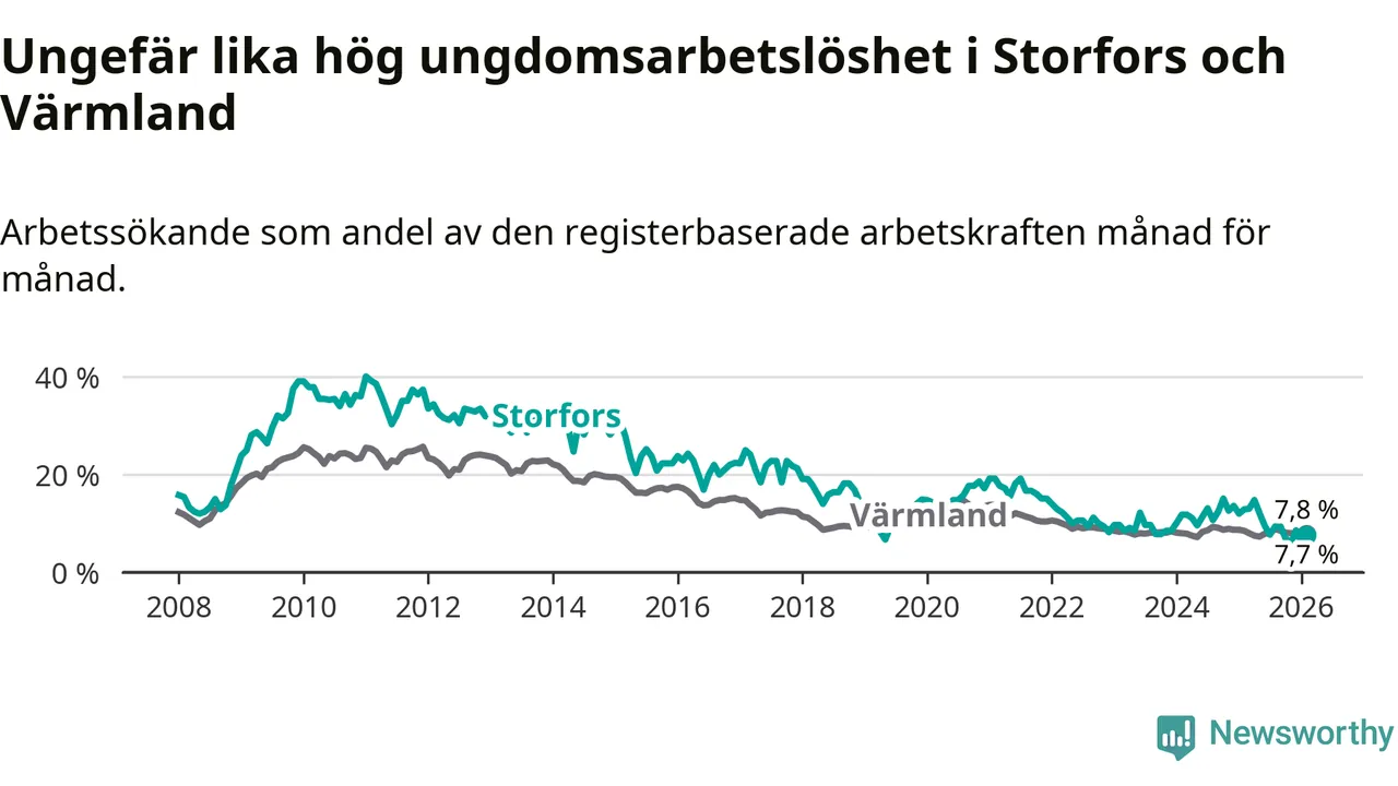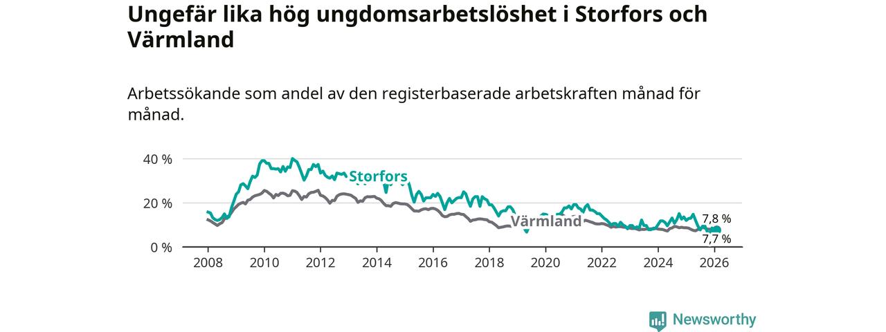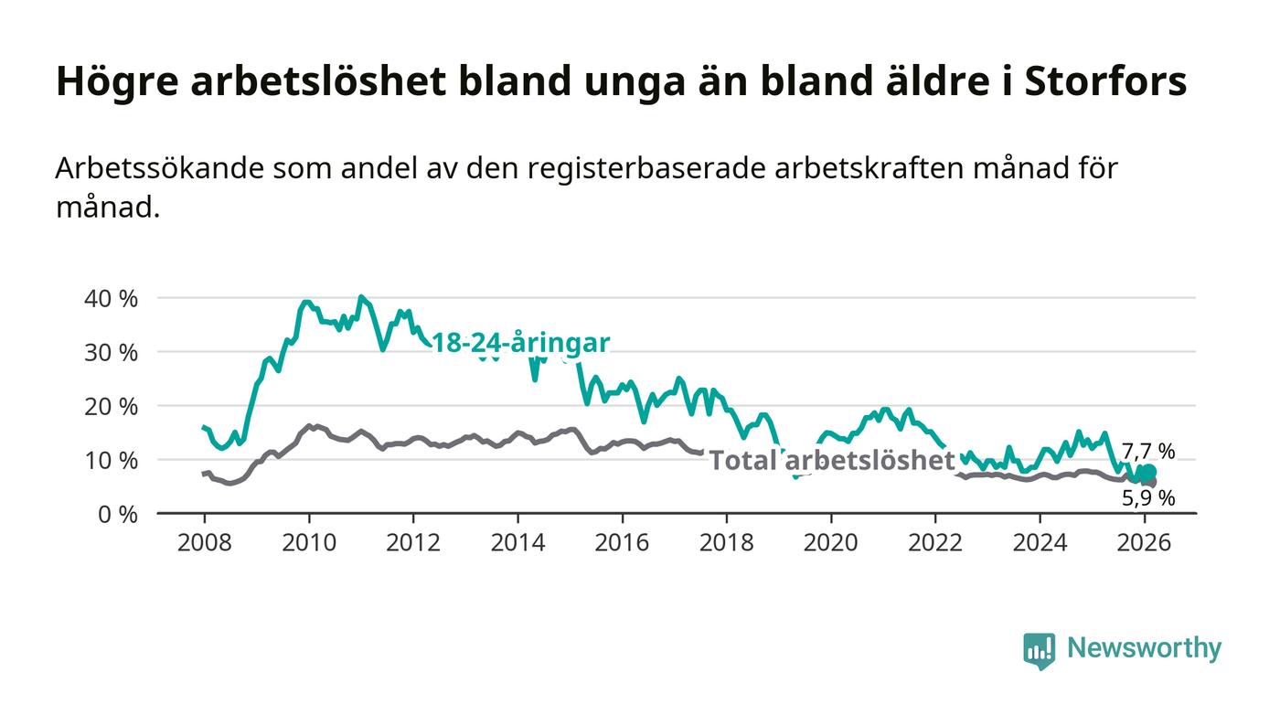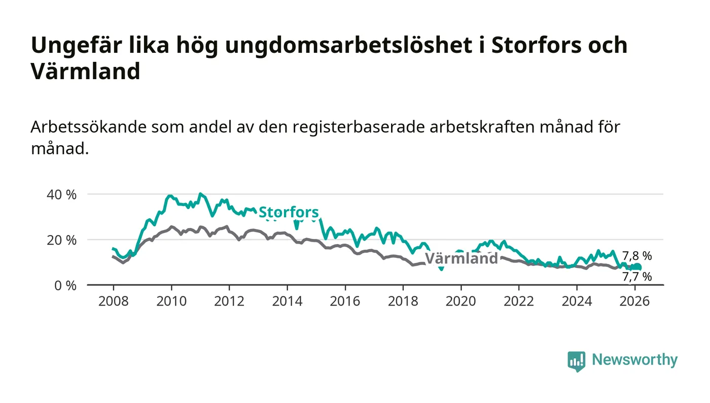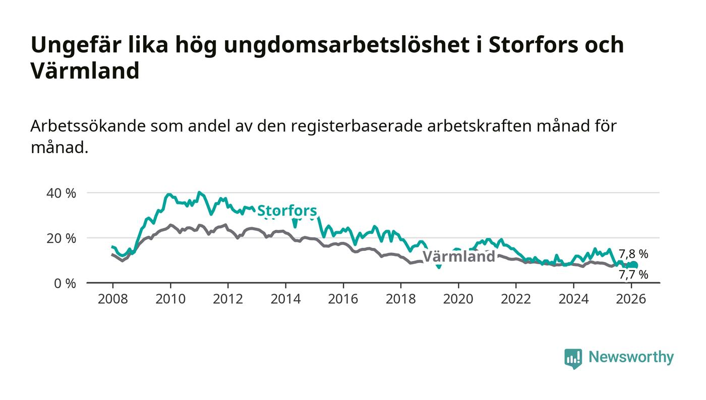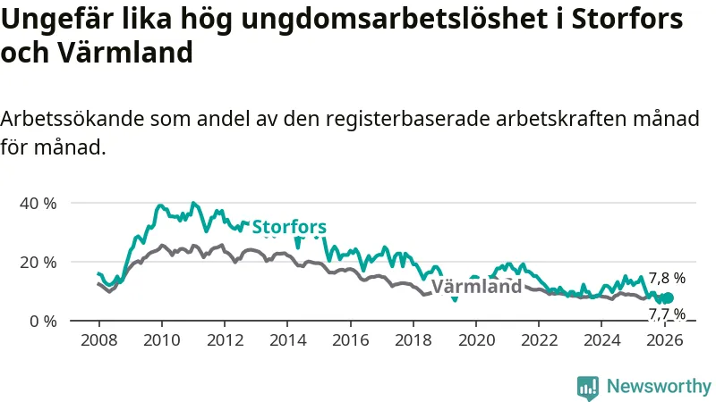 I och med den senaste månadens nedgång har de ungas arbetslöshet i Storfors sjunkit nio månader i följd (ner från 12,1 procent i maj 2025 till 7,7 procent nu).