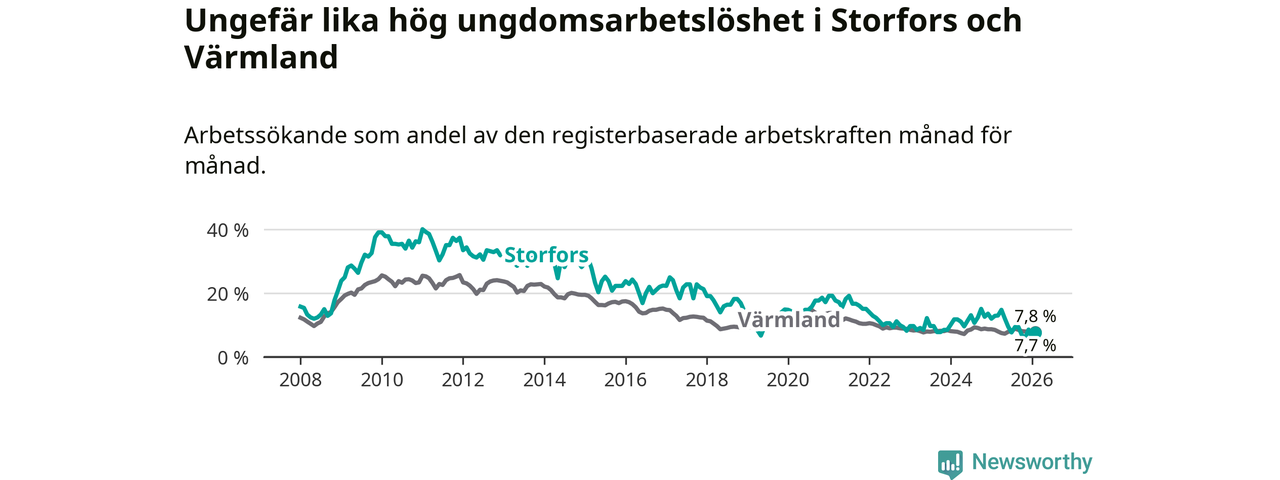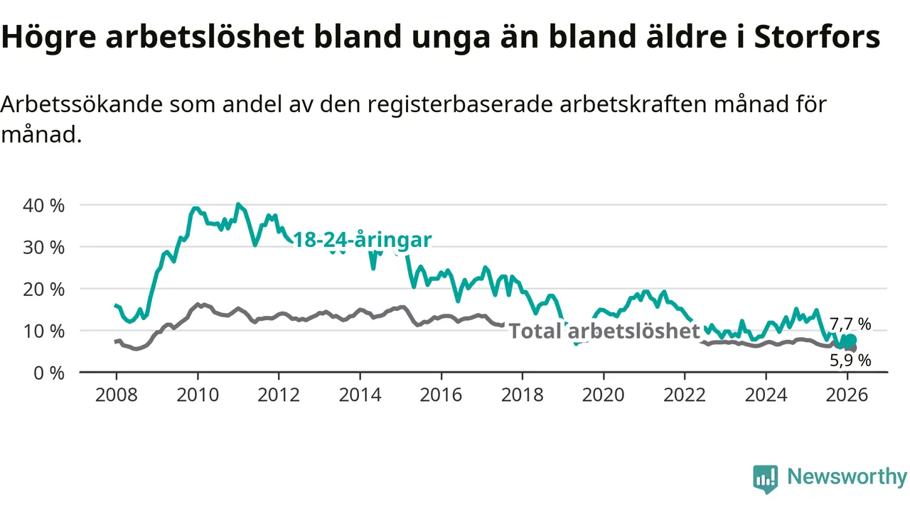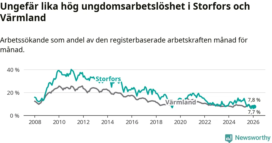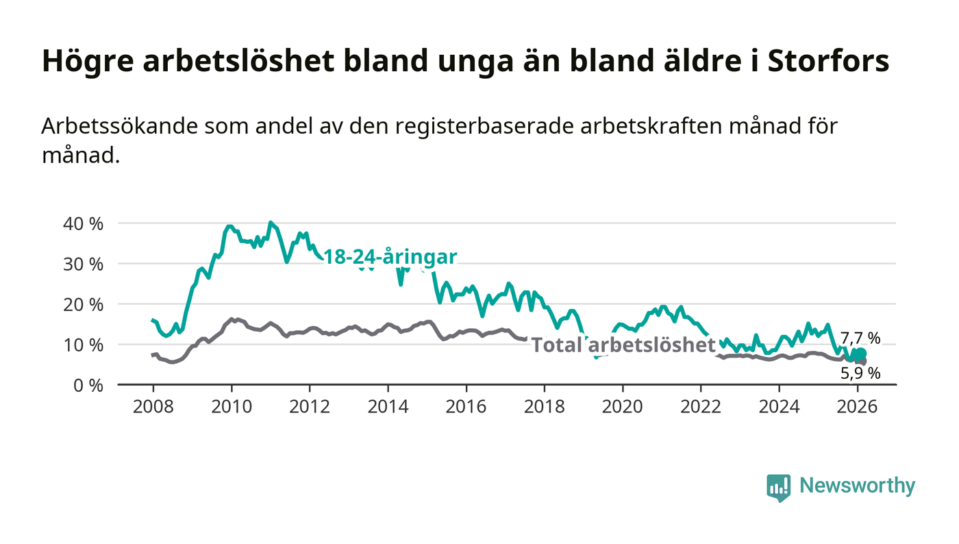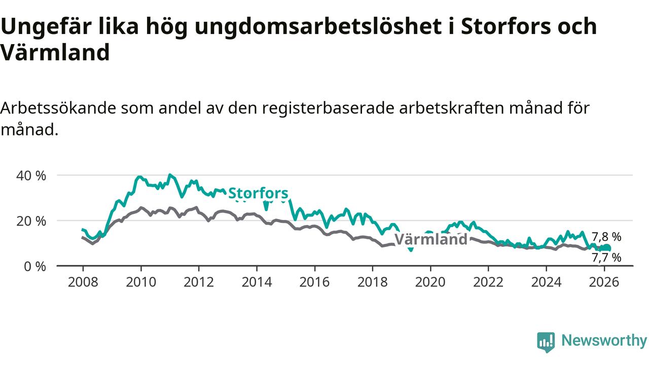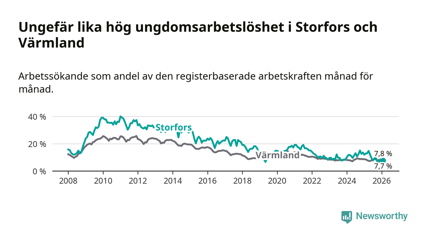 I och med den senaste månadens nedgång har de ungas arbetslöshet i Storfors sjunkit nio månader i följd (ner från 12,1 procent i maj 2025 till 7,7 procent nu).